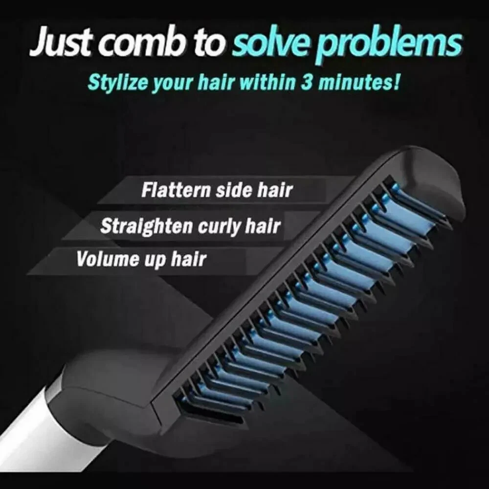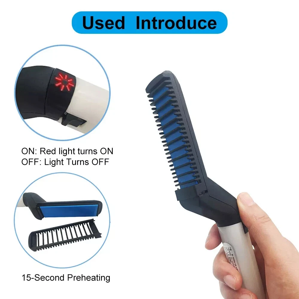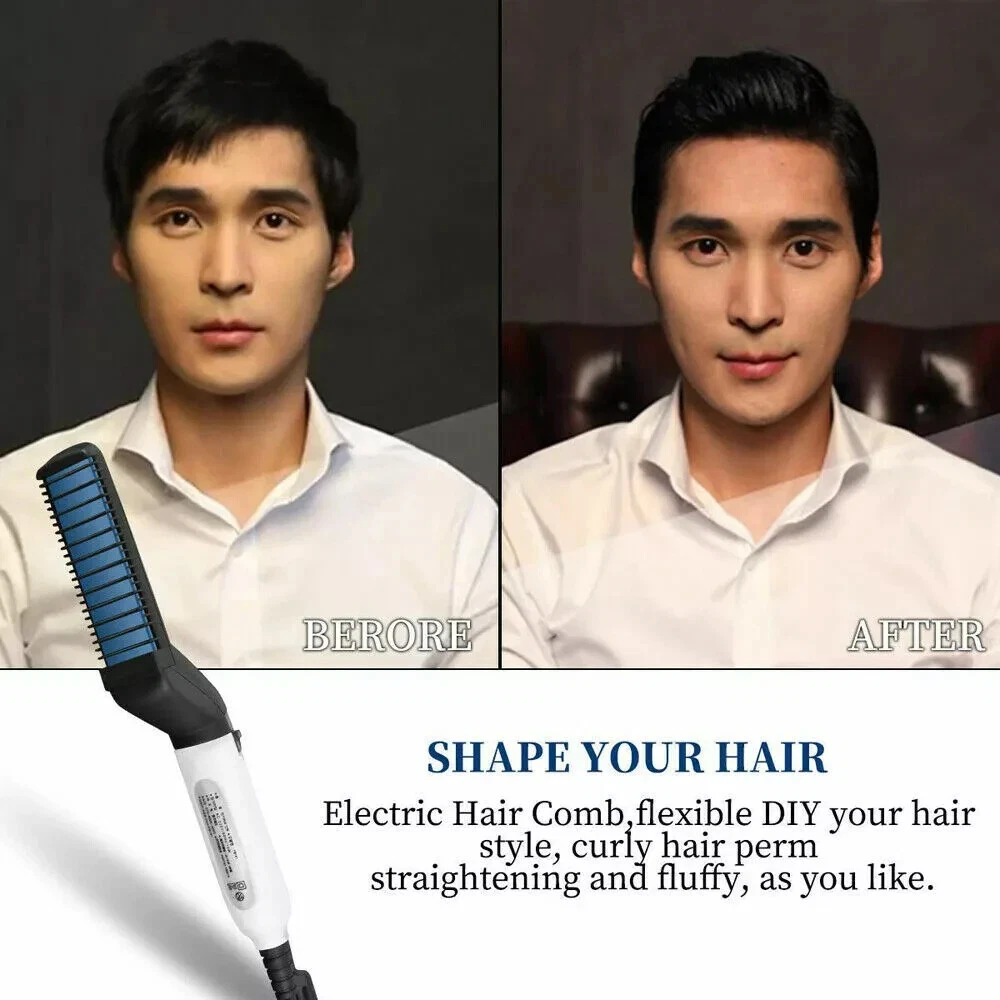 Hair Straightener For Men Multifunctional Curling Electric Brush Beard Comb US 100% brand new and high-quality made. Volumize hair, flatten side hair & straighten curly hair. This multi-functional hair styling brush combines heating barrels and comb teeth for hair smoothing, straightening, curling and creating beautiful volumes, meets your dialy needs for different hair styles. The comb acts as a protective cover against the heating plate to prevent hair from over-burning, comes with innovative 3D anti-scaled encircled protection design. Simply comb to fix your messy hair, straighten curly hair, style your hair in minutes, smooth side hair, reduce hair loss and untie. Preheats within 15 seconds, ceramic coating negative ion barrels and comb teeth protect your hair and seals in moisture for natural shine. Comfortable to grip on. This hair comb can promotes blood circulation when in use, the blood cells will rejuvenate skin and hair cells which reduces dandruff, which also makes your hair look healthier and stronger. Package Includes: 1x Hair Straightener Comb