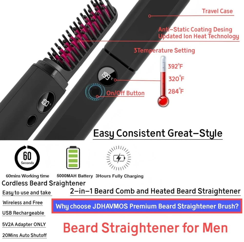 Beard Straightener for Men, Heated Beard Brush, Cordless Beard Hot Comb for Medium to Long Beards, with Travel Case, Rechargeable, 3 Temp Settings, Ionic Technology, Grooming Gift for Men(Black) Product Details Brand: JDHAVMOS Color: Black Material: Aluminum, Iron, Plastic Power Source: Battery Powered Included Components: Comb Product Dimensions : 8.86 x 1.38 x 1.18 inches; 6.38 ounces Batteries : 1 9V batteries required. (included) Date First Available : December 20, 2024 Manufacturer : JDHAVMOS Best Sellers Rank: #257,524 in Beauty & Personal Care (See Top 100 in Beauty & Personal Care) #330 in Beard & Mustache Combs #330 in Beard & Mustache Combs Customer Reviews: 4.4 4.4 out of 5 stars 27 ratings Gifts for Men with BeardsThis beard straightener brush is specially designed for facial beards and is ideal for beard styling.Beard Straightener for Men, Grooming for Frizz-Free & Split-Ends. Negative Ion Heated Beard Comb This beard straightening brush combines advanced ion conditioning and an anti-static coating, making facial hair combing smoother, reducing tangles and frizz, with quick and long-lasting effects. It makes your beard and hair feel soft and smooth. Temperature-Controlled Beard StraightenerThis cordless beard straightener uses the temperature locking function to set the most suitable temperature for your beard. The cordless beard straightener for men is equipped with an LED display, and you can easily adjust the appropriate temperature.If the device has not been used for 20 minutes, it will automatically turn off. Portable Beard Straightener for MenThis cordless beard straightener for men comes with a comb-toothed protective case, which is convenient for travel and home use. beard hot combs has a built-in 5000mAh rechargeable lithium battery, which can meet your daily needs. Note This beard straightener is only compatible with a 5V/2A adapter!(Don't use it while charging)