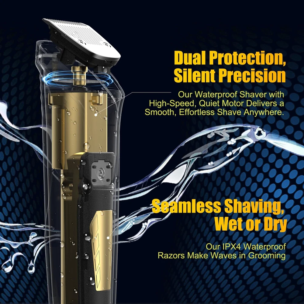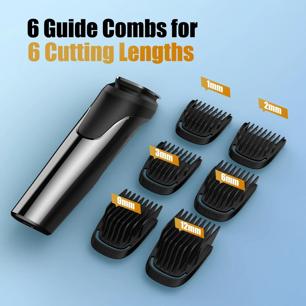 ✂【Multi-Purpose Beard Trimmer Men】 With a single beard trimmer men, you can remove/trim all over your hair, beard, nose, ear and other body hair. Replace three interchangeable head (full-size trimmer, precision trimmer, ears and nose trimmer), hair clippers men have 6 combs guide (1 mm/2 mm/3 mm/6 mm/9 mm/9 mm/12 mm), provide a variety of options for your hair, whether it is a buzz cut, a crew cut or other fashion style can help you control the length of your hair. ✂【Charge 90 Minutes, Discharge 120 Minutes】Hair clippers men can be completed by USB cable charging 1.5 hours, charging is quick and convenient. The discharge lasts longer, with 2 hours of service and a very long battery life, giving you plenty of time for a precise hair trim task. If time is limited, or you're in a hurry to get to an appointment, beard trimmer men have a quick 5 minute charge and a quick 10 minute beard/nose hair trim! Our mens grooming kits are the perfect gift for a man. ✂【Sharp Blades, Painless Hair Removal】Stainless steel self-sharpening dual-edge blades feature extra sharpness and precision for instant and clean cuts; no more getting the hair uncut and stuck or pulling them over and over again. R-shaped blades of the hair clippers ensure smooth skin contact for a painless, comfortable, and efficient hair removal experience to keep you fresh and tidy. ✂【High-Speed Motor, Efficient Trimming】A high-speed motor inside the beard trimmer men spins at 9000 rpm, enabling the blades to go back and forth faster and get your hair trimmed evenly and neatly. Strong force drives the hair clippers men finish various trimming work quickly. Do hairdressing or hair styling for yourself or families at home. ✂【Washable Blades, Low Noise Operation】Three replaceable trimmer heads of the beard trimmer men are made of stainless steel, allowing you to detach and wash clean with the rinse water; while the hair residues inside the beard trimmer, please gently clean with the brush included. Shaving in the morning with the toilet door closed won’t disturb your sleeping wife. ✂ 100% Waterproof
