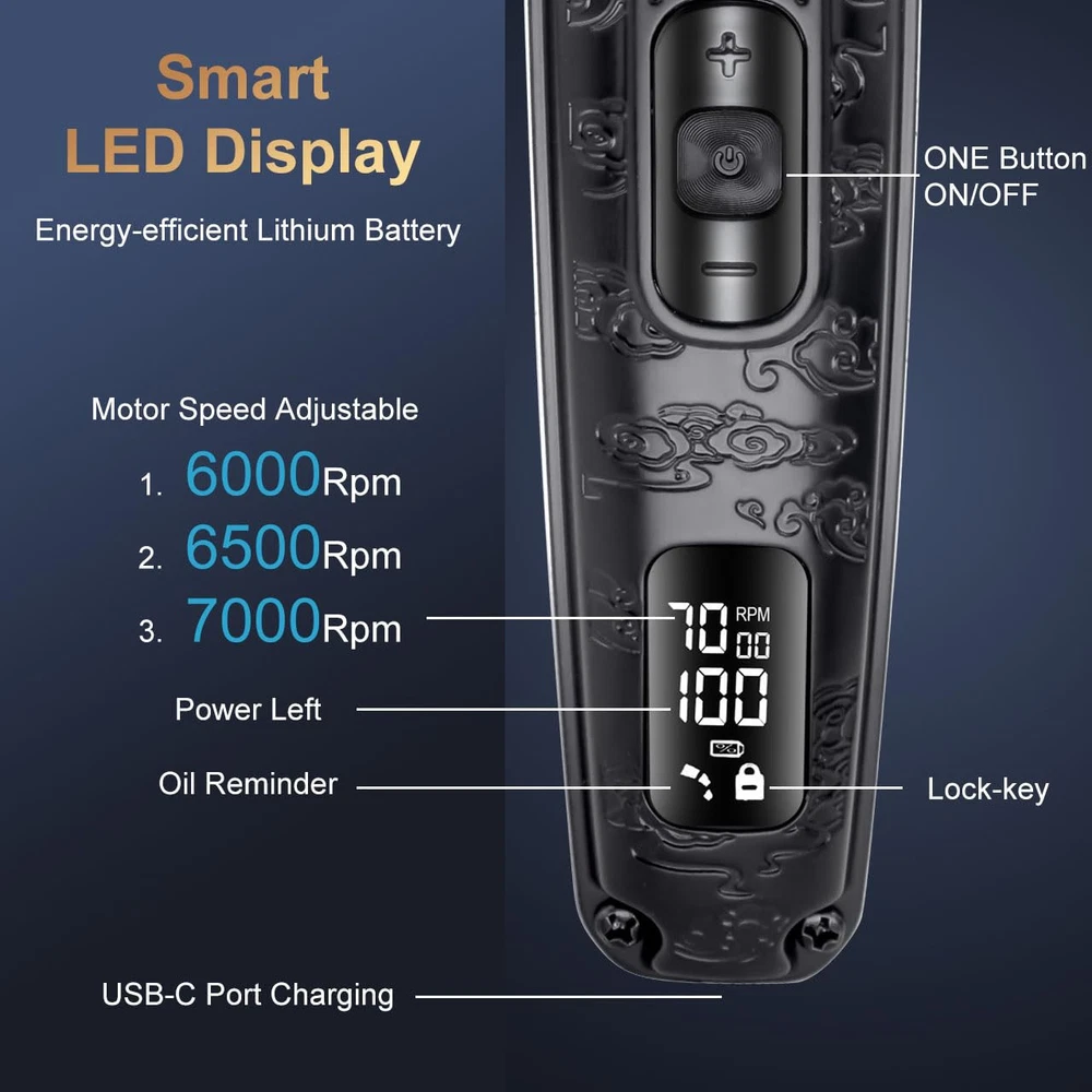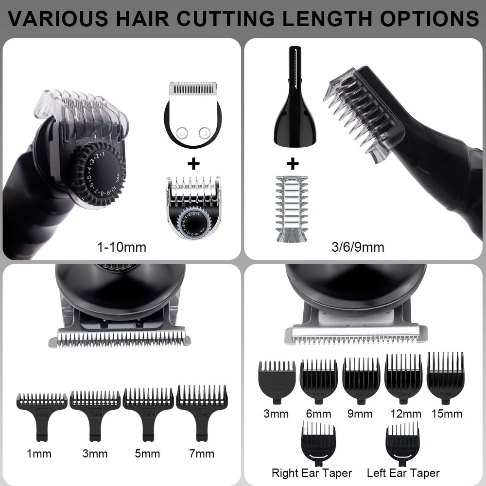 【8 IN 1 Versatile Grooming Kit】Equipped one T-blade trimmer with 4 guide combs (1 mm, 3 mm, 5 mm, 7 mm), one hair trimmer with 7 guide combs (3 mm, 6 mm, 9 mm, 12 mm, 15 mm,left/right comb),one precision trimmer(1-10mm dial comb),one detailed trimmer,one micro razor, one nose/ear trimmer, one body groomer, one body hair trimmer head,designed for men for all ages seeking convenient grooming solutions,suitable for novices as well as professional barbers and stylists. 【Up to 7000 RPM Adjustable Speed】Resistant motor with a standard speed of 6000 RPM, which can be increased to 7000 RPM in the speed control mode for cutting harder hair or fast trimming, and ensuring a neat and straight edge . The motor stands up to frequent use, runs smoothly, delivers a trimming without pulling or snagging,and is less prone to overheating and wear. 【Smart LED Display & USB-C Charging】Reminds you when trimmer is fully charged or low battery state. Reaching full power in 90 minutes provides 180 minutes of trimming. Enjoy the convenience of cordless grooming with USB charging ,while the C-port ensures compatibility across multiple models, eliminating charger mismatches and loss concerns. 【Precise Length Control】 Choosing different lengths from 11 Guard Combs (1mm, 3mm, 5mm, 7mm for T blade head; 3mm, 6mm,9mm,12mm,15mm,left comb/right comb for hair clipper head) to achieve precise cuts and trims with for various hair lengths and hairstyles. With 1 PRECISION DIAL from 1mm-10mm effortlessly customize your desired look. 【Ergonomic design】Can be gripped and trimmed for a long time, not easy to cause wrist fatigue, comfortable to operate, making precise trimming more simple every time; Compact size for easy to carry ,it can be used for men's daily trimming, but also can be used for travelling or business trips, with a locking function to avoid accidental switch on. 【Entire Body Washable】 The Beard Trimmer body adopted IPX6 waterproof design with the removable cutter heads for easy cleaning under running water. For longer use, please dry it after cleaning. 【Ideal Choice of Men's Beard Trimmer Set】Multiple blades and different sizes of combs are plentiful without being cluttered, and comes with a handy storage bag and storage stand for easy storage of all accessories and for carry to go ,also avoids loss or confusion, making your beard trimmer set more tidy and organisedand . This beard trimmer kit would be a good souvenir for your dads, loved ones or male friends on your day of commemorations or other special days.