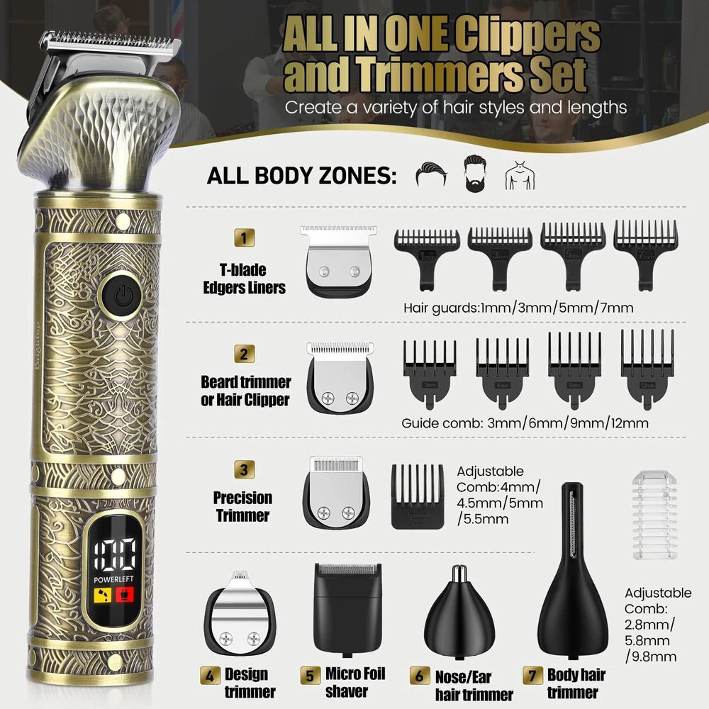 All in One Mens Trimmer: It has 7 trimmer heads, a T blade edgers, 2 in 1 cutting head to trim hair and beards, a foil shaver, a nose hair trimmer, a body hair trimmer for men, a precision beard trimmer and a design trimmer. Shaving Kit for Men: Beard grooming kit men also come with 9 guide comb sizes for different hairstyles and lengths. 4 hair guards 1/3/5/7 mm, 4 guide combs 3/6/9/12 mm, a durable stand and storage pouch for travel. The interchangeable multiple heads are for trimming face and neck, mustache, sideburns, stubble, body hair and facial hair. Ultra Sharp Steel Blades: The electric razor for men face delivers an even, precise, close shave and clean cut; its sharp blades can easily cut through fine, thick, coarse hair without pulling or snagging. The T blade liners can be close to the skin for a zero-gap trim and can do hairlines or edges. Useful LED Display: This cordless hair trimmer for men haircut has a digital display that can constantly shows the remaining battery life to let you recharge the beard and mustache trimmer. Rustic personal mens grooming kit is a versatile tool to shape and trim different areas of body. USB C Rechargeable & Long Battery Life: This hair clippers for men cordless built-in lithium battery provides wireless operation for up to 120 mins after 1.5 hrs of charge. Included a USB C cable but wall adapter is not included. Easy to Use and Clean: The portable body/facial grooming clippers set is ergonomic, ensuring a comfortable grip and effortless to use. Wash the stainless steel blades by rinsing under water.(Note: Don't immerse the whole electric hair trimmer in water). Gifts for Men: The men's hair clippers are a solid pick for a complete grooming experience. Perfect for personal use or as a stylish gift for your fathers, dads, and husband. Give it as a christmas gift or birthday gifts to your family and friends.