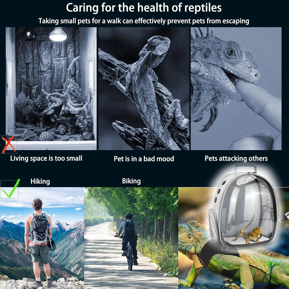 Comfort & Security - The CUTENNIOU Pet Carrier Backpack features a unique and modern design, with a clear bubble window that allows your cat or puppy to have a wide view while being safely enclosed, giving them a sense of security. The transparent window design provides an engaging interactive experience for your pet. The included mat makes traveling more enjoyable for you and your furry friend. Large Bearded Dragon Carrier - Size: 13.4 L x 9.8 W x 16.5 H inches, The large capacity ensures your pet can travel comfortably without feeling cramped, perfect for reptiles bearded dragons, geckos, crested geckos, lizard, chameleon and other small pets of various sizes. Most airlines approve placement under the seat, but be sure to check with your airline beforehand. High Quality & Good Ventilation - Our large pet carrier backpack is made of high quality materials. The side pocket is great for storing small items such as pet snacks or water bottles. The small animal carrier backpack has 9 large vents and the breathable mesh material provides good ventilation, ensuring your pet always has access to fresh air, allowing your pet to enjoy outdoor time with you. Ergonomic Design - The side opening is perfect for calming nervous animals and providing easy access for reptiles, making it both stylish and practical. The package comes with adjustable shoulder straps and sturdy handles, and the backpack's straps absorb sweat and reduce pressure on the pack, ensuring maximum comfort for the wearer. A great gift option for reptile lovers and festival like Christmas and New Year. Versatile & Travel-Friendly - The package contains a bearded dragon carrier,a removable support mat and batwing leather leash, 3 small bearded dragon accessories to suit different sizes of small pets in their growth stages. This pet backpack is designed for outdoor use and travel, you can use it to carry your little one biking, hiking, camping, to the vet or meeting friends. Product Description Our CUTENNIOU Pet Carrier Backpack is designed for outdoor and travel, you can use it to carry your puppy or cat for biking, hiking, camping, going to the vet, meeting friends or just taking your pet for a walk. Hiking Biking Pet Hospital Notice: 1. This cat carrier backpack fits most small pets up to 14 pounds. Please consider the length and weight of your pet for comfort in an enclosed space. 2. Most airlines allow placement under seats, but be sure to check with your airline beforehand. 3. Not machine washable, when you find stains on the cat backpack, please wipe it with water. 4. The new pet carrier backpack may have a smell, please simply wipe it or place it in a ventilated place outdoors for several hours before using it for the first time. Our Story We are a professional team of small pet supplies for hamsters, mice, gerbils, rabbits, guinea pigs and more. We specialize in providing high quality, safe, and proper pet supplies to keep every furry animals healthy and happy; We care about your feelings, we will quickly and diligently resolve your concerns, let’s give our furry friends a warm home together. Enjoy happy outdoor time with your pet now! Product advantages: 1. With a transparent bubble window, providing your pet with a great view and easy for you to interact. 2. With nine vents and mesh structure breathable, comfortable to use. 3. The opening on the side is perfect for soothing nervous cats, and easy access for guinea pigs, rabbits, hedgehogs and other small pets. 4. The backpack straps are adjustable. The straps of the backpack can absorb sweat and reduce the pressure of the backpack, ensuring maximum comfort for the wearer. Material: PC shell, Oxford cloth Size: 13.4 L x 9.8 W x 16.5 H inches 1 x pet backpack carrier, 1 x support mat and 1x batwing leather leash, 3 bearded dragon harness and leash set Please peel off the protective film (to avoid damage during transportation), you will get a perfect pet carrier bag!