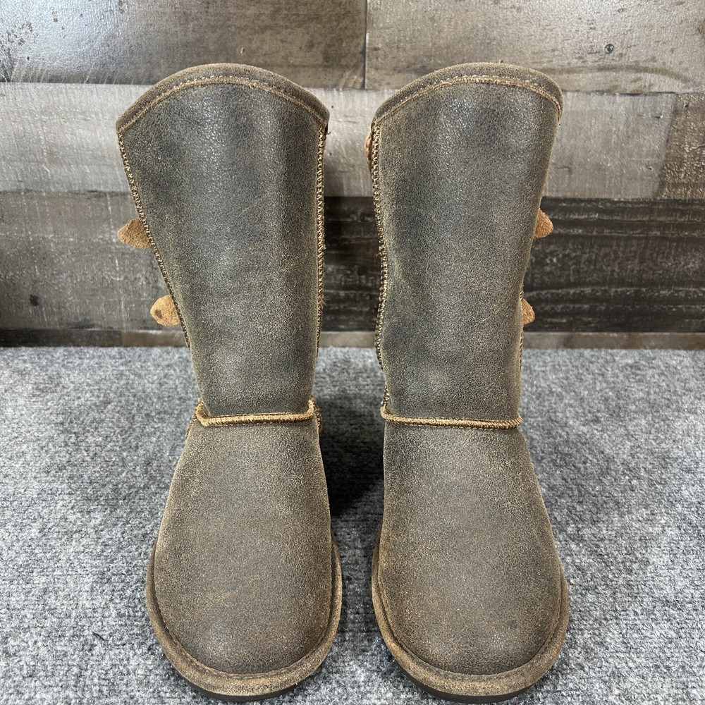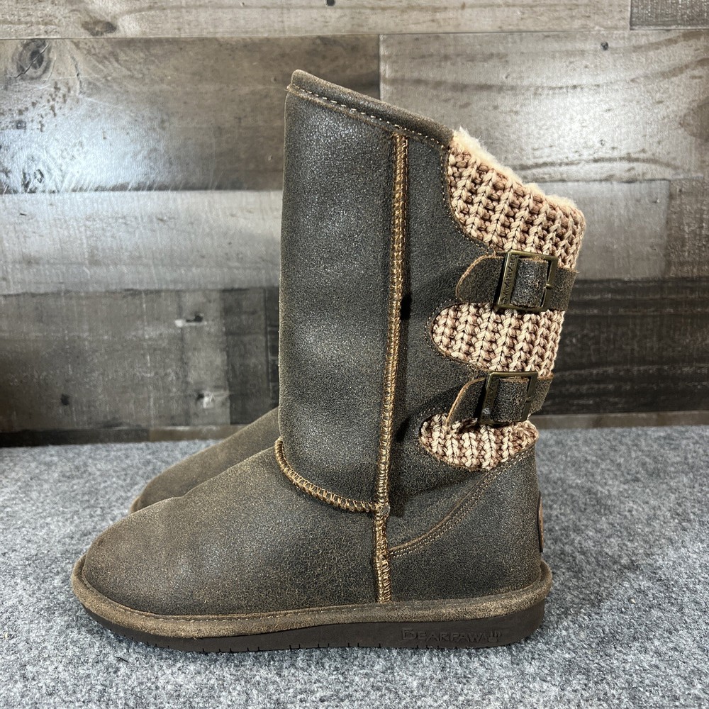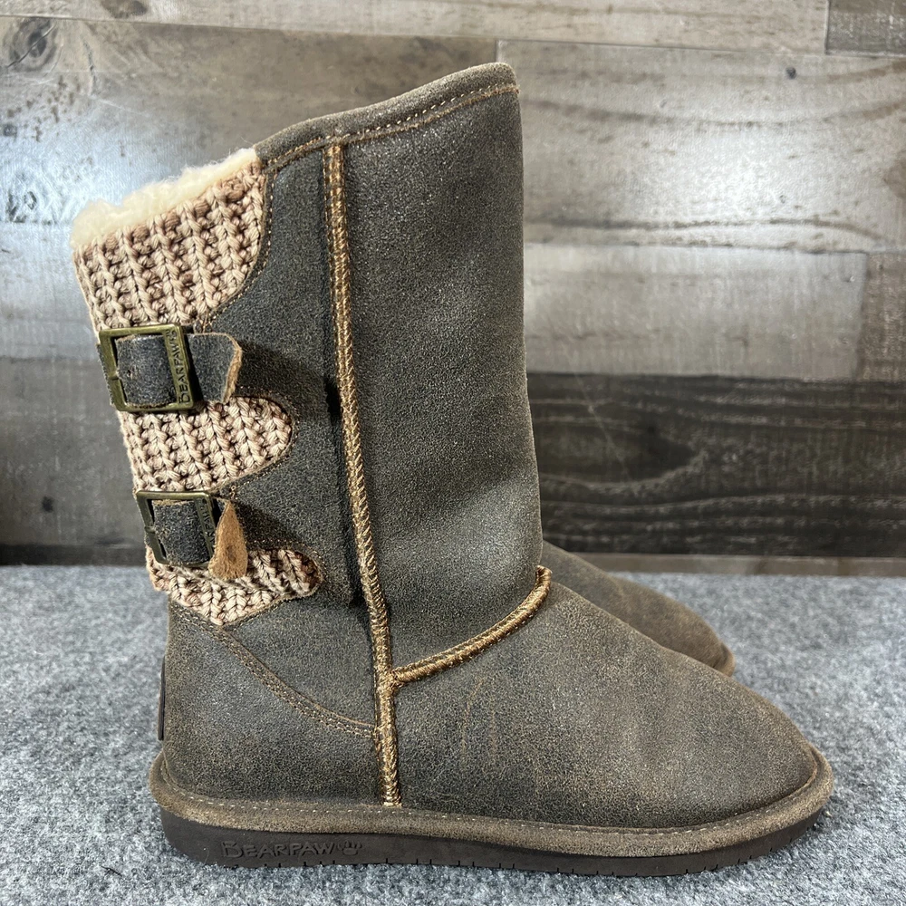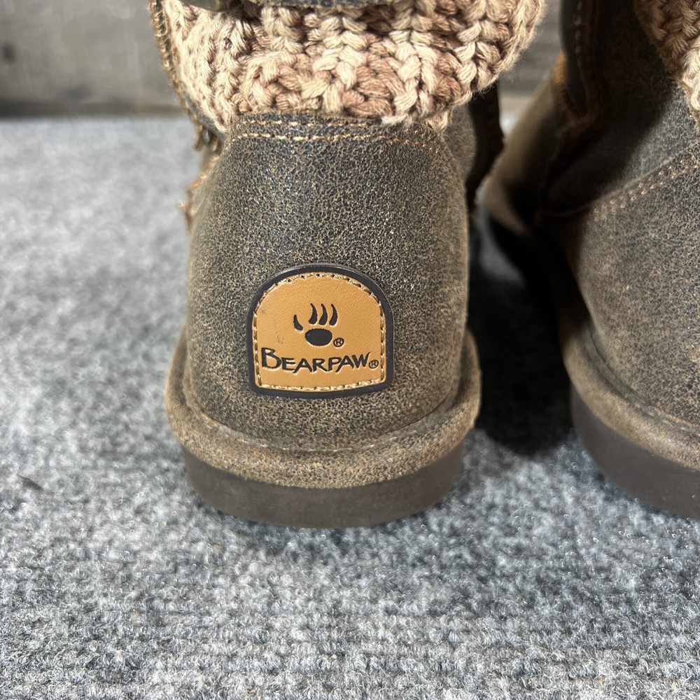 UK Shoe Size: 6 Type: Boot Model: BEARPAW Boshie Features: Lined Closure: Pull On Fabric Type: Knit Color: Brown Outsole Material: Rubber Brand: BEARPAW Style: Slip-On Upper Material: Suede Shoe Shaft Style: Mid-Calf Toe Shape: Round Toe EU Shoe Size: 39 US Shoe Size: 8 Department: Women Lining Material: Wool Blend Heel Style: Flat