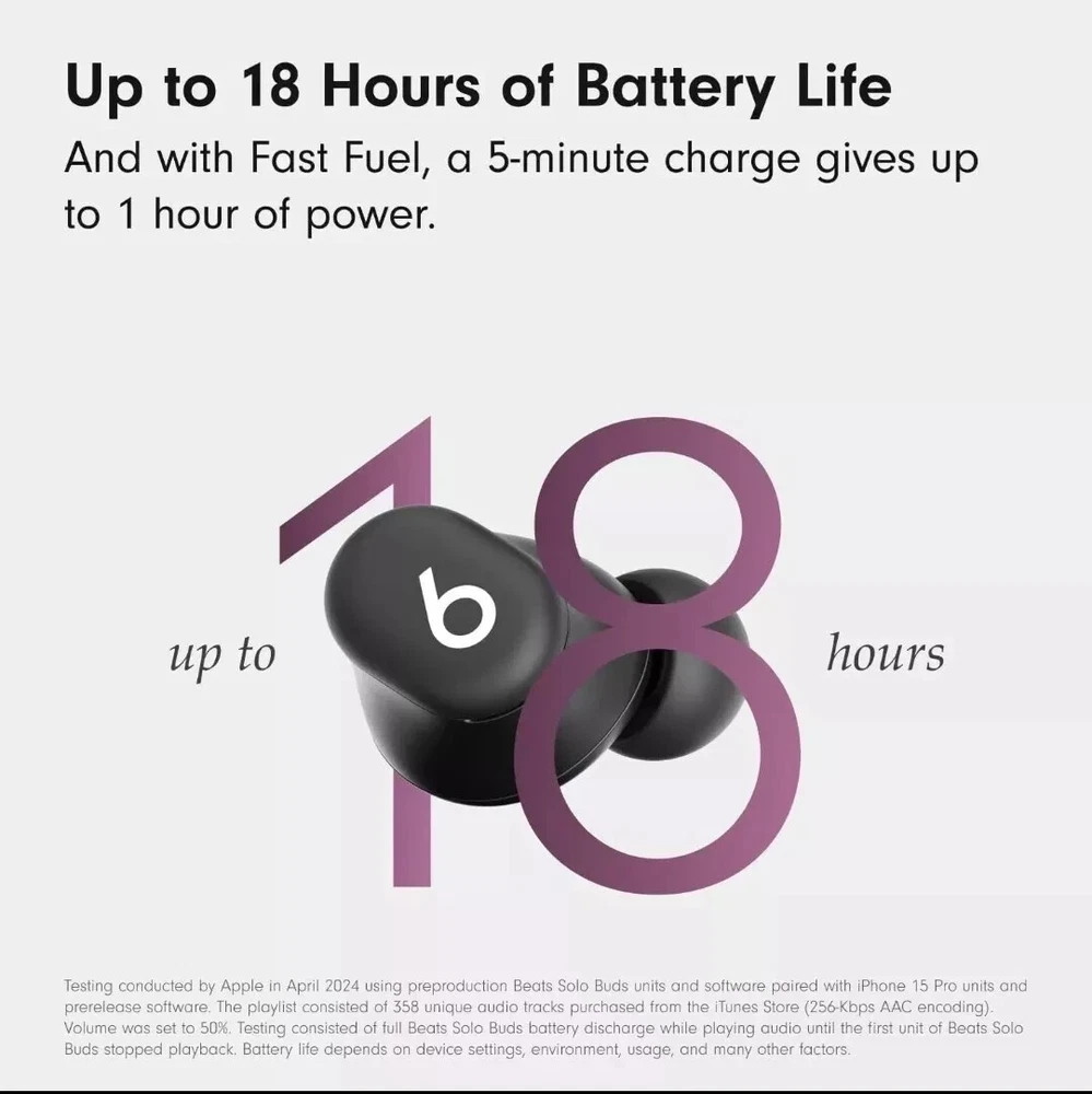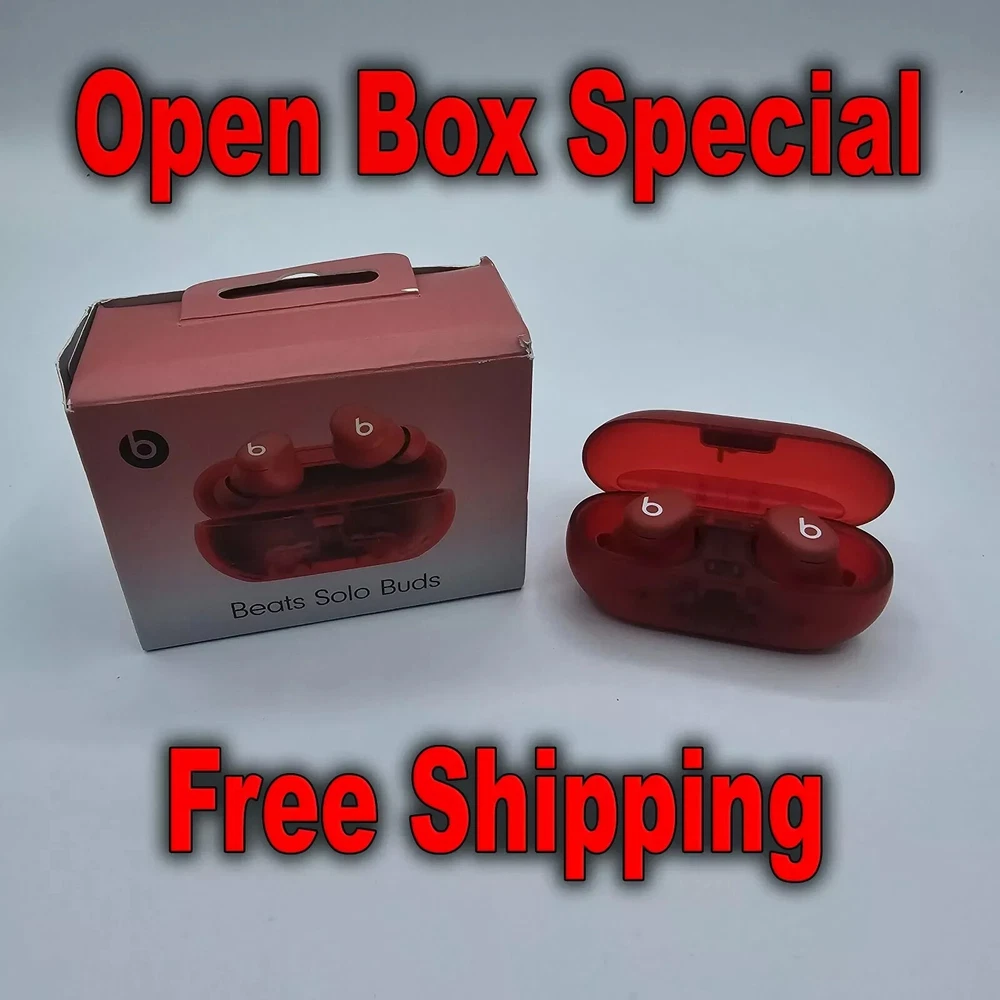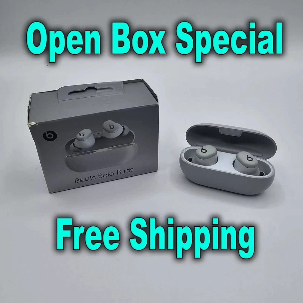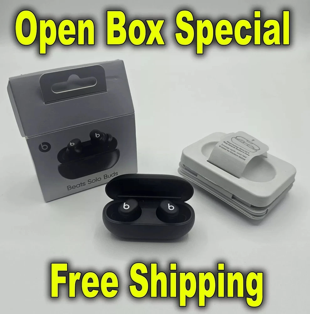 Open Box These are open box items. All of the boxes have blemishes. These have been fully tested, will connect to bluetooth, factory defaulted and sanitized. Highlights Custom acoustic architecture for big Beats sound with full range and clarity. The smallest case we’ve ever made, making these powerful earbuds the perfect on-the-go companion. Dual-layer drivers minimize distortion, ensuring high-fidelity sound. Purposefully positioned axial-aligned drivers deliver sound directly to your ears. Laser-cut vents further improve audio performance while relieving pressure for added comfort. Extra ear tips sizes to fit a wider range of ears. Up to 18 hours of battery life. Fast Fuel, a 5-minute charge gives up to 1 hour of playback. Charge directly from your phone, tablet or laptop for extra power on the go. Dual compatibility for iOS and Android devices including seamless one-touch pairing. Each earbud features custom-designed microphones powered by an advanced noise-learning algorithm for exceptional call quality. Extended range and fewer dropouts thanks to industry-leading Class 1 Bluetooth®. What’s in the box: Beats Solo Buds earbuds, carrying case, ear tips with four size options, warranty card. (Power adapter and USB-C charging cable sold separately) Description Beats Solo Buds Looks tiny. Sounds huge. Featuring the tiniest case we’ve ever made, these mighty small wireless earbuds are jam-packed with incredibly big sound. • Fully Custom Acoustic Architecture • Ergonomic Design for a Natural Fit • Up to 18 hours of Battery Life • Compatible with both iOS and Android Sound Designed for music first. Every design decision focused on accurate music reproduction — from the drivers to the vents to the position of each intricate component inside. The result? Cleanly balanced tuning that gives you the full range and emotion of all your favorite music, as the artists intended. Custom-built sound system. Dual-layer drivers minimize micro-distortions to ensure high-fidelity sound with uncompromising clarity and warmth. Each fully custom driver is positioned parallel to the ear nozzle to deliver sound optimally to your ears. Size Our smallest case. Ever. Beats Solo Buds feature the tiniest case we’ve ever made, making these powerful earbuds the ultimate on-the-go companion. All about airflow. Each bud’s laser-cut vents are engineered to improve audio performance, especially for bass, while gently reducing air pressure for extra comfort. Comfort Fit for any ear. The earbuds’ ergonomic design features nozzles angled to match the natural shape of the ear canal. Beats Solos Buds come with multiple ear tip sizes — including our newest extra-small option — to help ensure ultimate comfort and passive noise isolation. Battery Charge from your phone. Or tablet. Or wall outlet. When it’s time to recharge, seat your earbuds in the case while connected to a USB-C cable. A 5-minute Fast Fuel charge provides up to 1 hour of listening time³ when you need it quick. Battery all day. Beats Solo Buds are built for extended listening, featuring up to 18 hours of battery life and a comfortable, ergonomic design. Compatibility Works with iOS. And Android. Native compatibility ensures seamless one-touch pairing, automatic pre-pairing across your devices, plus Find My or Find My Device — for everyone. Call Quality Crystal-clear calls. Each earbud is equipped with a custom-designed microphone powered by an advanced noise-learning algorithm to help deliver exceptional call quality. Enjoy extended range with fewer dropouts thanks to industry-leading Class 1 Bluetooth®. Controls On-device controls. Customizable on-ear functions allow you to control your music, take calls and activate your voice assistant by pressing the ‘b’ button. You can also configure the ‘b’ button in iOS settings or your Beats app to control your volume. Serial Number Recording: For security and order tracking purposes, we record the serial number for each order. Restocking Fee: Please be aware that a 15% restocking fee will be applied in the following situations: mistaken orders, invalid shipping addresses provided, change of mind, or personal dislike of the product to cover the nonrefundable shipping fee on USPS. In the Box: Beats Solo Buds earphones Carrying case Ear tips (Power adapter and USB-C charging cable sold separately)