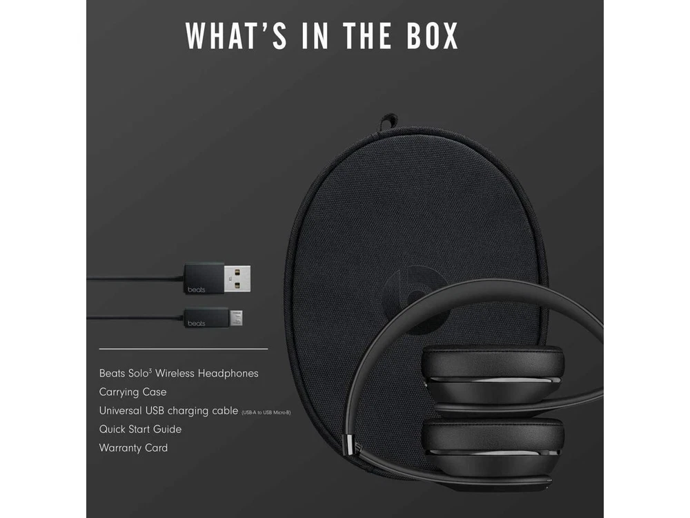 Beats Solo 3 is a wireless Bluetooth headphone by Beats by Dr. Dre. It features an adjustable headband, built-in microphone, rechargeable battery, and leather cushions for comfort. The headphones are black in color, have a foldable design, and provide stereo sound with closed-back ear-pads. They also offer in-line control for easy use and are suitable for DJs. No box