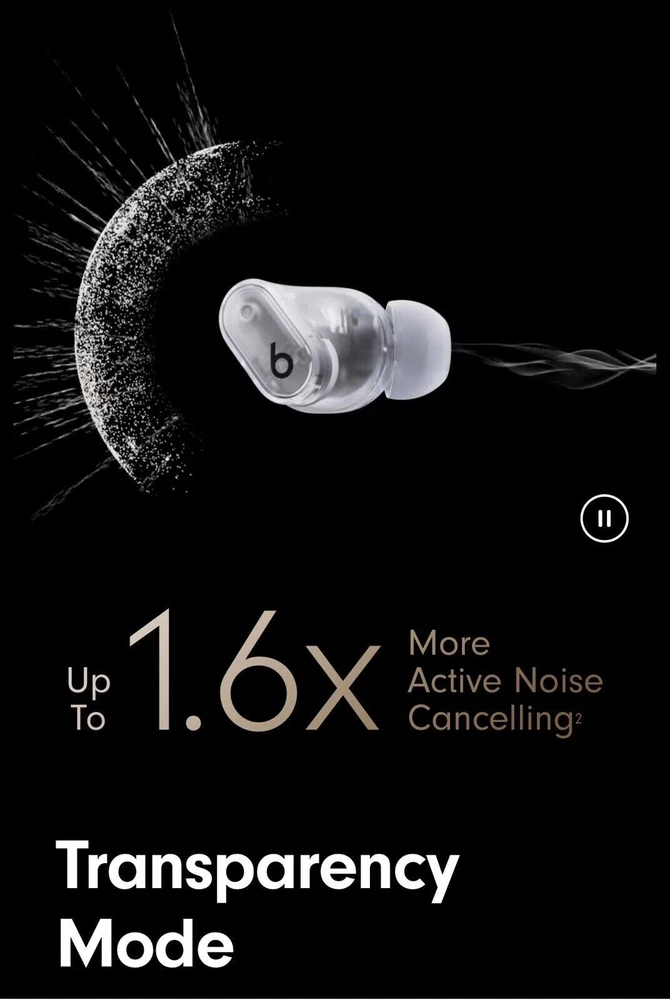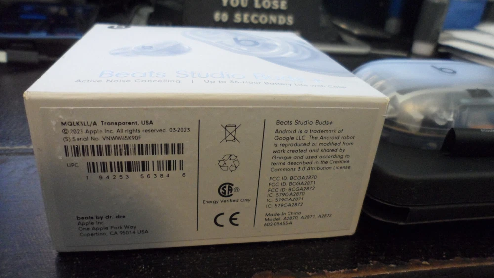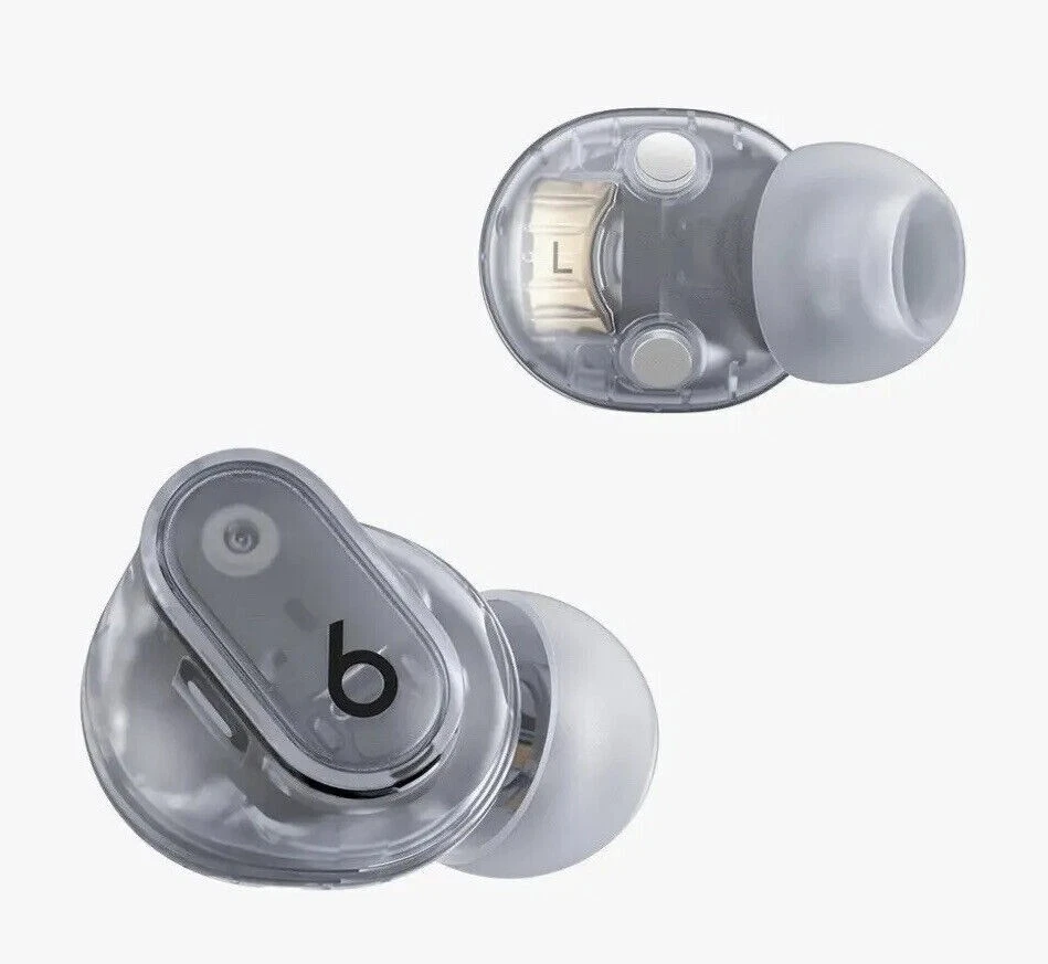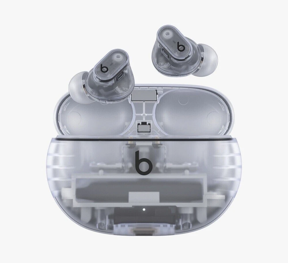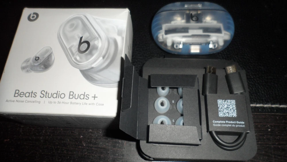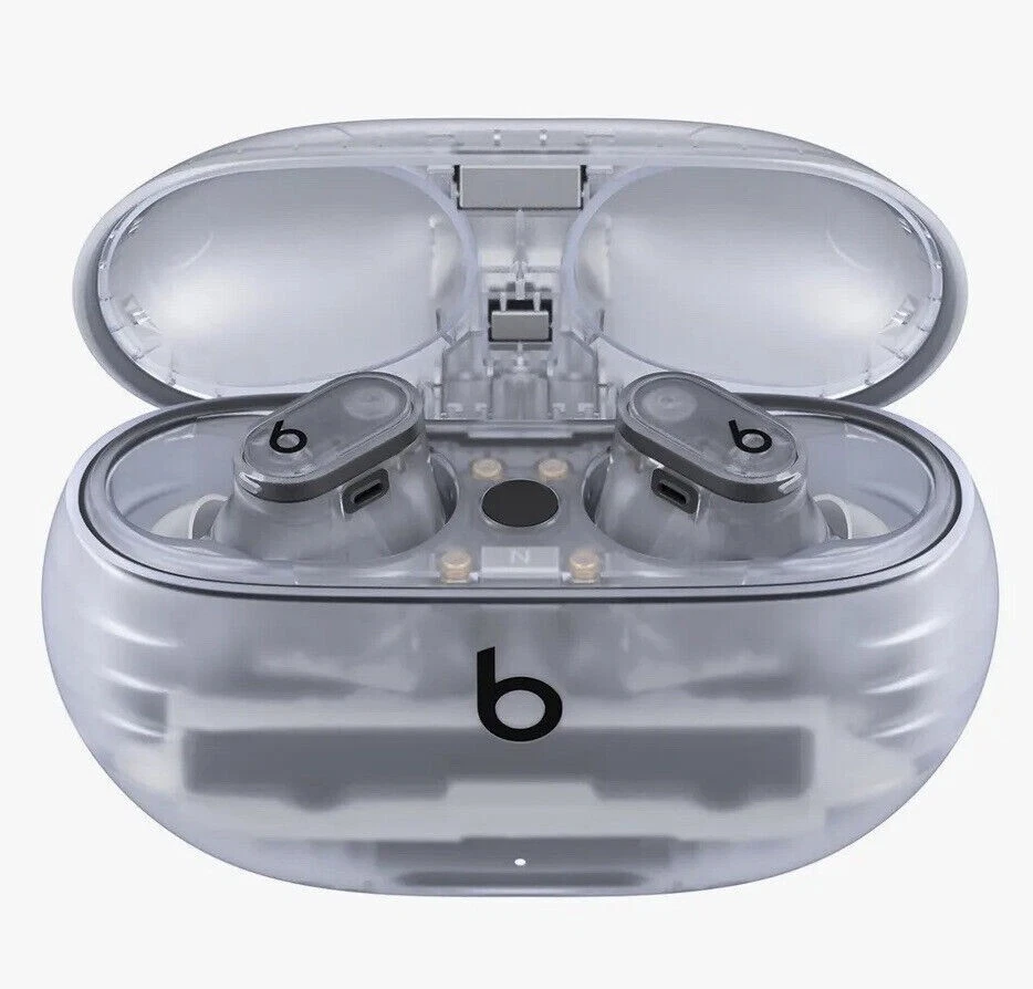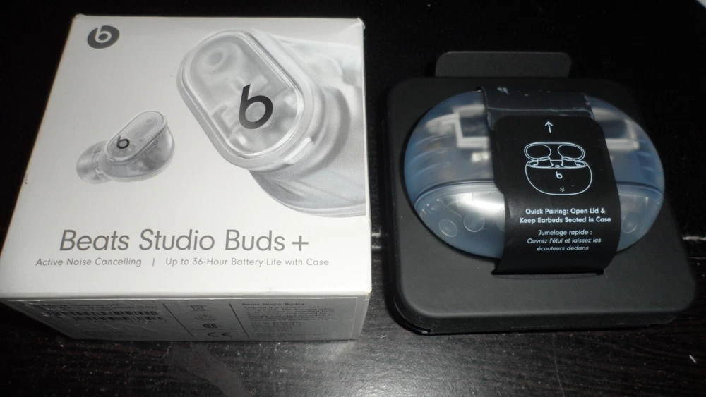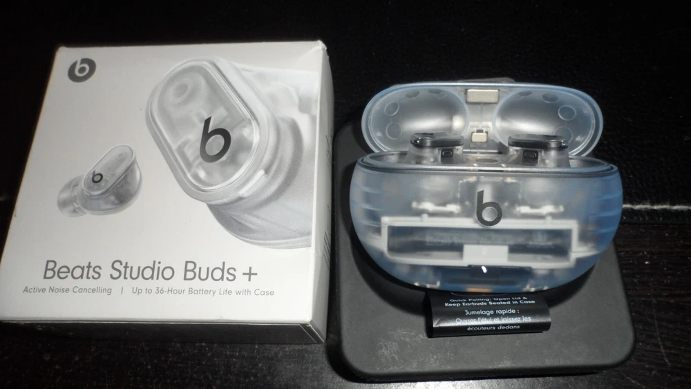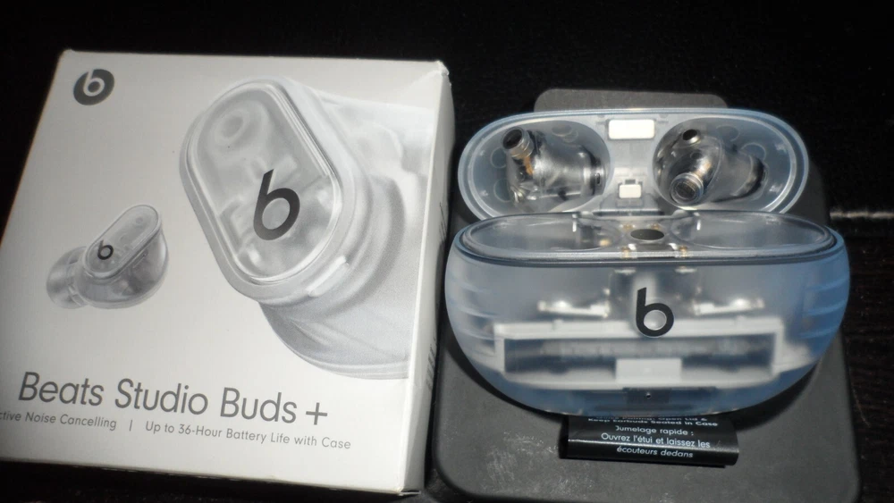 Beats Studio Buds – True Wireless Noise Cancelling Earbuds Clear / OPEN BOX LIKE NEW CNDITION 100% AUTHENTIC BEATS ALL SERIAL NUMBER HAS BEEN RECOREDED IN OUR STORE Included Items BEATS BY DR. DRE - BEATS STUDIO BUDS + TRUE WIRELESS NOISE CANCELLING EARBUDS - TRANSPARENT Beats Studio Buds + deliver rich, premium sound in a pocketable design, wherever you go. Featuring powerful, balanced acoustics, Active Noise Cancelling, Transparency mode, high-quality calls, up to 36 hours of battery life¹, enhanced Apple & Android compatibility, and 4 ear tip options to ensure a custom fit and great sound Beats Studio Buds + Earbuds Pocketable charging case Eartips with four size options USB-C to USB-C charging cable Quick Start Guide Warranty card Features Feel the emotion of powerful, balanced sound from Beatscustom acoustic platform Active Noise Cancelling (ANC) adapts to your personal fit to keep you immersed in the music Transparency mode blends your listening experience with the world around you Up to 36 hours of total battery life (9-hour earbuds + 27-hour charging case)¹ Enhanced Apple and Android compatibility with one-touch pairing and deeper ecosystem integration² Crisp, clear call performance from upgraded, voice-targeting mics Sweat and water resistant earbuds (IPX4-rated)³ Four soft eartip sizes provide a comfortable, stable fit and an acoustic seal for great sound quality Spatial audio for Dolby Atmos surrounds you with sound Extended range and fewer dropouts with Class 1 Bluetooth® Pocket-sized charging case with USB-C connector ¹ Testing conducted by Apple in March 2023 using preproduction Beats Studio Buds + and Charging Case units and software paired with iPhone 13/iPhone 14 units and prerelease software. The playlist consisted of 358 unique audio tracks from the iTunes Store (256-Kbps AAC encoding). Volume was set to 50% and Active Noise Cancellation and Transparency were turned off. Testing consisted of full Beats Studio Buds + battery discharge while playing audio until the first Beats Studio Buds + stopped playback. Battery life depends on device settings, environment, usage, and many other factors. ² Requires an iCloud account and a compatible Apple device running the latest operating system software or a compatible Android device running Android 8.0 or later, with Google Play Services enabled. ³ Beats Studio Buds + are sweat and water resistant for non-water sports and exercise. Beats Studio Buds + were tested under controlled laboratory conditions, and have a rating of IPX4 under IEC standard 60529. Sweat and water resistance are not permanent conditions and resistance might decrease as a result of normal wear. Do not attempt to charge wet Beats Studio Buds +; refer to https://support.apple.com/en-us/HT209542 for cleaning and drying instructions. The charging case is not sweat or water resistant. Compatible hardware and software required. Works with compatible content in supported apps. Not all content available in Dolby Atmos. Specifications True Wireless: true Battery Life Provided by Charging Case: 27 hours Sound Isolating: true Built-In Microphone: true Battery Life: 9 hours Water Resistant: true Wireless Connectivity: Bluetooth Connection Type: Wireless Manufacturer's Warranty - Labor: 1 year Manufacturer's Warranty - Parts: 1 year Rechargeable: true Model Number: MQLK3LL/A Color Category: Clear Headphone Fit: In-Ear Carrying Case: true Charging Accessory Included: Case Works With: Siri Product Name: Beats Studio Buds + True Wireless Noise Cancelling Earbuds Charging Interface(s): USB Type C Ear Tip Sizes Included: Extra small, Small, Medium, Large Brand: Beats by Dr. Dre Color: Transparent Noise Cancelling (Active): true