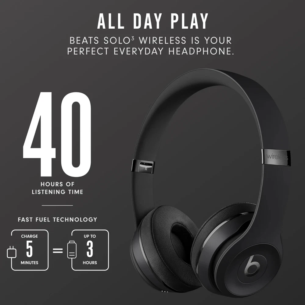 About this item High-performance wireless Bluetooth headphones Features the Apple W1 chip and Class 1 wireless Bluetooth connectivity With up to 40 hours of battery life, Beats Solo3 wireless is your perfect everyday headphone Compatible with iOS and Android devices With Fast Fuel, 5 minutes of charging gives you 3 hours of playback when battery is low Adjustable fit with comfort-cushioned ear cups made for everyday use Sleek, streamlined design that’s durable and foldable to go everywhere you do Take calls, control your music, and activate Siri with the multifunction on-ear controls The award-winning sound and design you’ve come to love from Beats, with premium playback with fine-tuned acoustics that maximize clarity, breadth, and balance What's in the box - Beats Solo3 Wireless headphones, Carrying case, 3.5mm RemoteTalk cable, Universal USB charging cable (USB-A to USB Micro-B), Quick Start Guide, Warranty Card (USB power adapter sold separately) Product is unused. Open box.