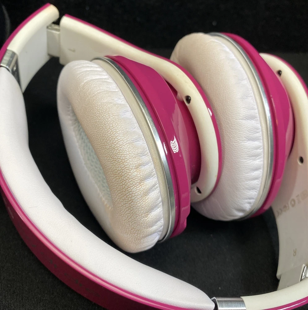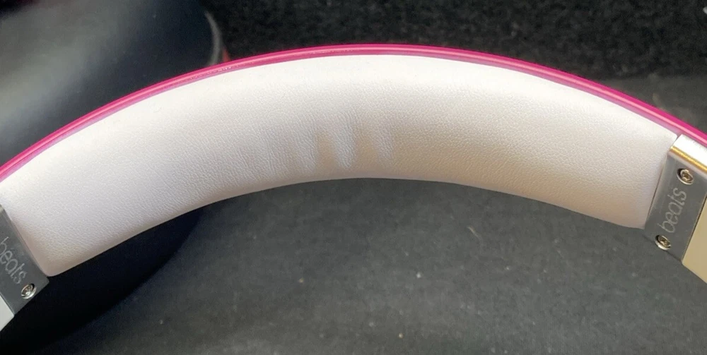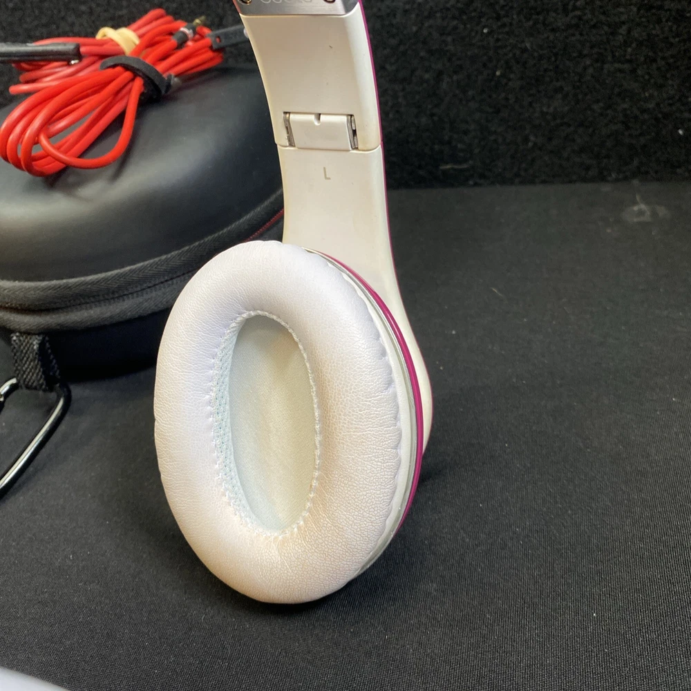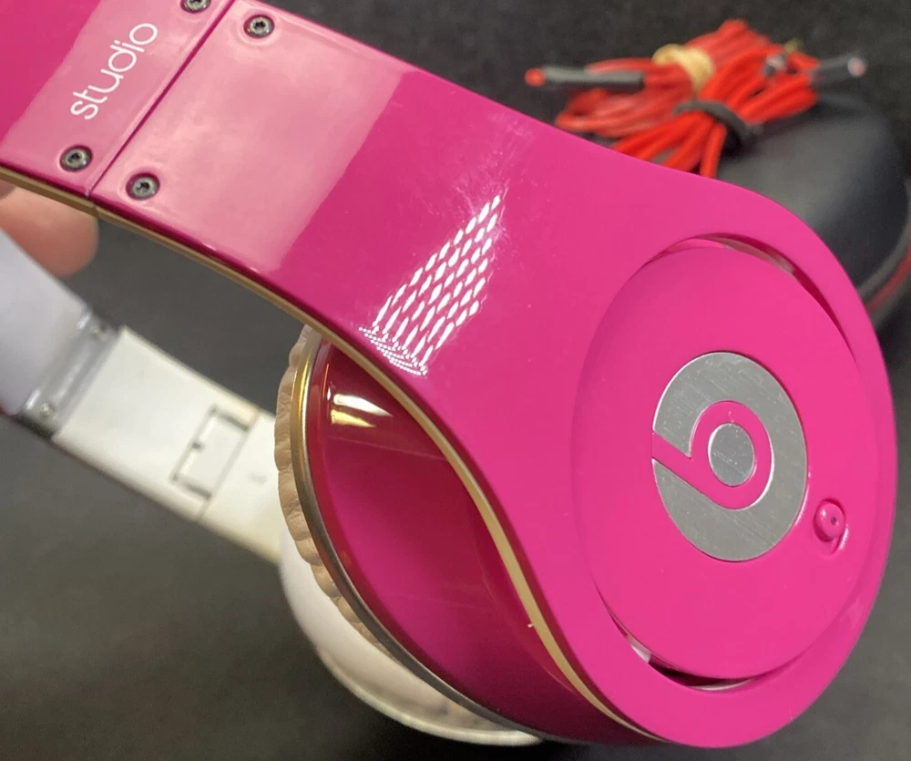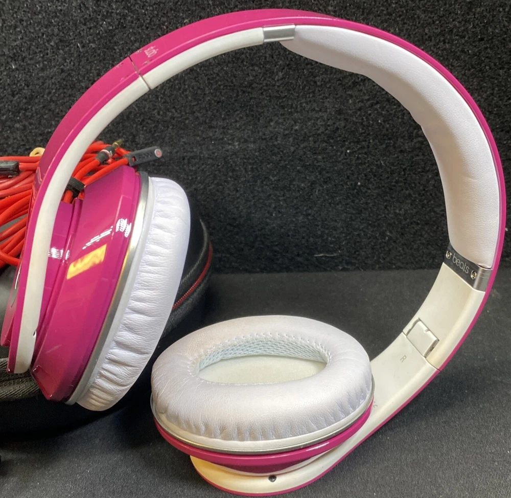 The Beats by Dr. Dre Studio Gen 1 Wired Headband Headphones are designed with a stylish pink and white color combination. These ear-cup headphones feature an adjustable headband for a comfortable fit and offer noise cancellation and noise isolation for an immersive listening experience. The headphones also come with a detachable cable, foldable design for portability, and in-line control for easy access to music playback and calls. The connectivity is through a 3.5mm jack, making it compatible with a wide range of audio devices. Preowned in good condition no rips or tears. Looks like there is some make up stain on one earlobe has been fully tested. Does work refer to pictures.