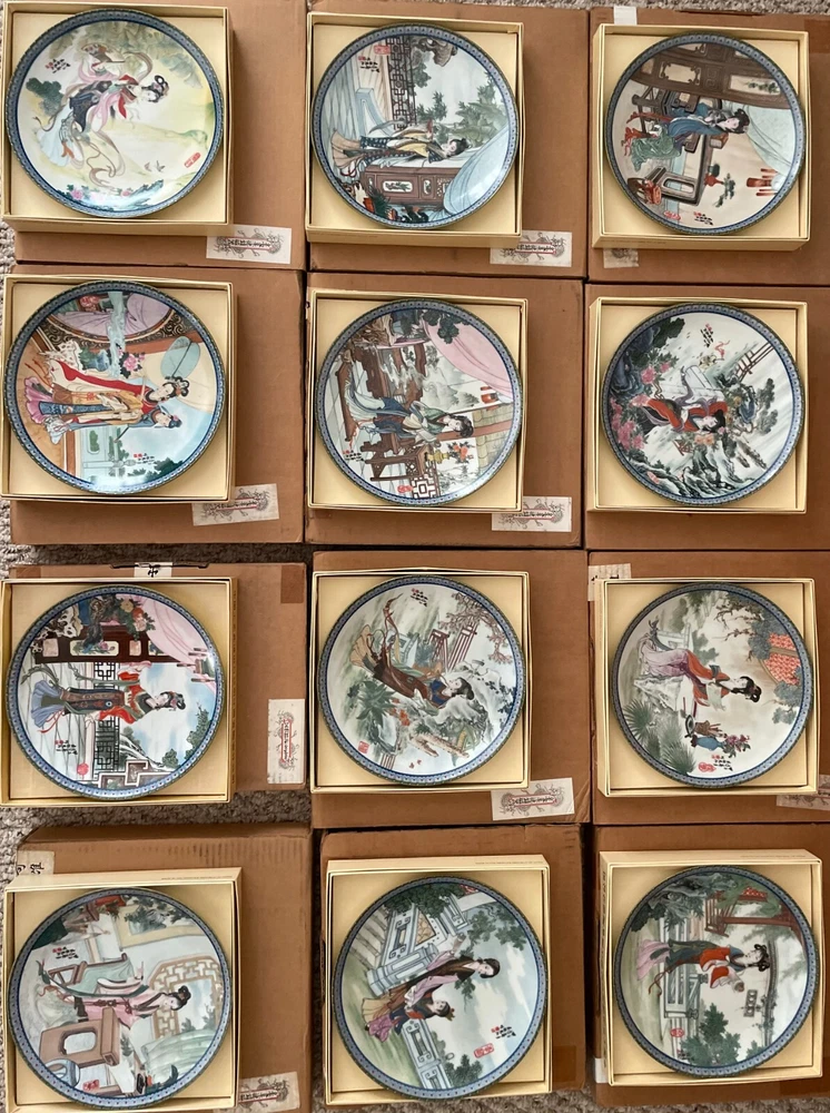 Explore the exquisite craftsmanship of Imperial Jingdezhen with this complete set of "Beauties of Red Mansion" porcelain plates. Each is created by the Master Artisan Zhao Huimin with inspiration provided by a Dream of Red Mansions, a classic of Chinese romantic literature, a 200 year old novel. Each plate measures 8.5 inches in diameter, showcasing a vibrant multicolor design that captures the essence of Chinese culture. The round decorative collector plate was created in the 1980s. The plates are created with lead based paint so are not appropriate for food consumption. No two pieces are exactly alike, making this set a unique addition to any collection. Whether displayed as a tribute to historical beauty or as a statement of decorative art, these plates are sure to impress. Sold as a complete collection only. They are in their original presentation box and original shipping box with all original documentation.