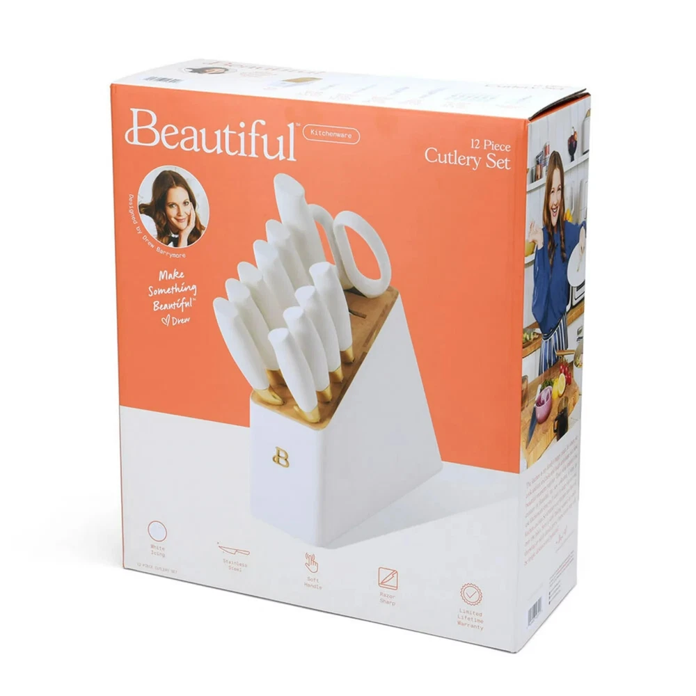 Beautiful 12 Piece Knife Block Set w/ Soft Ergonomic Handles by Drew Barrymore Purposeful tools create purposeful kitchen moments. The Beautiful 12 Piece Knife Block Set features a variety of knives and all-purpose shears to slice, dice, mince, cut, and more. Innovative knives and scissors feature white soft grip handles with our signature gold accents that fit comfortably in your hand. Durable stainless steel blades feature a stick resistant, resin coating that limit food from adhering to the knife and allow for easier, more efficient cutting. Store and display in our signature knife block that will look beautiful on your kitchen counter. 12 Piece Knife Block set includes: 8-inch chef knife, 5.5- inch serrated utility knife, 5-inch Serrated Santoku knife, 3.5- inch paring knife, (6) 4.5-inch Steak Knives, All Purpose Shear, White Block. Knives and shears are hand-wash only; wipe block clean with a damp cloth. Lifetime Limited Warranty. BPA-free. 12 PIECE KNIFE BLOCK SET INCLUDES: 8 inch chef knife, 5.5 inch serrated utility knife, 5 inch Serrated Santoku knife, 3.5 inch paring knife, (6) 4.5 inch Steak Knives, All Purpose Scissors, White Knife Block STICK RESISTANT: Each blade is crafted from stainless steel and features a stick resistant, resin coating that limits food from adhering to the knife; this allows for easier, more efficient cutting. COMFORTABLE HANDLES: Ergonomically designed handles feature a soft grip for comfort in the hand while using. RAZOR SHARP: Each knife features a high-carbon, stainless steel blade which ensure the knife retains its ultra-sharp edge and making food prep effortless. EASY CARE: Hand wash with warm water and a mild detergent. Rinse and dry immediately. Stainless steel knives are not dishwasher safe. Beautiful 12 Piece Knife Block Set with Soft-Grip Ergonomic Handles White and Gold by Drew Barrymore: 5306062 Specifications Features Ergonomic Handle, Rust Resistant Material Metal - Stainless Brand Beautiful Assembled Product Dimensions (L x W x H) 12.50 x 3.30 x 12.00 Inches
