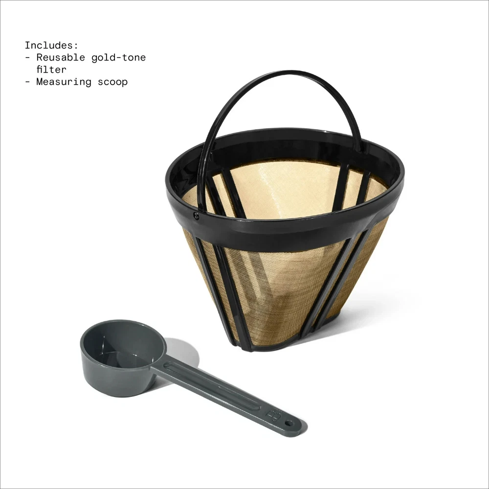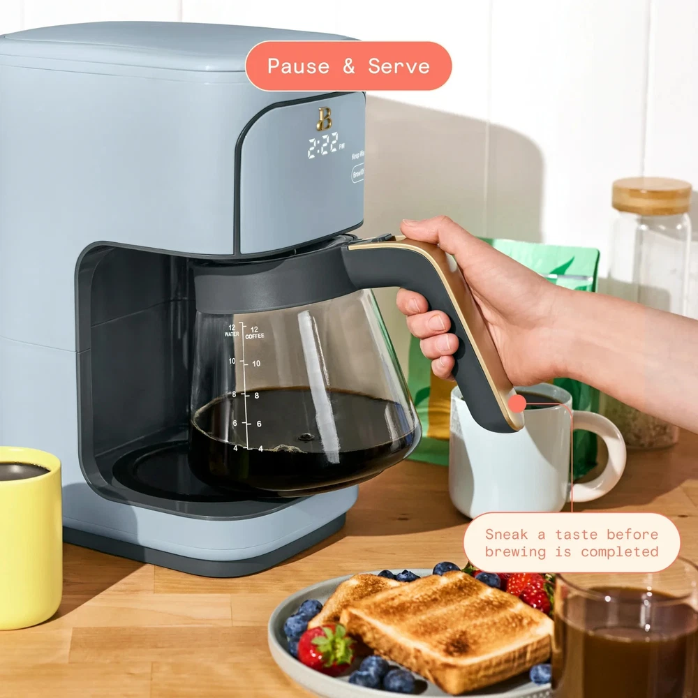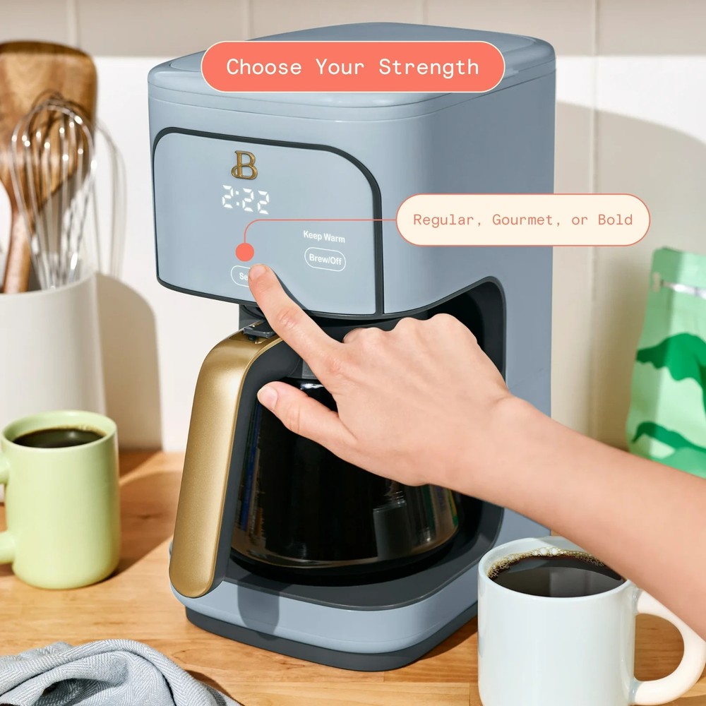 Product details Start your day with the stylish Beautiful 12-Cup Programmable Coffee Maker by Drew Barrymore. Featuring an elegant design, it boasts smart features for brewing rich coffee. Select from Regular, Gourmet, or Bold strength settings. Brew a full pot or a few cups with 24-hour programming, complete with an auto shut-off and warming plate for convenience. Brews up to 12 (5oz) cups 1–4 Cup mode delivers bold flavor in smaller servings Choose from Regular, Gourmet, or Bold strength Fully programmable to brew your carafe up to 24hrs in advance Pause and serve lets you pour mid-brew Auto-clean reminder ensures optimal performance and flavor Keep Warm mode maintains temperature for up to 4hrs Nonstick warming plate is stain-resistant and easy to clean Large water tank holds up to 60oz Glass carafe, lid, reusable filter, and scoop are dishwasher safe Powerful 1200-watt brewing system Touch-activated display lights up when needed Includes reusable gold-tone filter and measuring scoop