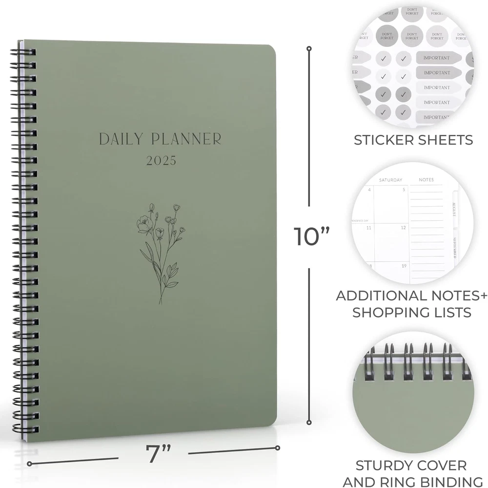 Store New Arrivals Add to Favorite View Feedback Contact Fast deliveries to the customer's home Quality customer service John Make the customers happy! Beautiful 2025 Daily Planner - 7" X 10" Daily Planner for Women or Men with Weekly & Monthly Spreads for Easy Planning - Perfect Calendar Book to Organize All Tasks and Boost Productivity Description In 2025 it’s Time To: Get the max. from your time & reach your full potential! The cute 7x10" daily planner is here to help you to foster better time & task management. It’s easier than ever for you to stay organized, reduce stress & enjoy more free time Plenty Of Space For Efficient Planning: Stay focused on your daily & weekly tasks, boost your productivity and manage your time wisely - ZICOTOs’ 2025 planner offers ample space with 1 week spread across 2 pages, a dedicated priority list and space for notes Perfect For Planning Ahead Smartly: Map out and coordinate your appointments, deadlines, errands & more with the clever monthly overview page, including a practical notes section, public holidays and a monthly tab for quick orientation Enjoy Convenient Extra Features: The daily planner has a few extra favors in store for you! Practical front and back pockets for letters, additional notes, shopping lists & more. On top of that 2 sheets of awesome stickers can be used for visual tags and reminders Your Beautiful Premium Planner: Reliably at your side day by day - thanks to a sturdy cover and top-notch ring binding. In addition, the modern minimalistic design makes the daily & weekly planner a gorgeous eye-catcher - durable, functional and simply beautiful ZICOTO Daily Planner: Make 2025 a fantastic year - with smart planning & less stress! Get things out of your head and onto this beautiful daily planner! It not only ensures that you won't let any appointments or deadlines slip, but also gives you well deserved peace of mind - lower your stress and boost happiness! Use the 7x10" planner to keep track of almost anything. In addition to a yearly overview on the back page, you have plenty of space to plan each month and day effectively. Want to add more notes or information? We’ve got you covered, with extra page for notes and a calendar overview back of the planner. Monthly overview from January to December 2025: Monthly planning ahead is great for balancing your workload conveniently! The planner shows monthly views (1 month - 2 pages), including public holidays and additional space for notes. To help you find the current month right away and to save valuable time, there are also monthly tabs. Weekly planner with 1 week over 2 pages: The weekly and daily planner will help you get things done on time. Prioritize the most crucial tasks of the week and organize your daily tasks smartly - be organized, plan smart & boost your productivity! Having an exact and neat list of things to do, truly speeds up the process and frees up time for leisure activities. Yay! Fun extra features: Stickers - you will love them! 2 sheets of stickers for visual tags and to mark important dates & more. Furthermore, there are 2 storage pockets for shopping lists, letters & more. Item model number zic-dpl25-sag_24-070a Sheet Size 7x10 inches Calendar Type Daily and Monthly Number of Items 1 Format Notebook, Organizer Color Sage Green Binding Ring-bound Cover Material Paper Material Paper Material Type Paper Manufacturer Part Number zic-dpl25-sag_24-070a Item Weight 15.5 ounces Product Dimensions 10 x 7.1 x 0.6 inches Ruling Ruled Year 2025 Target Audience Adult ABOUT US We offer the best prices around on high quality products. Our E-store includes media such as books, movies, music and games while offering electronics, toys, sporting apparel, clothing, tools, general home, garden items and more. SHIPPING We are always working hard to ensure your package arrives as soon as possible. Please understand that some factors like weather, high postal traffic, and the performance of shipping companies are outside of our control. We offer free shipping to the lower 48 states and ship within 2 business days of payment, usually sooner. We do not accept P.O. Boxes. Please provide a physical address. For shipping outside of the continental USA, we only use eBay's Global Shipping Program. The item is shipped to KY and then sent to the rest of the world. International customers are responsible for all duties and taxes. Continue to 'check out' to calculate costs for shipping the item to your country. Messages regarding eBay's Global Shipping Program MUST be directed at eBay EXCLUSIVELY. RETURNS We offer a 30-Day Return Policy on items in which you are not completely satisfied with. You have the option of a full-refund or an exchange of the item. No returns are available on items shipped outside of the USA PAYMENT We accept PayPal. CONTACT US This page content is yet to come Please ad us to your favorite seller and visit again later Thank You CUSTOMER SATISFACTION We try our very best to make sure every customer is completely satisfied. If there's a problem, message us! We're happy to help. WE ACCEPT