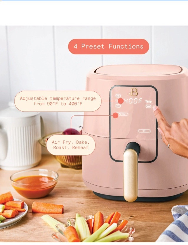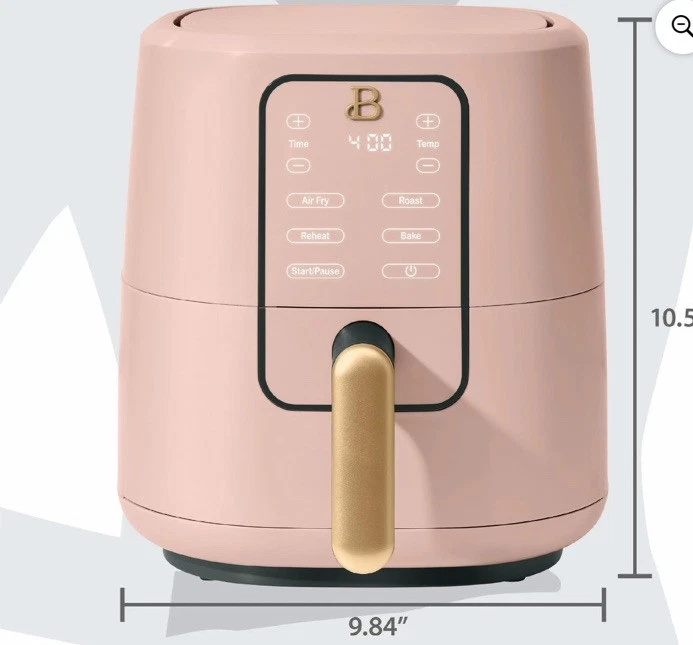 Oil Capacity: 3 qt Minimum Temperature: 170°F Material: Nonstick MPN: 19518 Power Source: Electric Power: 1200 W Item Weight: 8 lbs Maximum Temperature: 400°F Country/Region of Manufacture: United States Features: Digital Display, Non-Stick Type: Air Fryer Components Included: Basket, Handle, Instruction Manual Capacity: 3 qt Brand: Beautiful Color: Pink Number of Settings/Programs: 4 Model: 19518