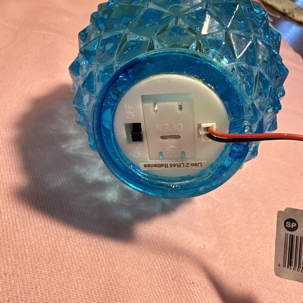 This is a beautiful blue pineapple night light from the 1990s. It emits warm white light in an indirect direction, suitable for low-light settings in any room. The lamp is made of glass, stands 5 inches tall, and has a traditional style. It is battery-powered with an on/off switch, making it convenient for use by teens, adults, and kids. Perfect for adding a touch of charm to any occasion. Lot LD