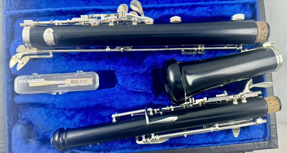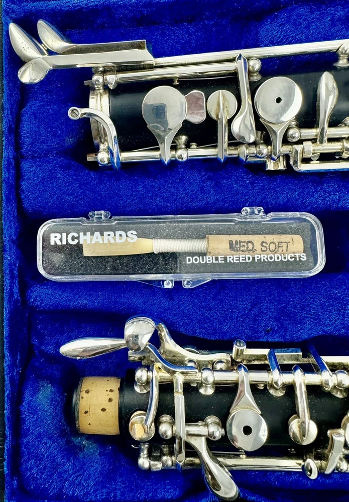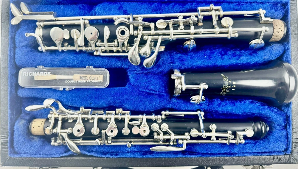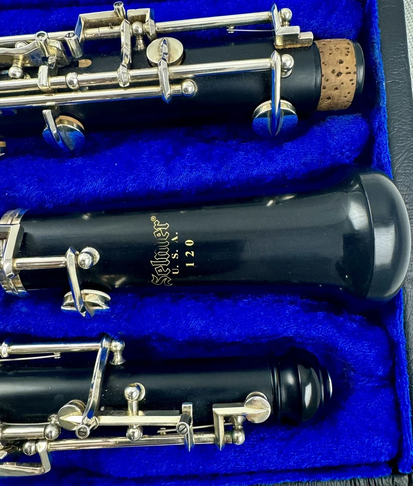 Beautiful Selmer Model 120B Intermediate Oboe, Full Conservatory, composite construction Store demo model. Selmer USA Oboe. No scratches or chips. No silver plating wear on key, bright and shiny. Woodwind shop tested and adjusted. Plays great. No work is needed. Pad, springs and corks are in excellent condition. No cracks or chips. Great deal! Includes nice original case and a new reed. Great oboe, Great deal!