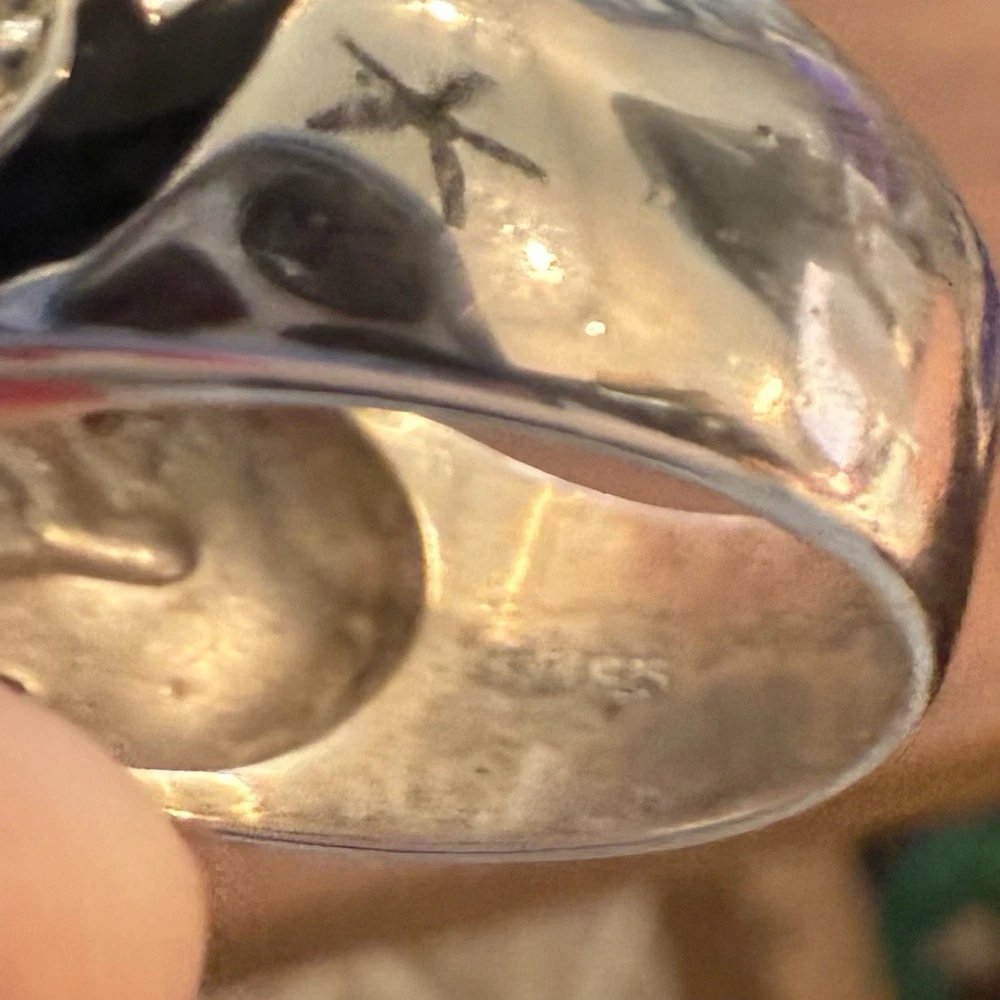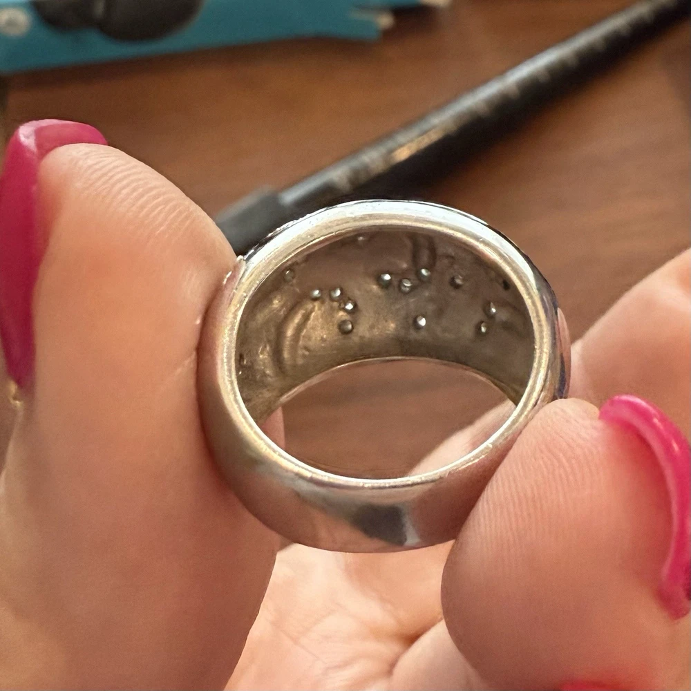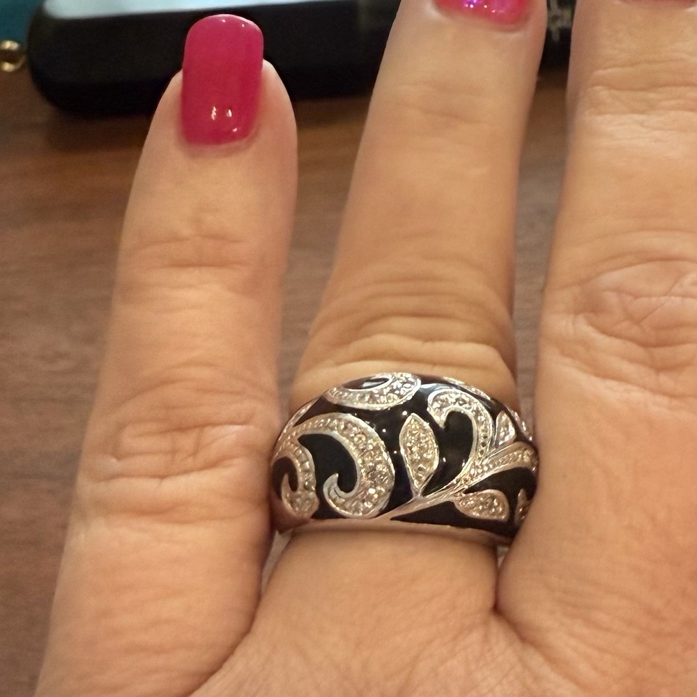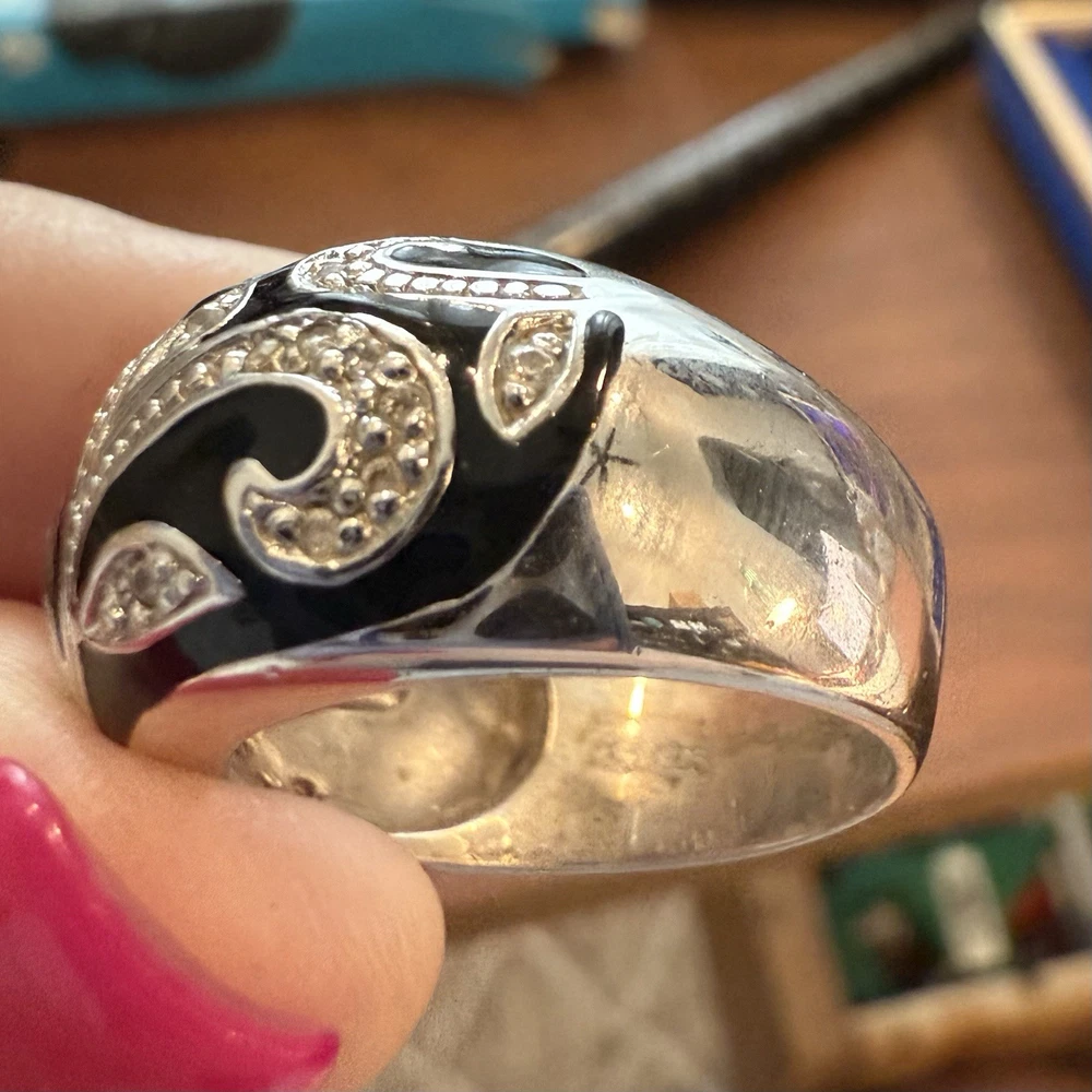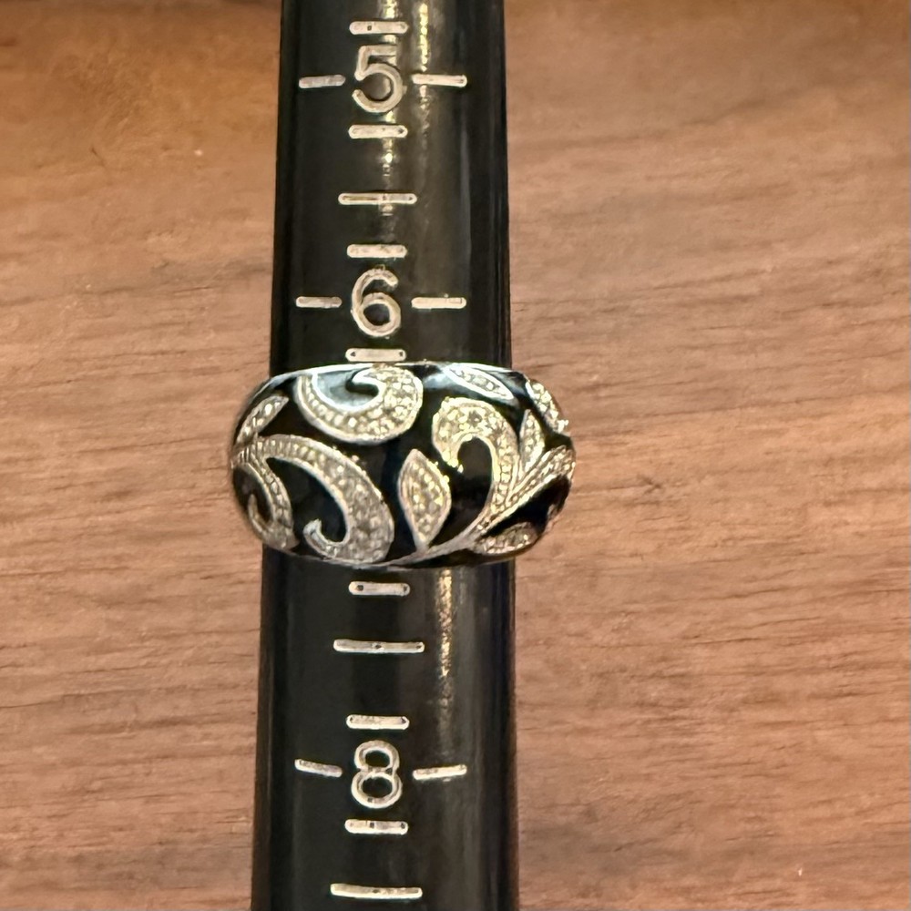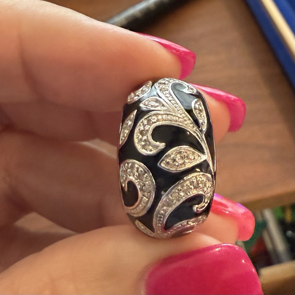 Crafted with precision, this Vintage ADI 925 sterling silver ring captivates with its elegant dome design and timeless style. The ring boasts a pavé setting, where cubic zirconia stones shimmer in a classic black enamel, creating a striking contrast that is both sophisticated and captivating. With a size 7 band, this piece promises a comfortable fit for its wearer. Reflecting a blend of inspirations, the ring embodies artistry and a retro flair, making it a versatile accessory for both casual and formal occasions. The designer nature of this piece ensures that it is unique, while the sterling silver composition ensures durability and a lasting shine. Whether it's a symbol of love or a statement of individual style, this ring is an exquisite addition to any jewelry collection. Please see photos as they are part of the description. Thanks for stopping by!
