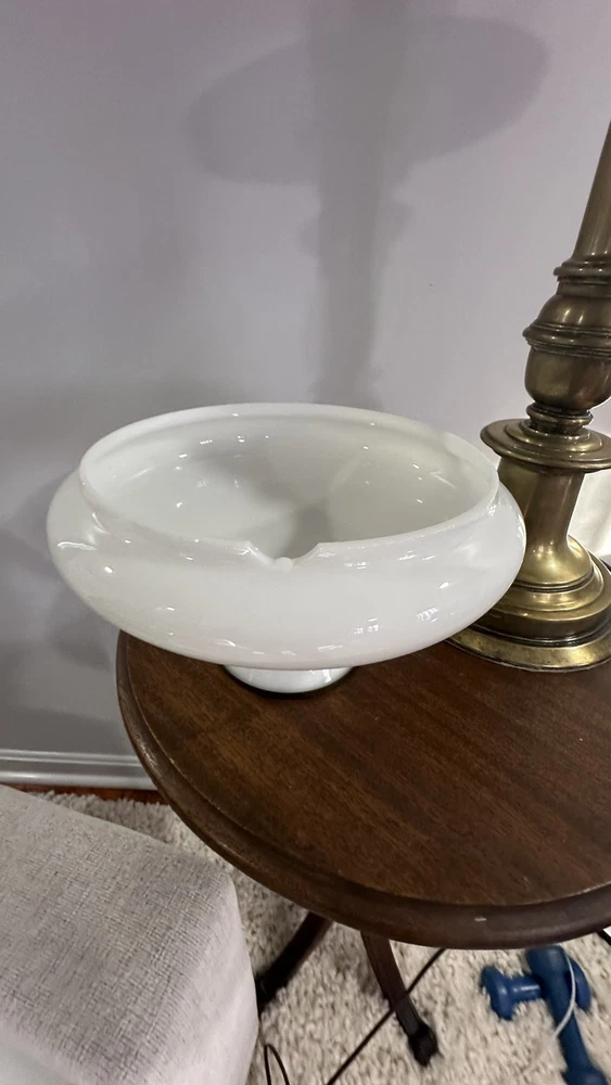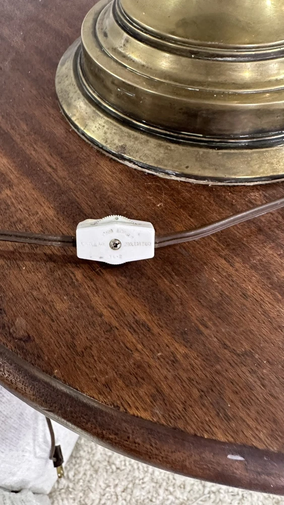 This is a vintage desk lamp crafted from brass in a mid-century modern style. It is an electric lamp that exudes an antique charm. Perfect for collectors or those looking to add a touch of vintage flair to their living or office space. It has an absolutely beautiful milk glass globe there is a small chip in the globe but you cannot see it when the globe is on the lamp. The lamp is heavy and stands approximately 3ft high.