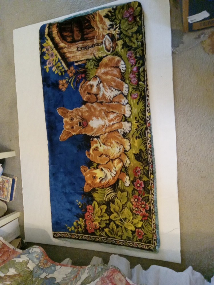 This pillow cover features a beautiful vintage design of a Corgi dog with three pups, made from a tapestry material. The cover measures 35x17 inches and has a zip closure. The design is colorful and retro, perfect for a kids' room or any vintage-themed decor.