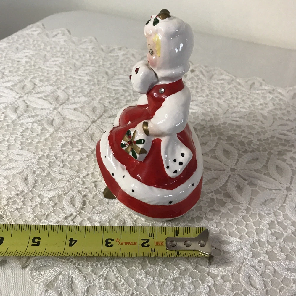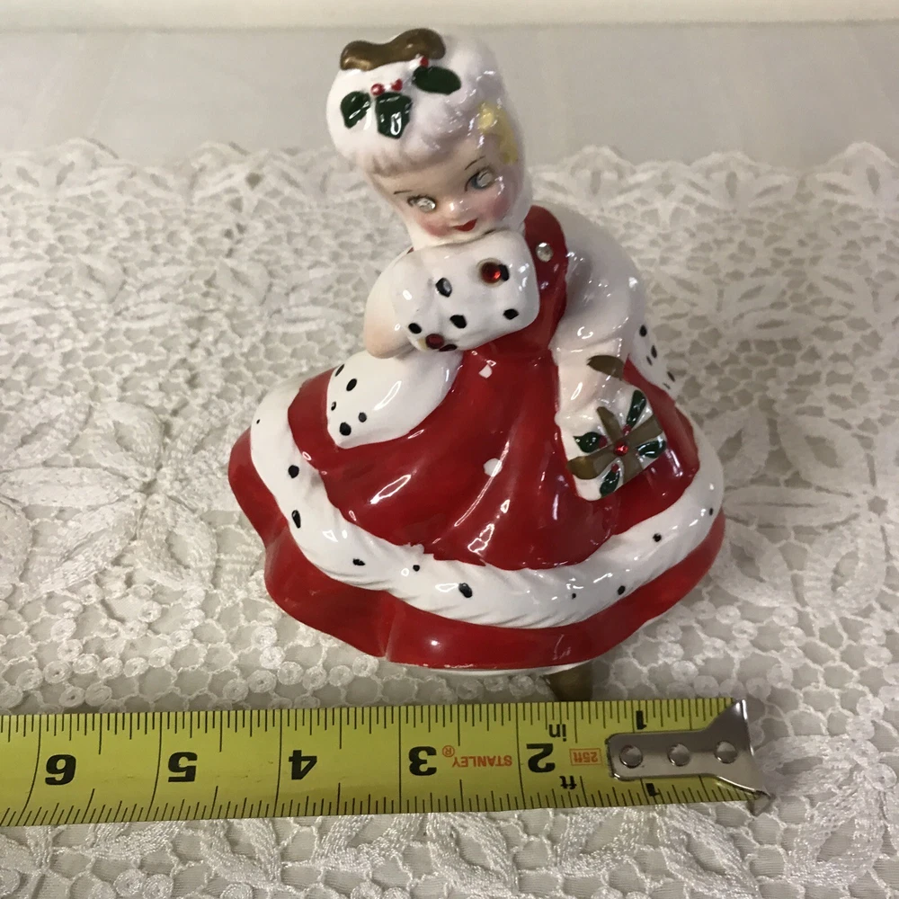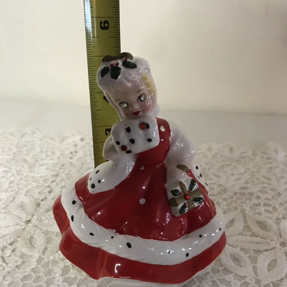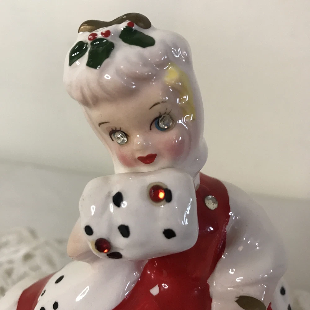 She is beautiful! There are a few missing rhinestones on her dress. Her foot has sone missing paint but it is not chipped. Sone missing red paint in tiny miniature spots bit overall awesome! I will package carefully so she doesn’t get broken or cracked in shipment.