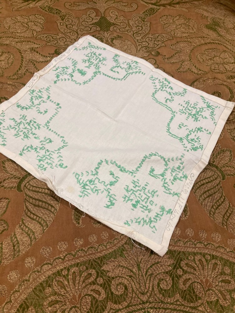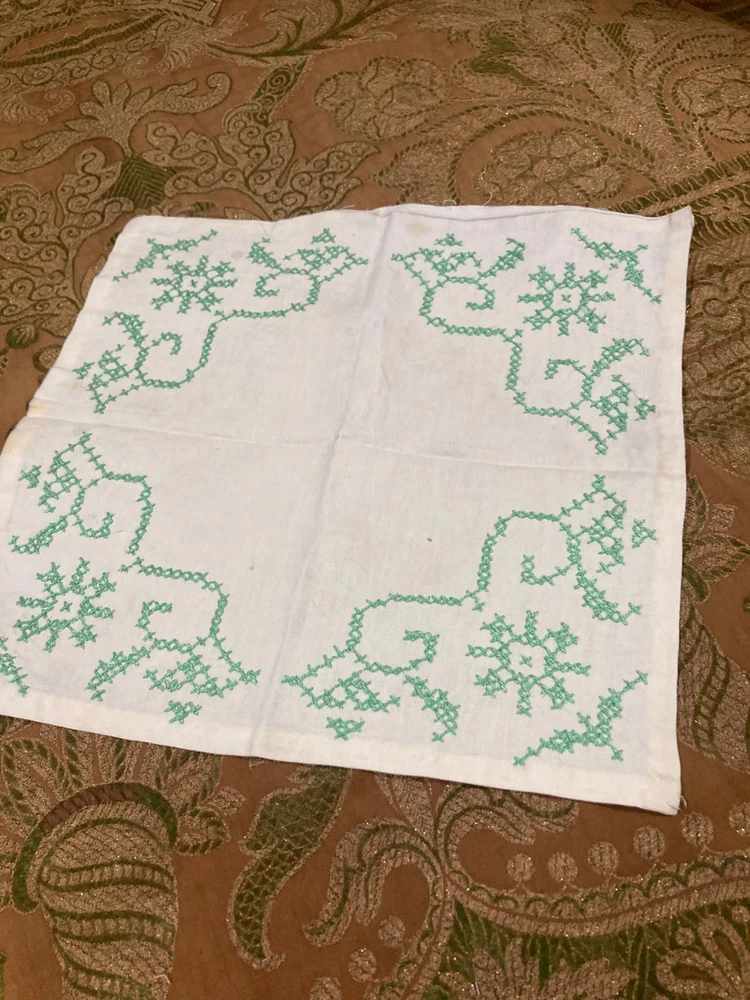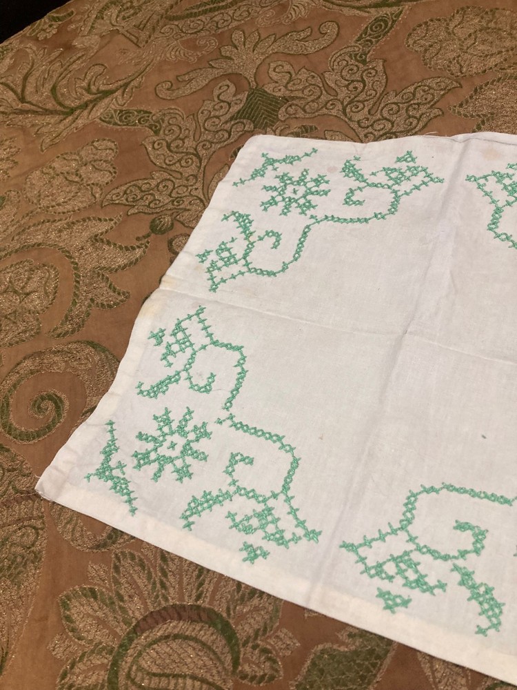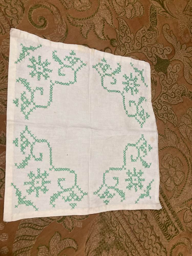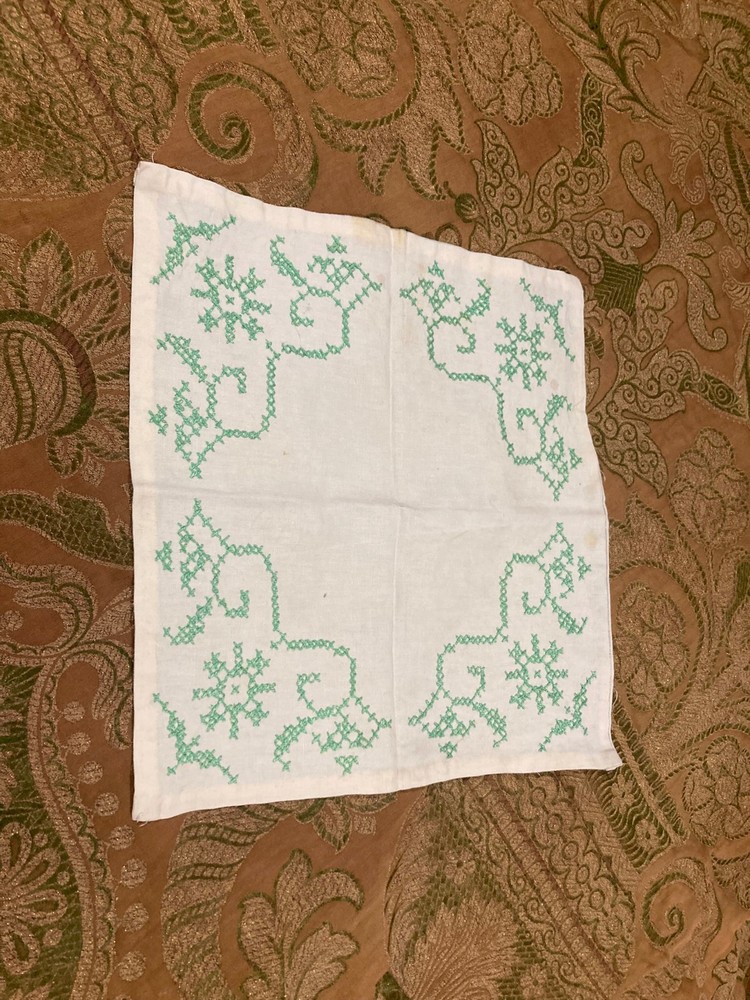 Vintage White Linen Doily with Green Cross Stitch Embroidery - 12" x 12" - Floral Design Measurements: 12" x 12" (square) Condition: Vintage This charming vintage linen doily features delicate green cross stitch embroidery in a pretty floral and vine pattern at each corner. A lovely example of vintage needlework! Features: White linen fabric Green cross stitch embroidery Floral and scrollwork motifs in each corner Four symmetrical corner designs Hand-embroidered details Square shape Simple, elegant vintage style Condition Notes: Shows vintage wear including some discoloration, age spots, and general signs of use consistent with age. Please review photos carefully. Perfect For: Vintage table décor Under lamps or decorative items Tea time or coffee table accent Shabby chic or cottage décor Framing as textile art Vintage linen collectors Cross stitch enthusiasts Wedding or special occasion décor Gift for needlework lovers Display in china cabinet A sweet piece of vintage handwork! The green cross stitch corner designs add a fresh, cheerful touch to this classic white linen doily. Authentic vintage hand embroidery - 12" square!