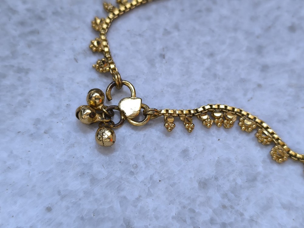 This beautiful vintage anklet in Indian style is a stunning piece of jewelry perfect for special occasions like engagements and weddings. The round disc-shaped charm with a gold color and intricate details showcases the traditional Indian design and craftsmanship. The anklet exudes a bohemian and ethnic vibe, adding a touch of beauty and artistry to any outfit. Imported from India, this unique piece is sure to make a statement and add a touch of vintage elegance to your ensemble.