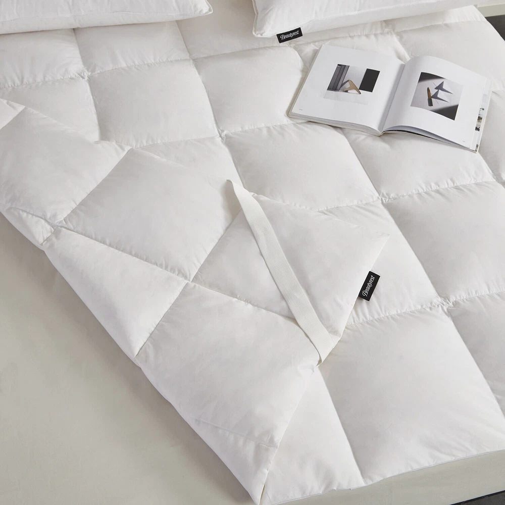 Details:Slumber in luxury on this white down mattress topper by Beautyrest. Mattress topper filled with white down for plushness and comfort. The lightweight 55-percent Tencel / 45-percent cotton shell has a 240-thread count for ultimate softness, and the end to end box construction keep the white down fill evenly distributed and in place for lasting comfort. Mattress topper comes with corner elasticized anchor bands to hold the topper in place at all times. 240 thread count 55-Percent Tencel / 45-percent cotton cover End to end box design Elasticized anchor bands in each corner Filled with white down 650 Fill power FreshLOFT process ensures that the feather / down material is clean of dust, dirt, and allergens Certified by the American Down And Feather Council Dry clean Free Shipping Over $49.99* Details Beautyrest Tencel White Down Mattress Topper Product Description: Details: Slumber in luxury on this white down mattress topper by Beautyrest. Mattress topper filled with white down for plushness and comfort. The lightweight 55-percent Tencel / 45-percent cotton shell has a 240-thread count for ultimate softness, and the end to end box construction keep the white down fill evenly distributed and in place for lasting comfort. Mattress topper comes with corner elasticized anchor bands to hold the topper in place at all times. 240 thread count 55-Percent Tencel / 45-percent cotton cover End to end box design Elasticized anchor bands in each corner Filled with white down 650 Fill power FreshLOFT process ensures that the feather / down material is clean of dust, dirt, and allergens Certified by the American Down And Feather Council Dry clean only Dimensions: Twin39" W x 75" L, filled with 14 ounces Full54" W x 75" L, filled with 19 ounces Queen60" W x 80" L, filled with 22 ounces King78" W x 80" L, filled with 28 ounces Down and feather-filled products are packaged tightly during shipping. Upon receipt, remove this item from its packaging, fluff gently, and allow several hours for full loft recovery. In addition, products sealed in plastic packaging sometimes have a disagreeable scent because of concentrated natural fibers. A few hours of airing typically removes the odor.