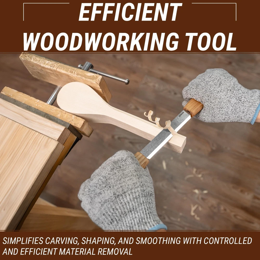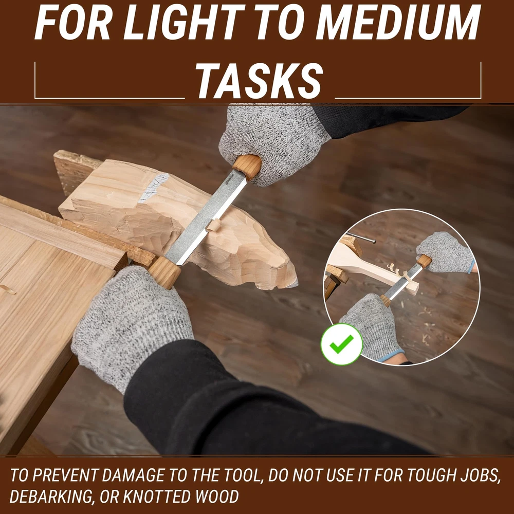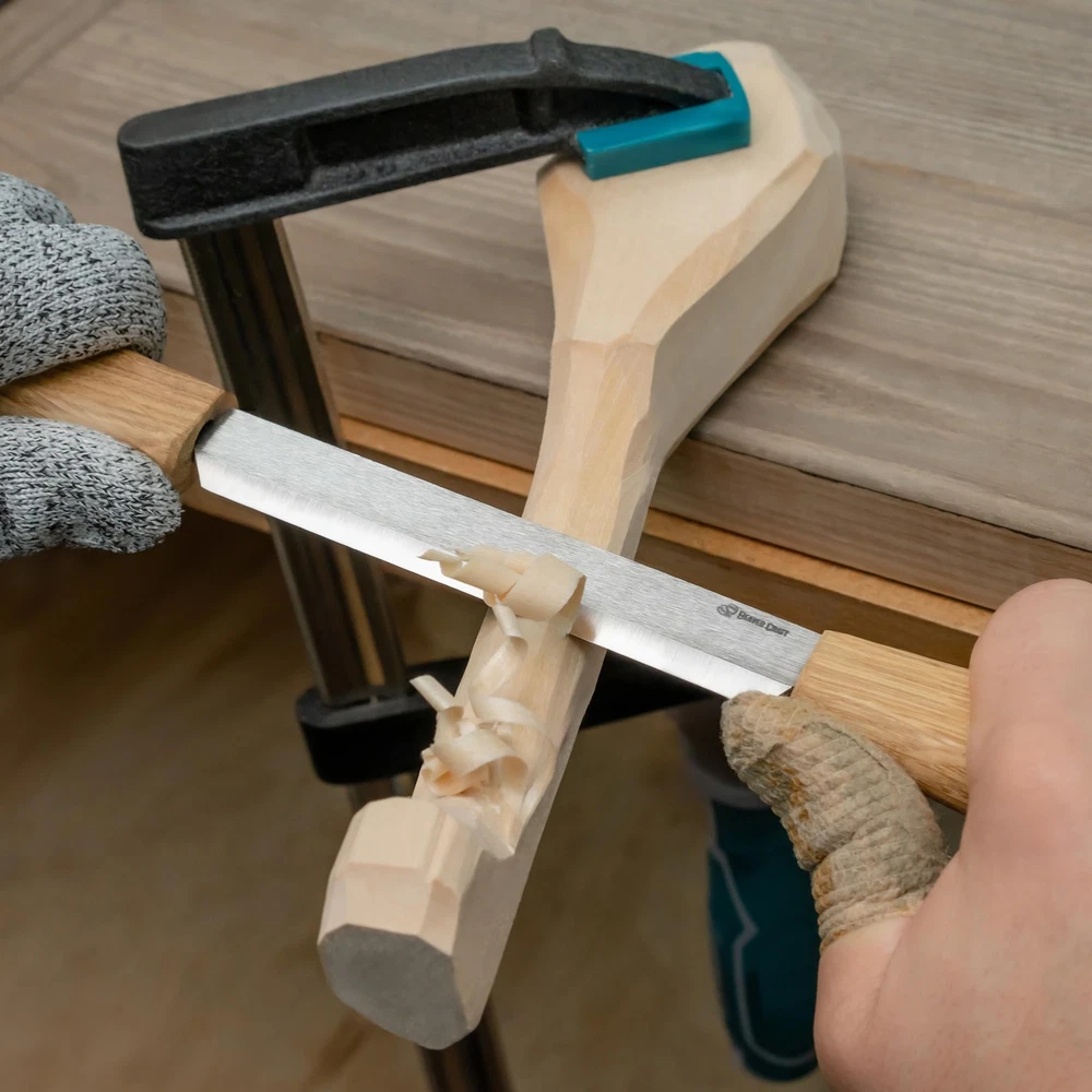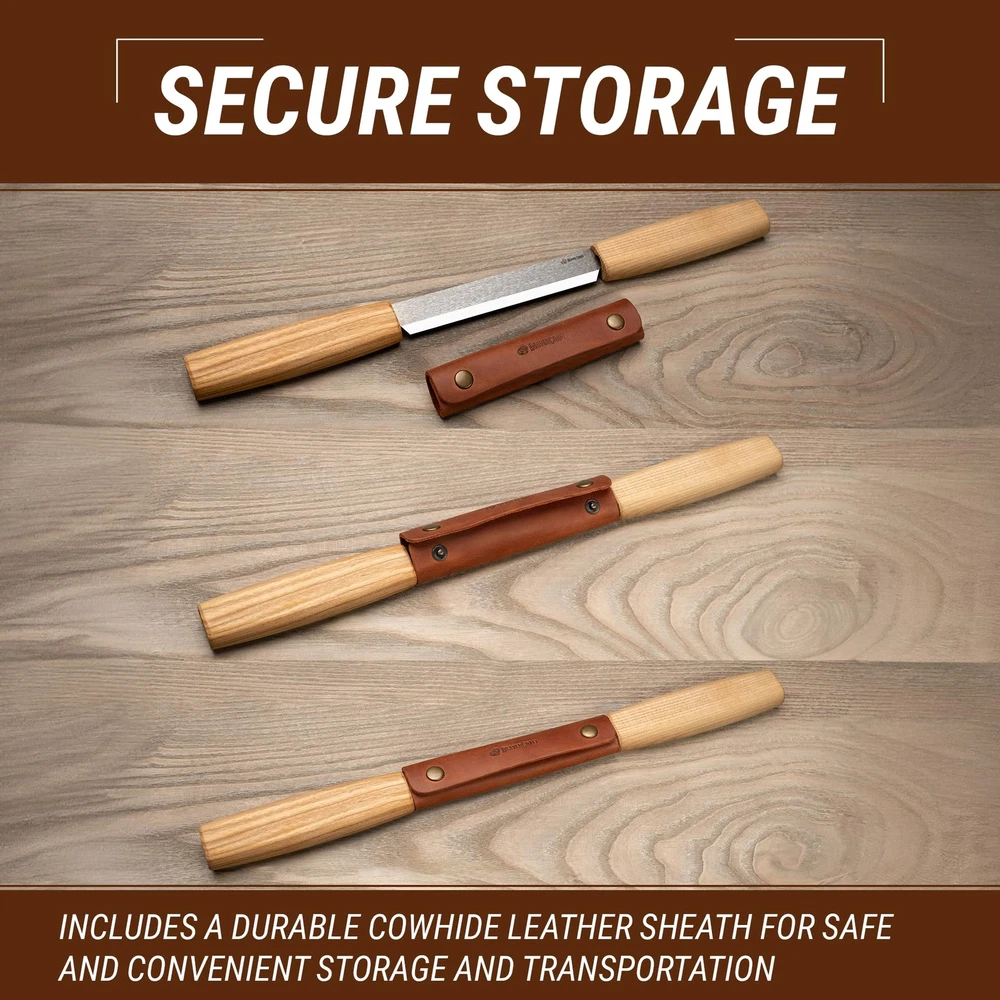 5 IMPORTANT FACTS TO KNOW ABOUT THE DRAW KNIFE: ☑️ Before using the drawknife, it’s important that you become familiar with the splitting knife. The wood carving tool should be gripped in both hands with the bevel facing up, and then gripped again with the bevel facing down. The roughing knife should feel the same regardless of which direction the wood splitting knife bevel is facing. ☑️ The drawing knife is capable of making straight cuts as well as complex curves and concaves and debarking. The straight cuts can be achieved by starting in the center and working to the end. The wood is then reversed so that the thicker end of the wood is shaved to match the center and the end that was just completed. ☑️ The handle of this bark knife is fixed so it doesn’t move which is good for you not to be distracted by inappropriate rotating and wasting time on the mini drawknife to be adjusted. ☑️ Always search for the high carbon steel blade if you’re into durable items. Our wood draw knife follows this idea that’s why you’d be pleased by the quality of our rough edge knife. ☑️ We made sure to provide our customers with the wood carving tools & green woodworking tools prepared for the woodworking right out of the package. Our small draw knife is sharpened and polished before a straight edge knife goes to the package. IN CASE OF ANY TROUBLESHOOTING: just message us in private with any question you have about green woodworking tools! 35 days MONEY BACK GUARANTEE: If for some reason you’re not satisfied with the drawknife tool and we are not able to help you out, then we’ll do a full refund, no questions asked. Buy Now! Click the orange "Add to Cart" button and start crafting your masterpieces with the high-quality wood carving knife! Draw Knife Functions: the splitting knife is a wood carving tool that simplifies the drawing and shaping of wood by removing shavings or larger chunks of excessive wood. Wood Splitter Razor Sharp: the blade of the roughing knife is made of high-carbon steel and is hardened to proper firmness, sharpened and polished so you can use a drawing knife right out of the box. Draw Knife Cutting Edge: very sharp, allows you to cut softwood & hardwood, durable enough to cut hard and soft woods. NOTE! The draw knife is designed to work with wood without bark or knots! Wood Splitter Ergonomic Handles: are made of hardwood oak and finished with natural linseed oil. Their ergonomic design allows having a long period of work without hand fatigue. Draw Knife from Europe: everything made by BeaverCraft gives European quality brought by producing effort from Ukraine.