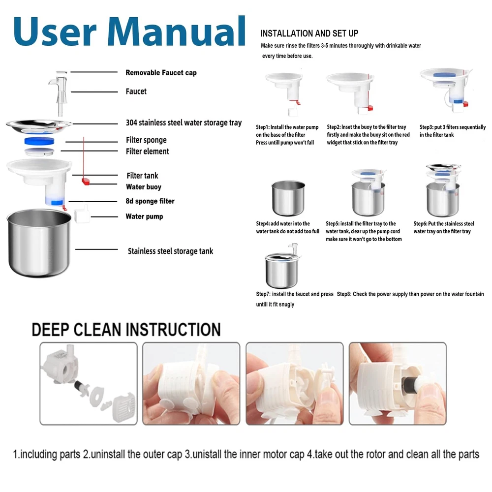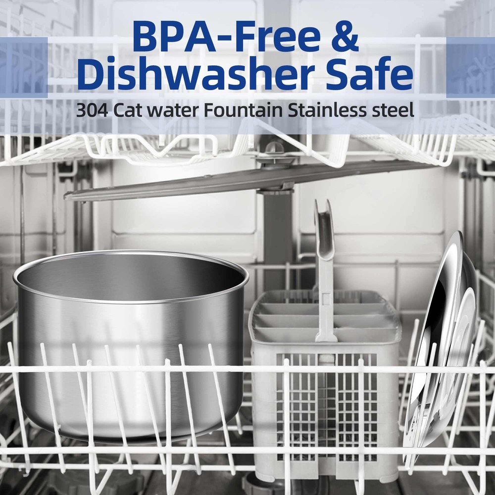 Homtyler cat water fountain is made from food grade 304 stainless steel BPA-free, and Homtyler pet fountain is also durable, hygienic,helping pets drink more water helps their health, and Homtyler pet water fountain is also suitable for small dogs.