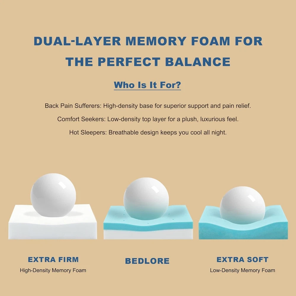 Bedlore 4-Inch Twin Mattress Topper for Back Pain - Dual Layer Twin, White Product Details Brand: BEDLORE Color: White Size: Twin Fabric Type: 40% Rayon Derived from Bamboo, 60% Polyester, Memory Foam Special Feature: Comfortable, Washable, Breathable Closure Type: Pull On Product Care Instructions: Machine Wash Water Resistance Level: Not Water Resistant Age Range (Description): Adult Manufacturer: BEDLORE Product Dimensions: 75 x 39 x 15 inches Item Weight: 12.17 pounds Dual Layer Design: The twin memory foam mattress topper features a 4-inch dual-layer design, combining 2-inch of gel-infused memory foam and a 2-inch pillow top Relieve Pain - Support: The twin mattress topper conforms to the curve and shape of your body, helping distribute weight evenly and reduce pain in the hips, back & neck Stay Cool All Night: Made with breathable viscose derived from bamboo fabric, the mattress topper twin keeps comfortably cool all night Deep Pocket Design: The elastic deep pocket fits mattresses up to 15" and ensure a secure fit even during restless nights Vacuum Package: Please leave it in a well-ventilated place for 24-72h to allow the smell of foam to dissipate and restore the fluffiness of the topper