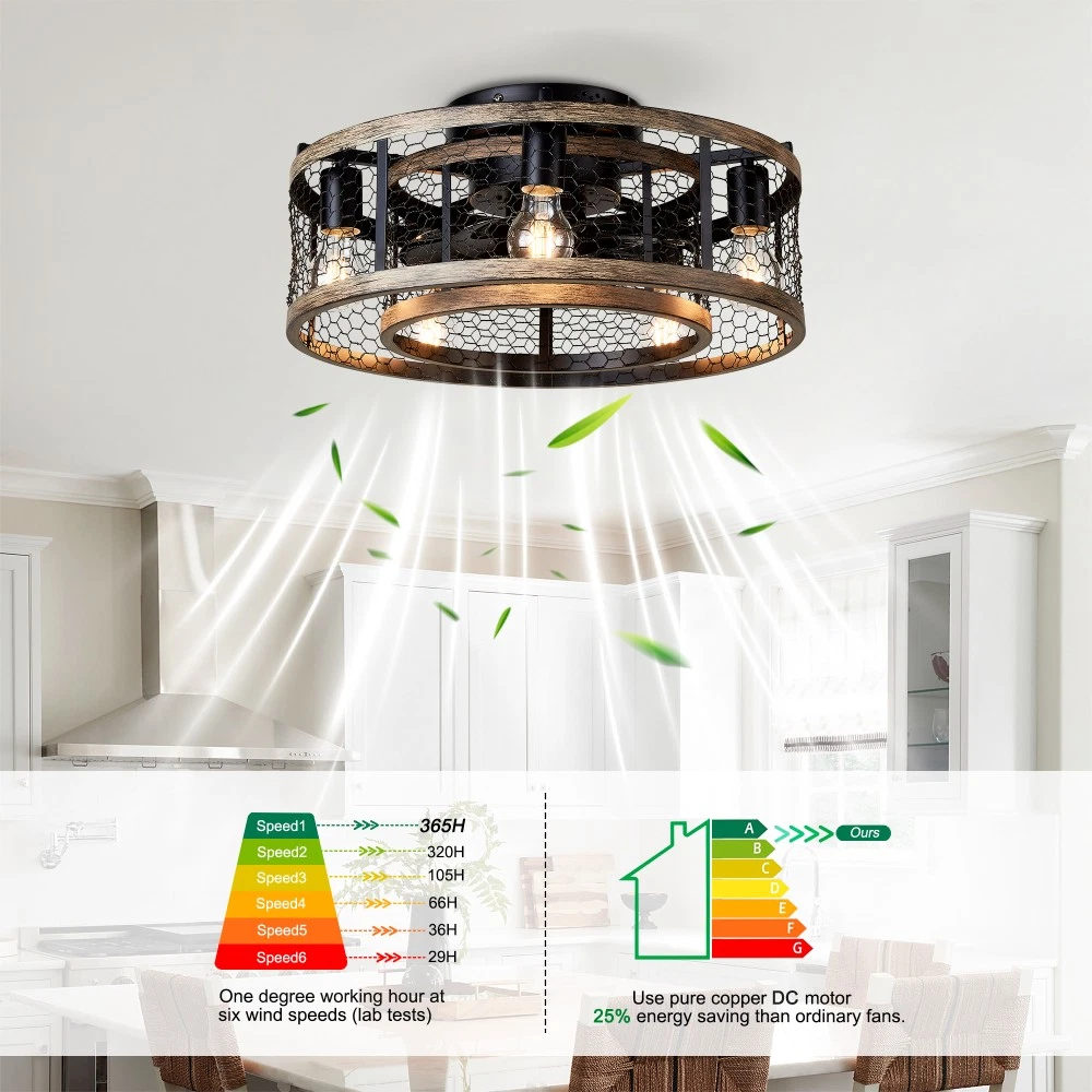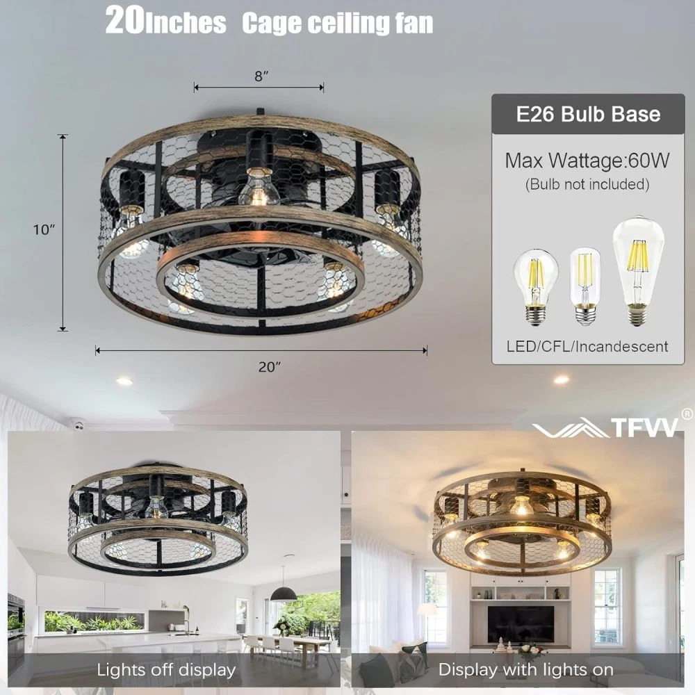 đ Key Features & Why Youâll Love It 2-in-1 Chandelier & Ceiling Fan Design This caged fan blends a stylish iron chandelier aesthetic with functional airflow, adding a regal, hazy charm to bedrooms, living rooms, dining rooms, or kidsâ rooms. Requires 5 x E12 bulbs (max 25W each, bulbs not included ). Convenient Remote Control Operation Easily adjust fan speed and turn lights on/off from anywhere in the roomâno need to reach for switches. Quiet Reversible Motor for Year-Round Use Enjoy nearly silent operation while switching airflow directionsâcool breezes in summer and heat distribution in winter. Easy Installation in Minutes Most components come pre-assembled. Follow simple steps to install this low-profile fan quickly, with a semi-open design that makes bulb changes a breeze. đ Product & Package Details Assembled Dimensions : 20.00â L x 20.00â W x 10.00â H (compact size ideal for various room sizes). Product Weight : 10.45 lbs (sturdy yet easy to handle). Package Dimensions : 20.50â L x 20.50â W x 11.40â H Package Weight : 12.10 lbs (securely packed for transit). ⨠Hassle-Free Shopping Guarantees 1-Year Warranty : We stand behind our product! Enjoy a 1-year warranty against manufacturing defectsâweâll help fix or replace if anything goes wrong. 30-Day Free Return & Exchange : Not satisfied? Return or exchange within 30 days for free (just keep the product in original conditionâno questions asked). đ Perfect Gift for Homeowners & Design Enthusiasts This caged ceiling fan is a thoughtful gift for anyone upgrading their spaceâideal for housewarmings, birthdays, or as a stylish blend of function and decor. Order now and transform your beauty space-with our warranty and free return policy, you have nothing to lose!