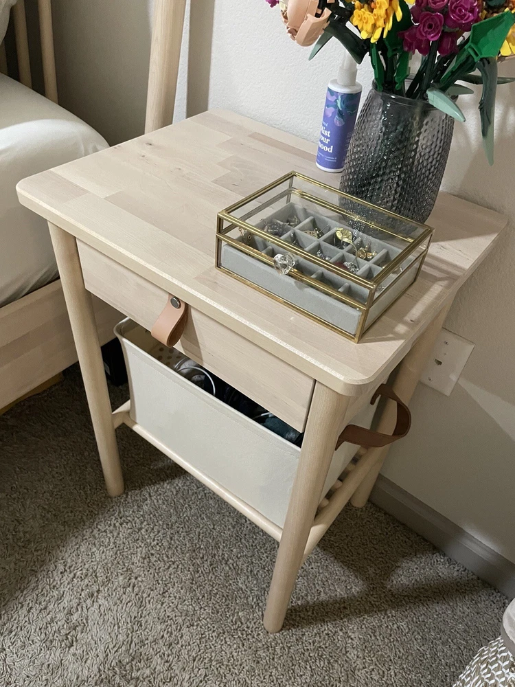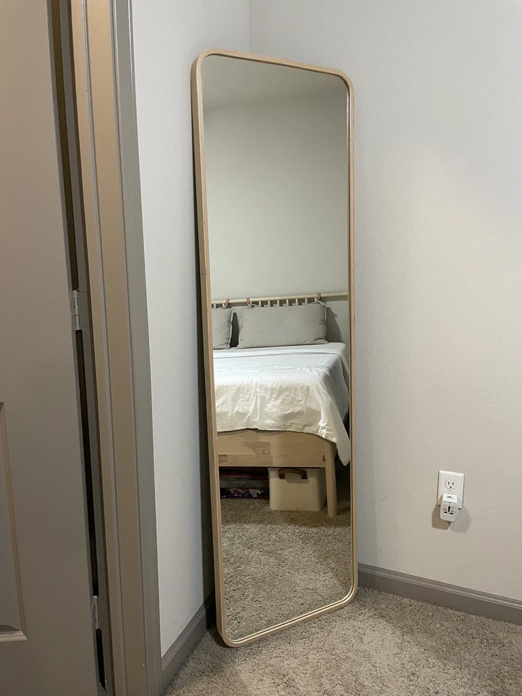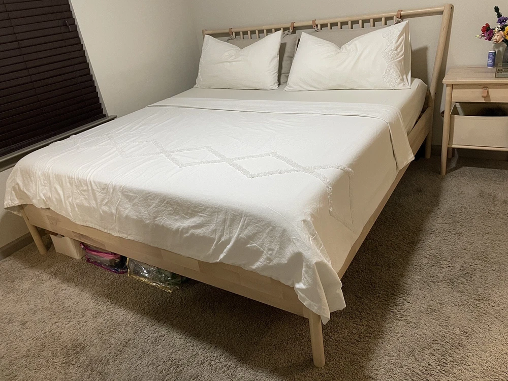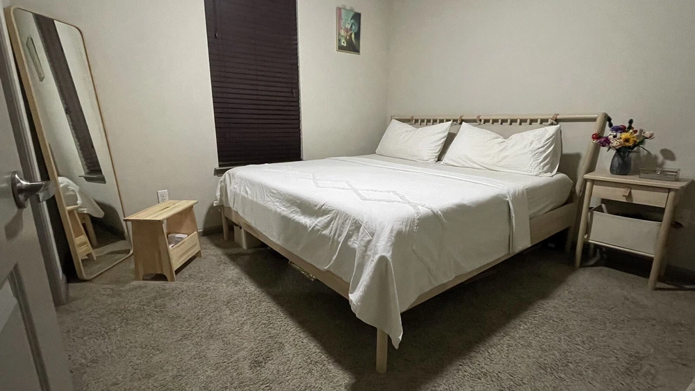 Entire Bedroom Set from IKEA in as good as NEW condition. Set Includes King Size Bed, a Night Stand, Full Height Mirror with stand, a small Stool Table from IKEA, Mattress from Purple and Pillows as shown in the photo.