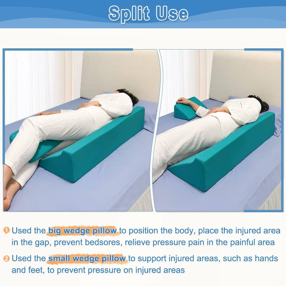 Wedge Pillow For Side Sleepers Different designs bring patient a better experience. Multi-function Bed Wedges for Bed Sores:Take care of your body and let you sleep more peacefully. Distinctive Design ➀All the bed wedge pillows for side sleeping on the market are one-piece, and we design foam wedge for sleeping as detachable, allowing you to combine them flexibly. ➁When used as a whole, bedsore turning wedge can be used for leg lifting, pregnancy positioning, blanket support, ankle positioning, etc.Hospital pillow is also a treatment for bed sores on buttocks ➂Used the big medical wedge to position the body, place the injured area in the gap, prevent bedsores, relieve pressure pain in the painful area. It is an excellent product for bedridden patients ➃Used the small incline pillow to support injured areas, such as hands and feet, to prevent pressure on injured areas. High Quality ➀Bright breathable pillowcase, super breathable, skin-friendly and comfortable, won't make your skin feel uncomfortable. ➁inner core of bed pillows & positioners pillow is soft foam, but strong enough to support you without collapsing from prolonged use. Multifunction ➀Helps you relax muscles, reduce pressure sores, relieve pain in injured areas, improve blood circulation, and help patients reposition. Which makes your home and hospital care easier. ➁Bed pillow for side sleeper can be used for shoulder injuries, leg injuries, hand injuries, pregnancy, elderly, lower limb fractures, disabled people, etc. ③You can also put the small positioning wedges for bed sores in any place that makes you feel comfortable, even if you are healed. 【Innovative Design】Hollow out in the middle of the Bedsore turning wedge enhances air flow and avoids direct contact with the sacrum/coccygeal area, reducing pressure on the spine, helping to distribute weight evenly, and protecting the coccygeal bone from touching the sitting surface, thereby reducing bedsores, facilitating recovery of the injured area, and relieving pain. 【Combined into One】Insert small bed wedges & body positioners to support your lower back and keep your spine aligned to help bedridden patients sleep on his side and roll over. Small bedsore treatments support injured areas after surgery and can be used as home positioning pillows even after healing. 【Release Stress】Bed wedges for bed sores use their unique shape to relieve pressure on the back, lumbar spine, spine, ribs, butt, abdomen, and legs, helping to rotate and position your loved ones or elderly patients, and preventing bedsores. 【Oversized】Larger than most post surgical medical pillow on the market, length of incline pillow is 34.2inch, specialty bedridden patient turning device are suitable for more people, Incline pillow is a boon for tall people, you can use it even if you are tall.In addition, wedge pillow for sleeping is also suitable for hospital bed. 【Long-term Use】Comfortable polyester-cotton pillowcase protects your wedge cover from dust, easy to keep your pillow clean, invisible zipper is beautiful and easy to remove and machine wash, positioning wedges for bed sores can be used for a long time without getting dirty .