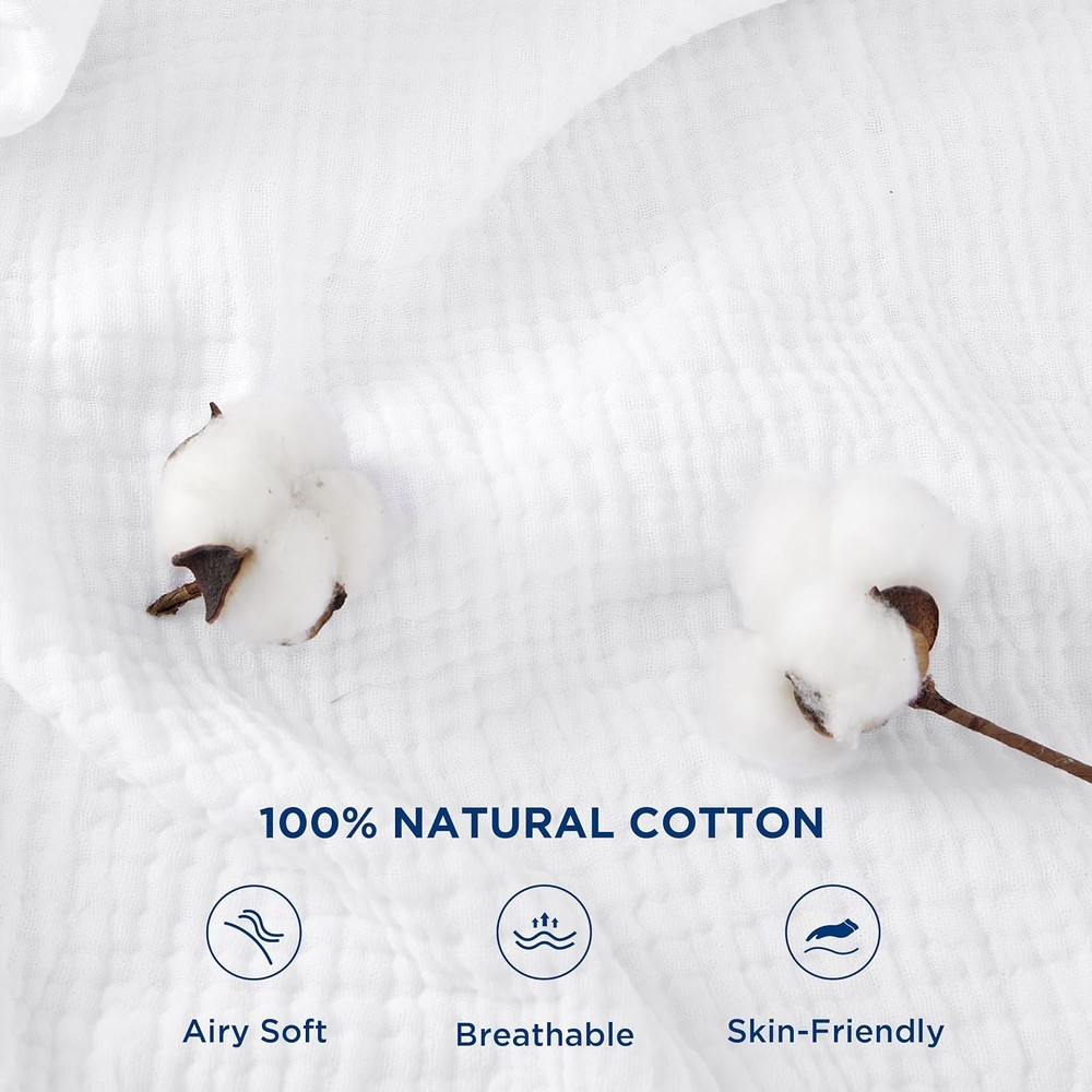 Bedsure 100% Cotton Muslin Blanket Queen (90" x 90"), 03 - White Product Details Material: Cotton Color: 03 - White Brand: Bedsure Special Feature: Lightweight, Soft, Breathable Style: Casual Blanket Form: Throw Blanket Age Range (Description): Adult Product Dimensions: 90"L x 90"W Theme: Plain Pattern: Solid Recommended Uses For Product: Reading, Napping, Layering Seasons: All, Summer, Fall, Spring Fill Material: Cotton Weave Type: Jacquard Product Care Instructions: Machine Wash Size: Queen (90" x 90") Fabric Type: 100% Cotton Unit Count: 1.0 Count Number of Items: 1 Fabric Warmth Description: Lightweight Sport: Camping Water Resistance Level: Not Water Resistant Manufacturer: Bedshe Item Weight: 3.14 pounds Department: Unisex Country of Origin: China Refill: Cotton Batteries required: No 100% Cotton Ultra-Breathable: This lightweight and airy jacquard muslin summer blanket offers exceptional breathability and moisture absorption, providing you with sweat-free and refreshed comfort all year round. Soft & Skin-friendly: Made from 100% skin-friendly and anti-static cotton, these muslin blankets for adults feature a gentle, delicate, and extra soft hand feel that gets even softer after washes. Enhanced Durability: This OEKO-TEX certified muslin throw blanket is upgraded with four layers, providing enhanced durability against wear and tear. Its higher yarn density and tighter knit braid ensure it can withstand washes without deforming or fading. SLEEP LIGHT: The blanket is ultra-thin yet cozy, breathable yet warm, making it ideal for banishing sticky nights with its moisture-wicking, cloud-soft fabric that feels like nothing. Casual Style: This cotton blanket comes with a unique relaxed texture and delicate hand stitching, adding a peaceful and unfussy vibe to your room that requires little effort to maintain.
