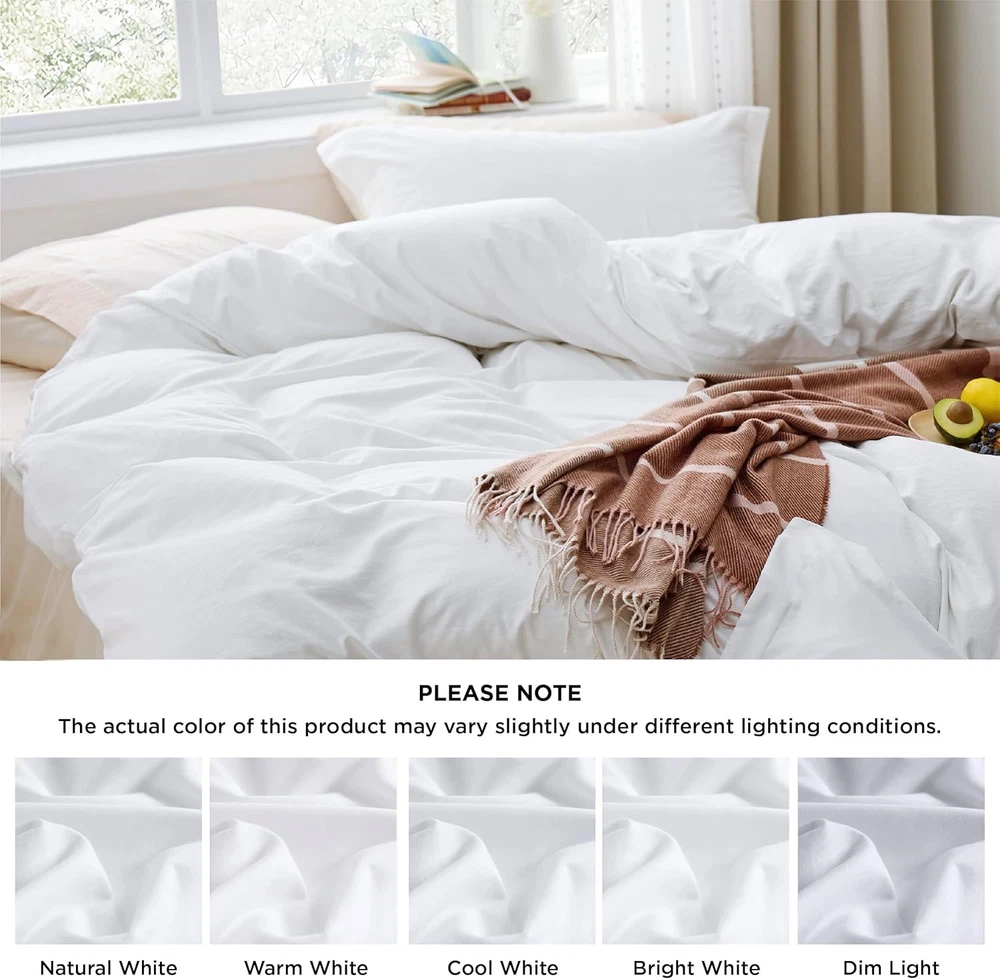 Bedsure White Duvet Cover Queen (90" x 90"), 00 - (No Comforter) Product Details Size: Queen (90" x 90") Material: Polyester Color: 00 - White (No Comforter) Pattern: Solid Brand: Bedsure Number of Pieces: 3 Special Feature: Extra Soft, Lightweight, Fade Resistant, Tear Resistant, Breathable Style: Modern Included Components: No Comforter, 1 Duvet Cover (90" x 90"), 2 Pillow Shams (20" x 26") Closure Type: Zipper Age Range (Description): All Ages Occasion: Wedding, Mother’s Day, New Year’s, Birthday, Father’s Day Product Care Instructions: Machine Wash, Do Not Bleach Theme: Casual Seasons: All, Winter, Summer, Spring Item dimensions L x W x H: 90 x 90 inches Item Weight: 3.2 Pounds Pillowcase Quantity: 2 Unit Count: 1 Count Item Display Dimensions: 90 x 90 inches Manufacturer: Bedshe Item Weight: 3.15 pounds Item model number: Duvet Cover Set-Washed Cotton Like Is Discontinued By Manufacturer: No Fabric Type: 100% Polyester Perfume: Unscented Batteries required: No 100% Polyester Extra Soft: Featuring premium polyester microfiber material, this prewashed duvet cover set offers exceptional softness so you can enjoy a deep night's sleep. Smooth and breathable, its texture provides coziness without any crinkly noise. Lightweight: Crafted to maintain the perfect balance between weight and warmth. Ideal for usage all year round. Elevated Home Decor: With a relaxed vibe and gorgeous natural texture, Bedsure's duvet cover set fits seamlessly into any space. The solid hue–available in multiple colors–adds an extra element of personalization, making it easy to coordinate with your room's decor. Thoughtful Details: Eight corner ties inside the duvet cover ensure a secure fit to prevent the filling from bunching. The zipper allows you to seal off your comforter more quickly (and easily) than with a traditional button closure. Enhanced Durability: Made with unmatched quality, this long-lasting duvet cover set features neat stitching to create a more robust connection at the seams for improved durability. Bedsure's unique dyeing technique enhances the color while preventing fading. What You Can Get: This Bedsure queen duvet cover set comes with 1 duvet cover (90" x 90") and 2 pillow shams (20" x 26").