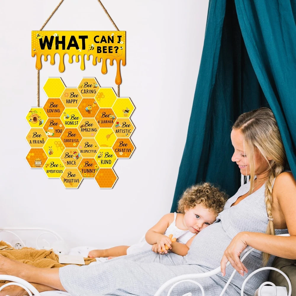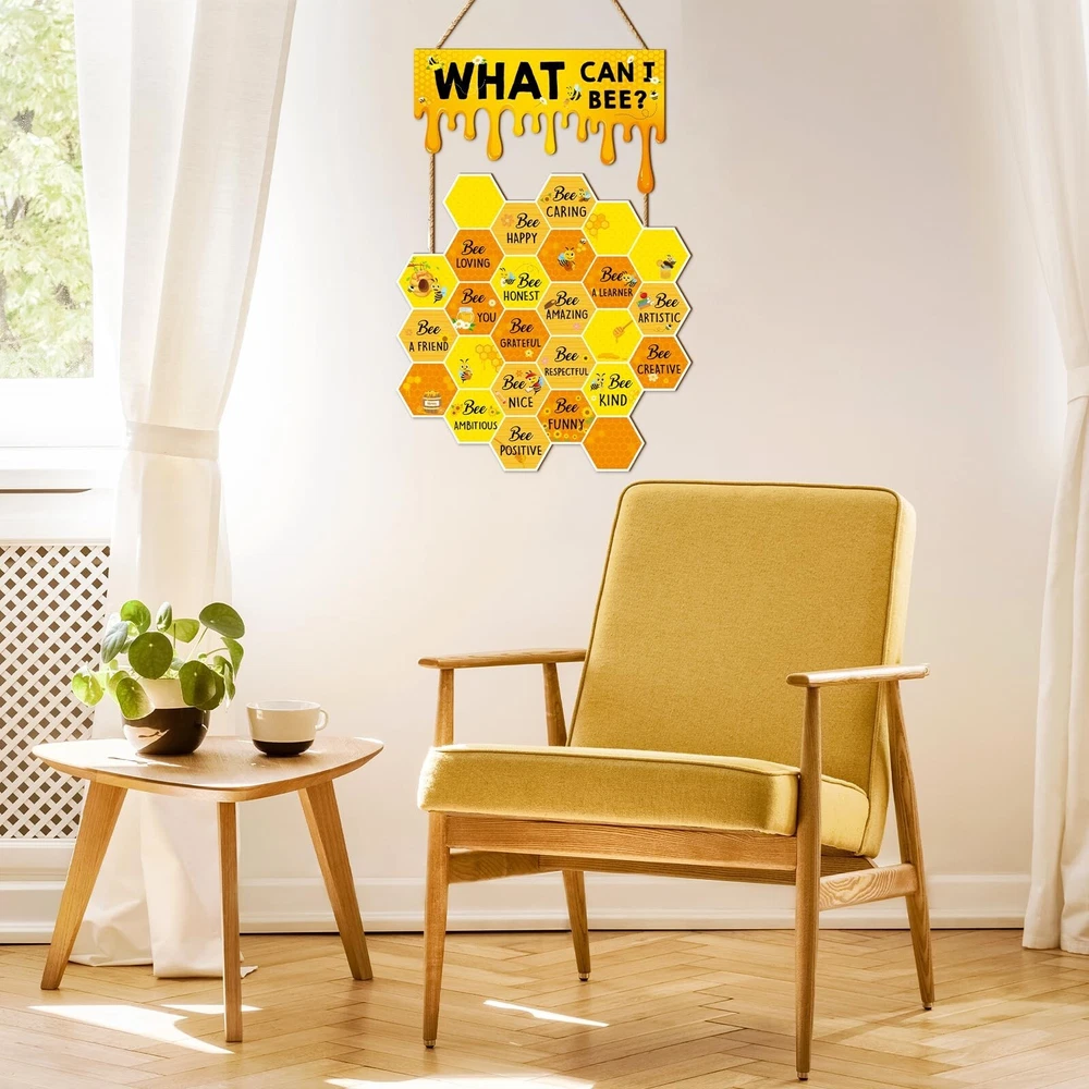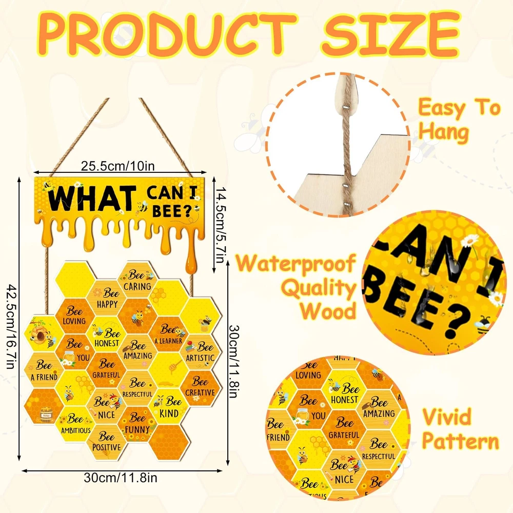 Bee Wall Decor Hive Rules Inspirational Wall Art Summer Wooden Hanging Sign for Back to School Classroom Office Bedroom Home Decor Product Details Style: Bee Brand: JarThenaAMCS MPN: J1182 UPC: Does not apply EAN: Does not apply Color: Yellow Brand: JarThenaAMCS Material: Wood Theme: Animal Recommended Uses For Product: decorating walls, windows, front doors, fences, classrooms, bedrooms, play rooms, living rooms, and offices; birthday parties, school activities, and bee-themed parties; gift for classmates, neighbors, friends, teachers, and others See more Product Dimensions: 4.7"L x 10"W Shape: Rectangular Style: Bee Pre-printed: What Can I Be?, Be Happy, Be Thankful, Be Grateful, Be Loving, Be Honest, Be Respectful, Be Brave, Be Creative, Be Positive, Be Appreciative, Be Humble, Be Patient, Be Forgiving, Be Kind Included Components: 1 piece of bee wall decor Item Weight: 7.8 ounces Manufacturer: JarThenaAMCS Country of Origin: China Item model number: J1182 YOU WILL GET: 1 piece of bee wall decor is included in the package, lovely and eye-catching, perfect for decorating classroom, bedroom, office and more. You can also share with your friends, classmates or families. ADORABLE DESIGN: Our wooden hanging sign feature with lovely hive and honey design, decorated with bee and sunflower, also printed with inspirational words, delicate and encouraging, bright color and vivid pattern add a fresh natural look to your classroom wall decor. GOOD MATERIAL: Made of durable wood, safe and odorless, not easy to corrode or break, reusable and can be kept for a long time, with good texture and smooth touch, make them look more exquisite. WIDE APPLICATION: Ideal to decorate wall, window, front door, fence, etc., great for classroom, bedroom, play room, living room, nursery and office, perfect for birthday party, school activity and bee themed party, creating a cheerful atmosphere. WONDERFUL GIFT: A fancy gift for your classmates, neighbors, friends, teachers and so on, to give them your best wishes and blessings. Use multiple accents at home or in the classroom, from parties to classrooms. Features: Delicate design: Delicate wooden door sign, patterned with honeycomb, printed with inspirational words, adding more glamour to your classroom or home decor. Ideal decor: Safe and reusable. Ideal to decorate wall, window, front door, fence, etc., great for classroom, bedroom, play room, living room and office. Specifications: Size: shown in the picture Material: wood Package includes: 1 x Wooden Wall Sign
