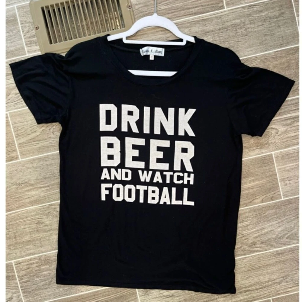 Football ladies here’s your shirt. Says drink beer and watch football. It’s black with white Writing. Short sleeve T-shirt. Excellent condition I think one once. Made by twine and stark. It is made in the USA. Size small. 96% rayon 4% cotton. Nothing wrong no flaws no tears no stains.It says it all: Drink Beer, Watch Football!