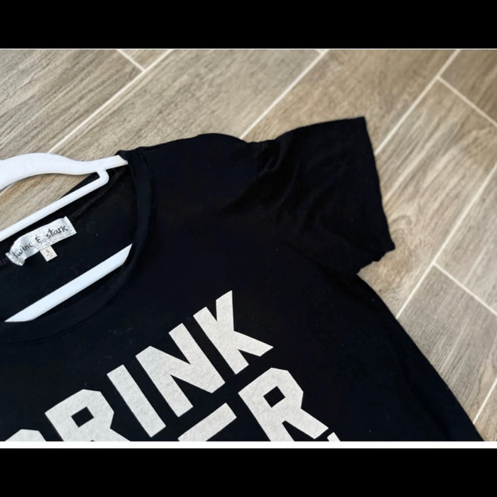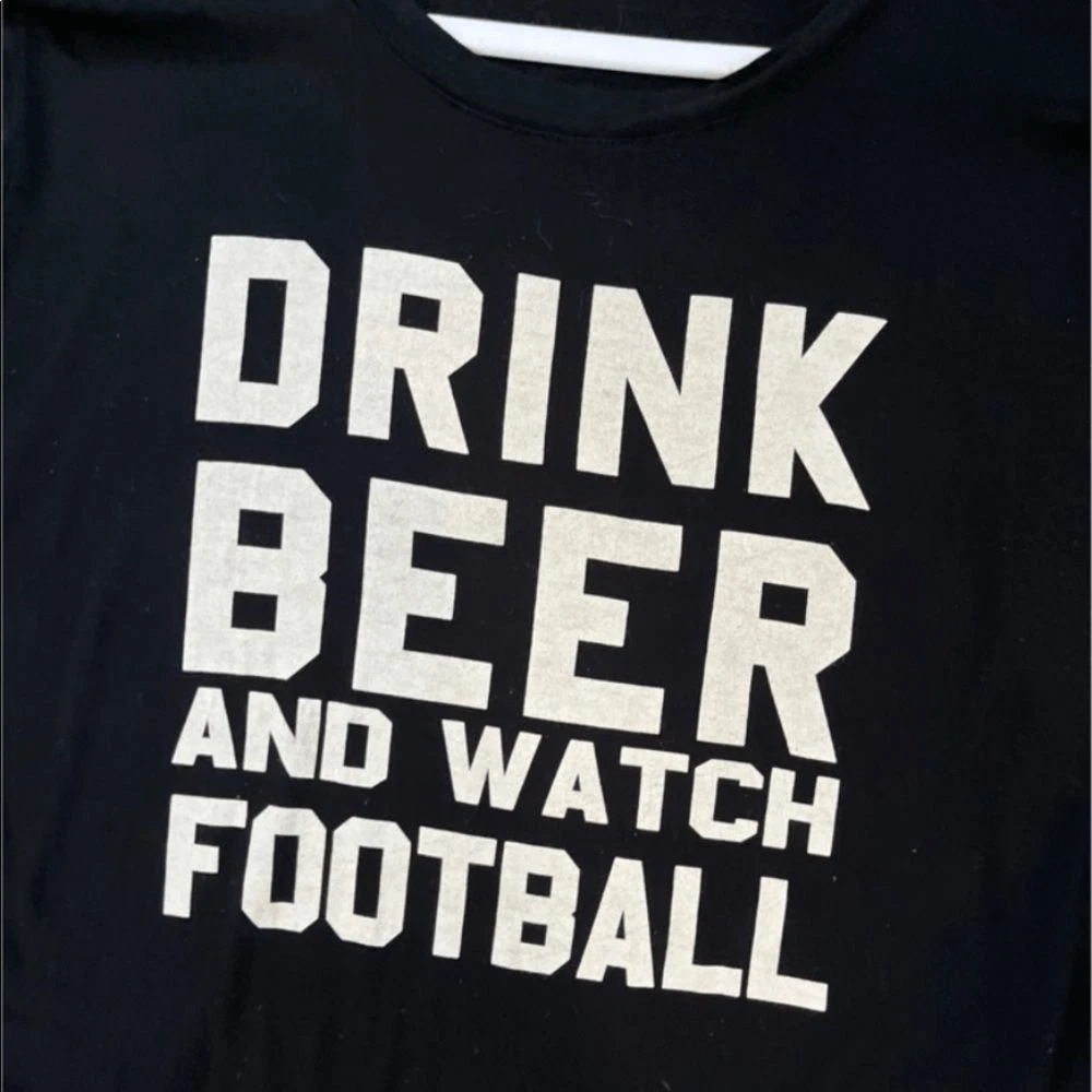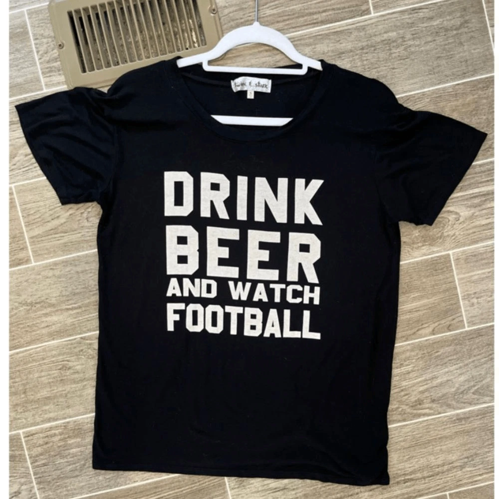 Football ladies here’s your shirt. Says drink beer and watch football. It’s black with white Writing. Short sleeve T-shirt. Excellent condition I think one once. Made by twine and stark. It is made in the USA. Size small. 96% rayon 4% cotton. Nothing wrong no flaws no tears no stains.It says it all: Drink Beer, Watch Football!