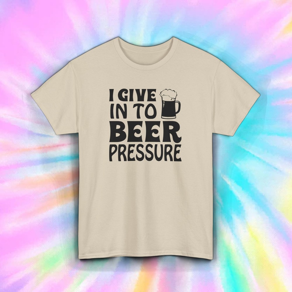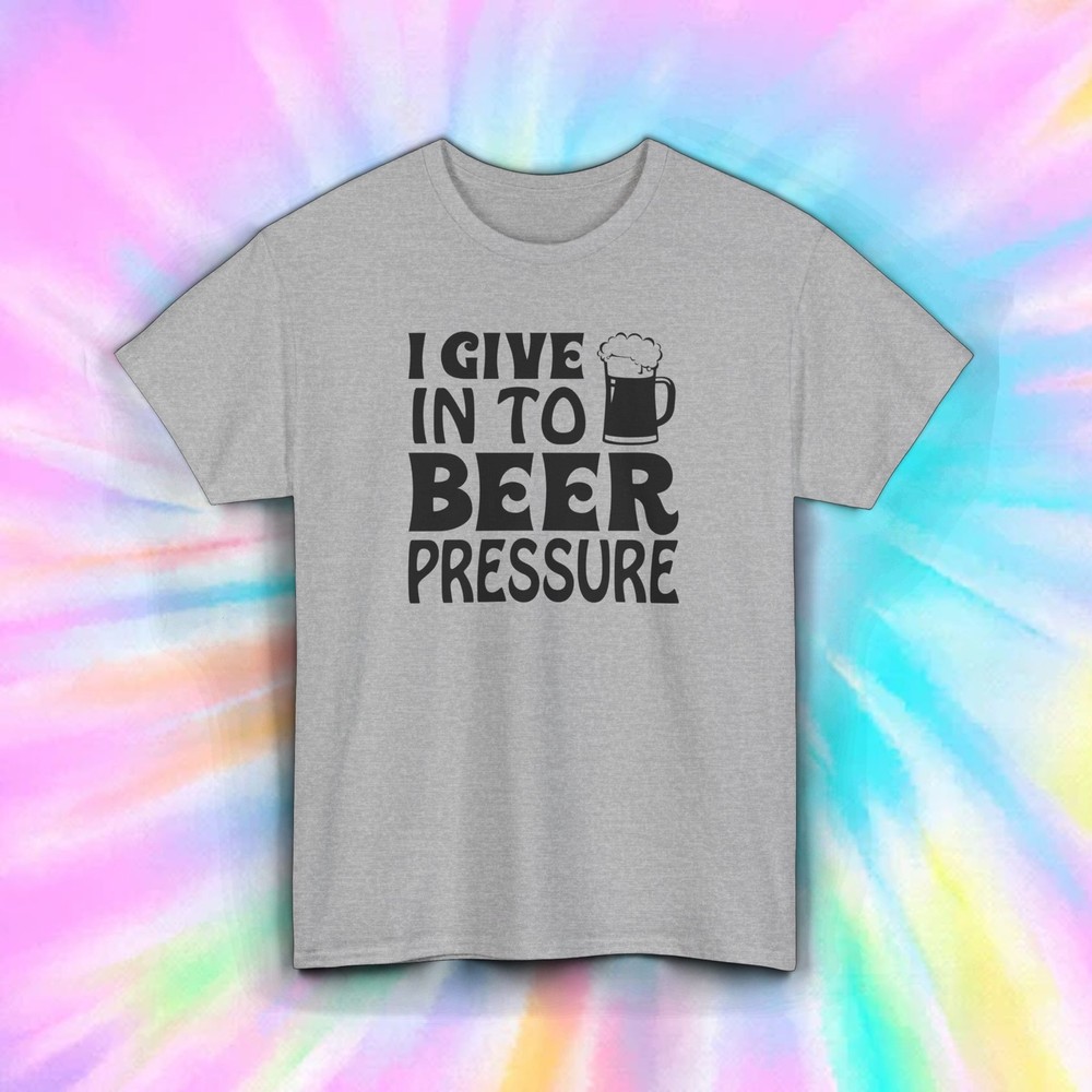 I Give in to Beer Pressure T-Shirt Embrace the fun side of life with our "I Give in to Beer Pressure" T-Shirt. Featuring a playful design with a frothy beer mug, this tee is perfect for anyone who loves a good drink and a good time. Features: Material: Made from 100% premium cotton for a soft and breathable feel. Fit: Unisex classic fit, true to size for comfortable wear. Design: Playful graphics with a frothy beer mug and a humorous message. Label: Tear-away label for easy customization and added comfort. Ideal For: Beer enthusiasts Casual wear Social events Shipping Details: Items are dispatched within 1-3 business days. Please note that holidays may extend this processing time, so we recommend ordering early. Enjoy free economy shipping on all orders! Expedited shipping options are available starting at $1. Returns Policy: We accept returns for items due to buyer's change of mind or errors; however, the buyer is responsible for the cost of return shipping. For defective items or those with issues, please provide documentation (photos or descriptions of the problem), and we will gladly offer a refund or replacement. Order your "I Give in to Beer Pressure" T-Shirt today and get ready for your next beer run!