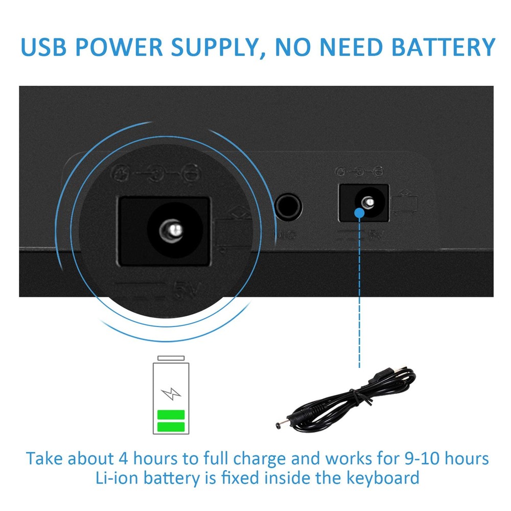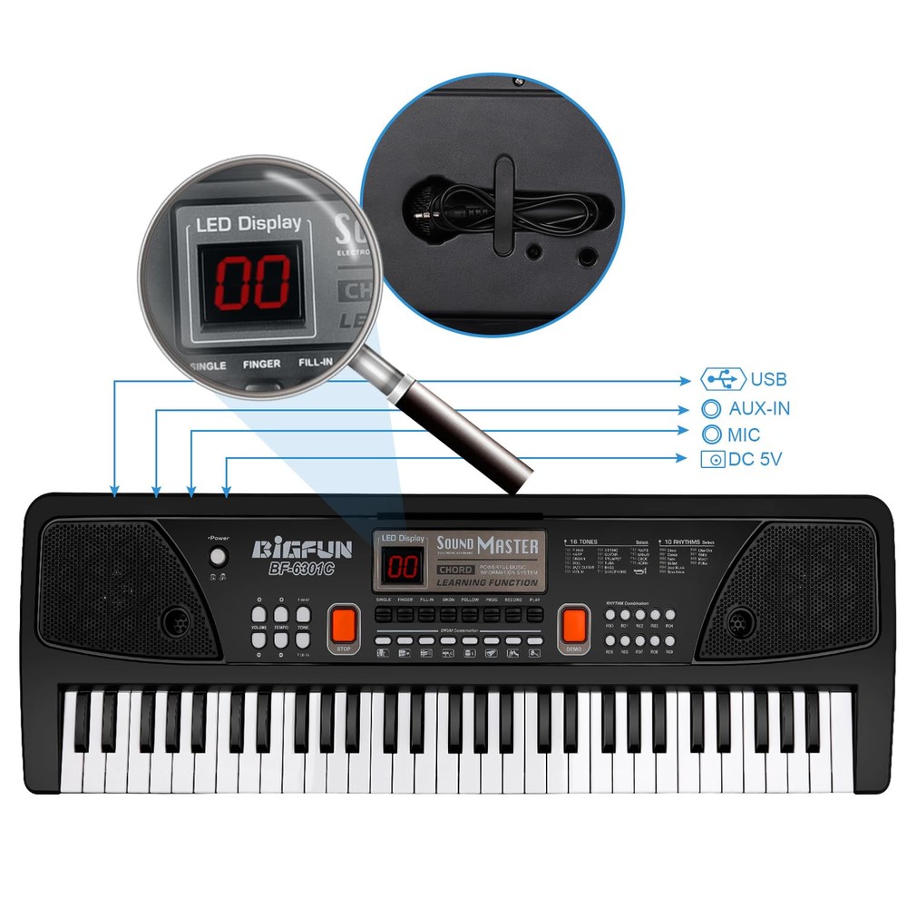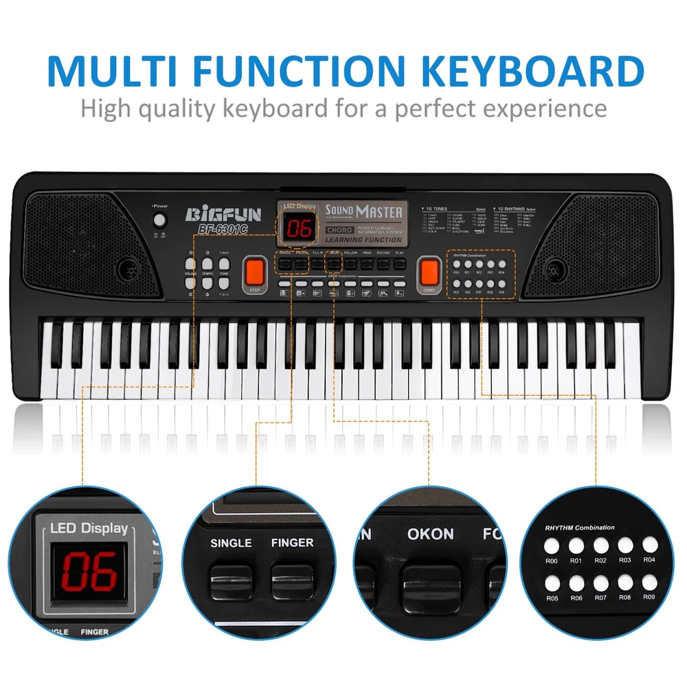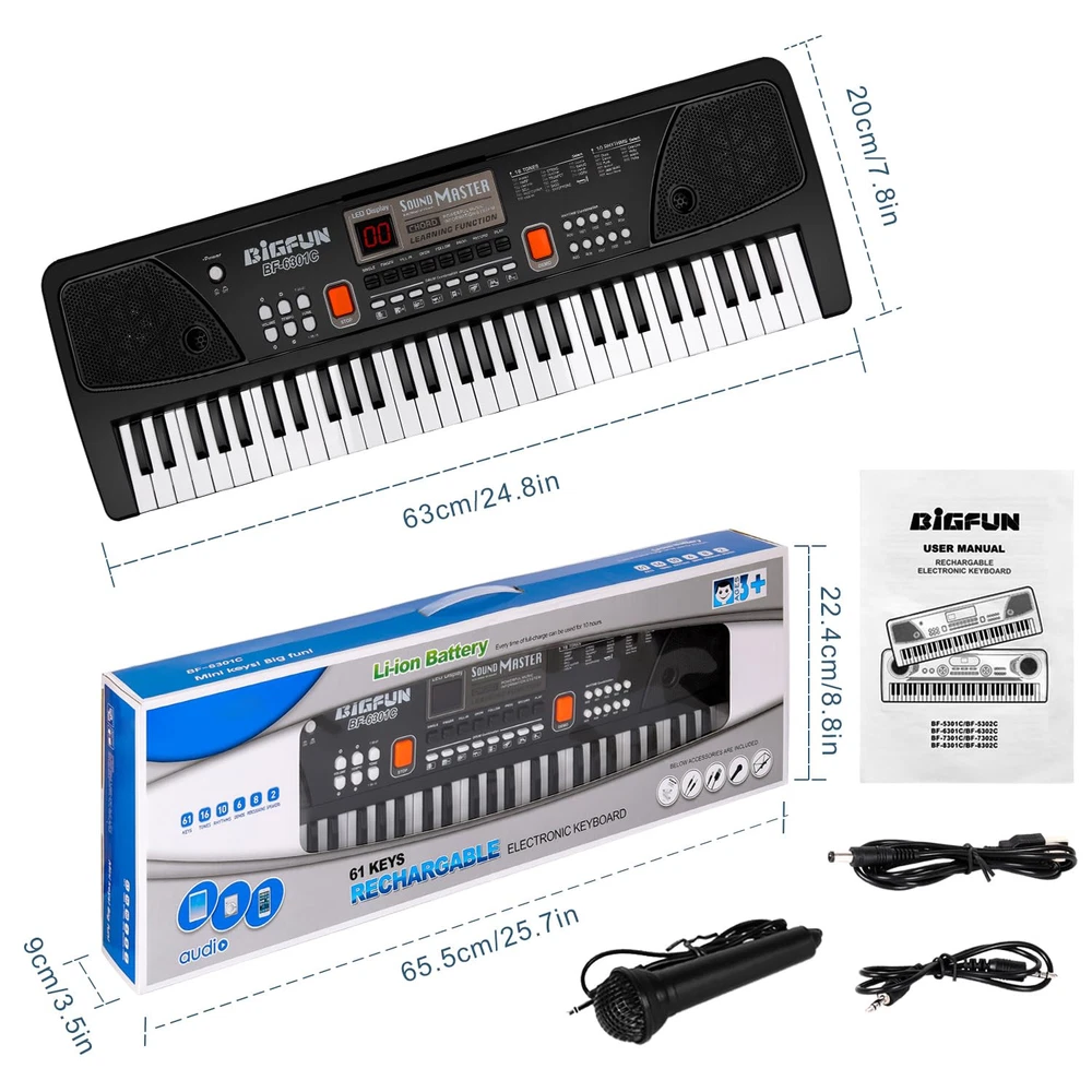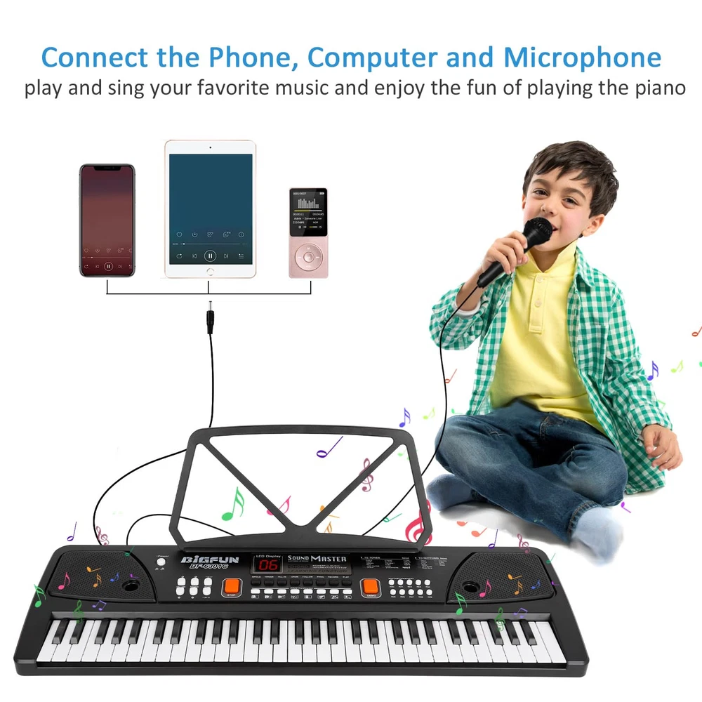 16 Tones & 10 Rhythms -- Piano for with microphone, LED screen, double speakers, record & playback function, 16 tones, 10 rhythms, 6 demos, 8 percussion kinds of melody. Demonstration songs help beginners imitate and learn quickly, a perfect early educational electronic piano. Chord / OKON & AUX-IN Jack -- Keyboard piano left 1-20 keys chord design, after press PR0-9 and SINGLE/ FINGER button. Playing background music after press OKON button, can play any keys which will be and correct as the demos. Children piano with AUX-IN Jack, you can connect / computer to play music. USB / Battery Powered -- Electronic keyboard built-in battery and can be charged by USB cable. No need to plug the battery, it will be more environmental, and also easy to carry, can be played indoor or outdoor. piano toy made of ABS material, sturdy and non-. Fine workmanship and smooth edge design, safe for . Inspire Musical Talent -- piano with music stand, you can put music book on it, and then practice songs. It is convenient for beginners to practice and learn. Different kinds of melody can bring a different teaching mode, a wonderful piano keyboard to develop kid's brain awareness and cultivate their musical talents. Best Gift For 3-12 Years Old -- piano toy with microphone(behind the piano keyboard), can sing while playing, it help develop kid's performance skills and make them more confident. keyboard piano is perfect for boys girls ages 3/4/5/6/7/8/9/10/11/12, the best gifts for birthdays, Christmas, New Year’s Day or other festival.