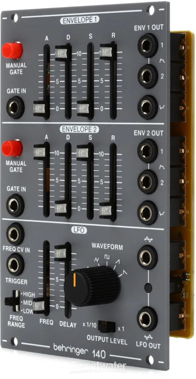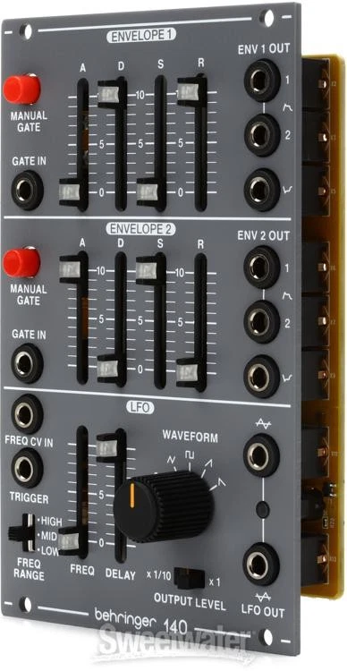 Shape the Sound that Defined a Decade With a design inspired by a 1980s modular classic, the Behringer System 100 generates the dreamy, fat synth tones that defined a decade — sounds that now permeate modern Synthwave and Retro Electro and have found their way into contemporary Pop, Hip Hop, and Indie. The Behringer 140 Dual Envelope/LFO is an authentic reproduction of the original unit, designed for Eurorack, with two independent ADSR sections and an LFO featuring five selectable waveshapes and a separate inverted output. The envelopes each have standard external gate control, but they also include a manual gate button, which comes in handy when you’re auditioning sounds. Synthesists at Sweetwater have fallen deep down the Eurorack rabbit hole, and we realize that exploring Eurorack can seem like a confusing and costly undertaking. However, the Behringer System 100 modules, including the Behringer 140 Dual Envelope/LFO, are an affordable and Sweetwater is an Authorized Behringer Dealer Genuine New Item Sweetwater's 2-year warranty* Behringer 140 Dual Envelope/LFO Eurorack Module 16HP Eurorack Dual Envelope Generator and LFO Module Shape the Sound that Defined a Decade With a design inspired by a 1980s modular classic, the Behringer System 100 generates the dreamy, fat synth tones that defined a decade — sounds that now permeate modern Synthwave and Retro Electro and have found their way into contemporary Pop, Hip Hop, and Indie. The Behringer 140 Dual Envelope/LFO is an authentic reproduction of the original unit, designed for Eurorack, with two independent ADSR sections and an LFO featuring five selectable waveshapes and a separate inverted output. The envelopes each have standard external gate control, but they also include a manual gate button, which comes in handy when you’re auditioning sounds. Synthesists at Sweetwater have fallen deep down the Eurorack rabbit hole, and we realize that exploring Eurorack can seem like a confusing and costly undertaking. However, the Behringer System 100 modules, including the Behringer 140 Dual Envelope/LFO, are an affordable and effortless way to venture into the world of Eurorack and achieve the kind of luscious synth tones even the most discerning synthesists will love! Behringer 140 Dual Envelope/LFO Eurorack Features: Authentic reproduction of a classic 1980s envelope generator and LFO Two independent ADSR envelopes with external gate control and manual gate trigger button LFO with five selectable waveshapes: sine, triangle, square, ramp, and saw tooth Frequency range slider with switchable HIGH/MID/LOW frequency ranges Delay slider along with an external trigger switch lets you phase lock the LFO to a keyboard Two LFO outputs: standard and inverted 16HP Eurorack module Specification Detail Type Dual Envelope & LFO Eurorack Module HP Size 16HP Power Supply Requires Eurorack case and power supply RETURN INFORMATION We want you to be completely happy with your purchase from Sweetwater. If you are not satisfied with your product, you may return it for a refund of the purchase price within 30 days. If your purchase was eligible for Free Shipping, the shipping cost will be deducted from your credit or refund. Returns must be in the complete and original packaging with all accessories and complete documentation (Owner's Manual, warranty card, quick start guides, etc.), show no signs of wear or use, and include a Return Authorization number or be subject to a restocking fee. Fast, FREE Shipping! Nearly every order received by 3PM Eastern ships the SAME DAY! FREE shipping to lower 48 states. Our central location reaches most states in 1-4 business days 99.95% warehouse accuracy We are proud to provide some of the fastest turnaround times on eBay. We use FedEx or UPS for most items, and USPS for smaller items. Residents of Hawaii, Alaska, and Puerto Rico should contact us for a shipping quote. PLEASE NOTE: We cannot ship large items to PO boxes, please provide an alternate address. If you have questions, feel free to contact us. Buy with confidence! Sweetwater's been selling on eBay since 2001, with 99.9% positive feedback! More than 30 years in business World-class customer service Fast, FREE shipping Free 2-year warranty on nearly every product* Free tech support from audio experts *Please reach out for warranty information