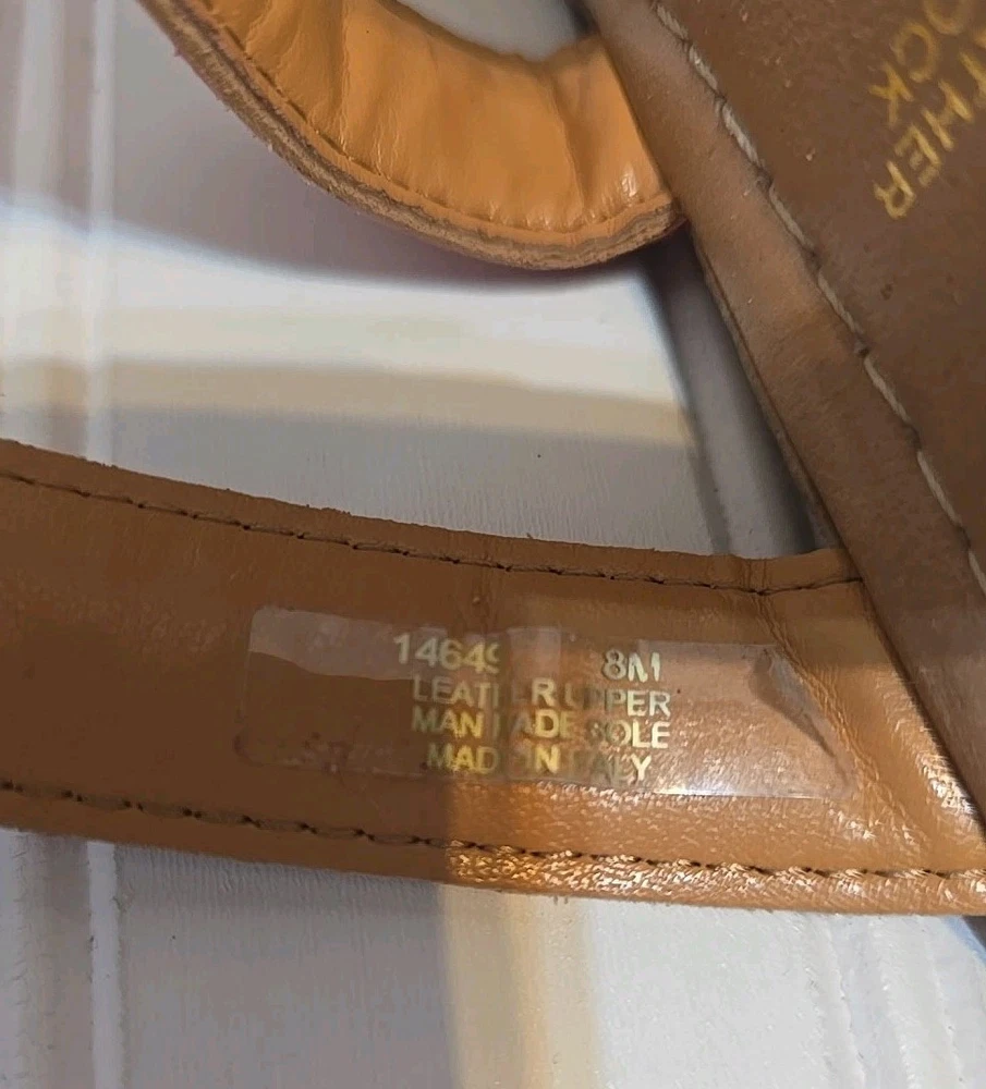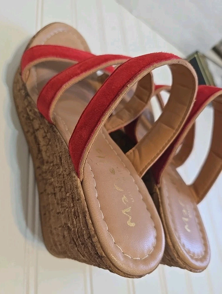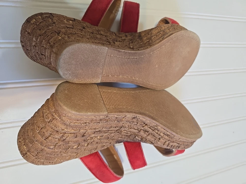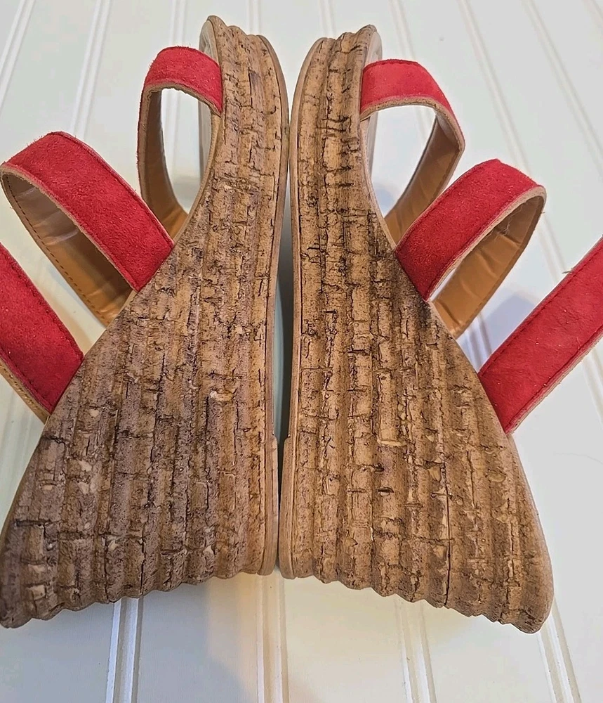 1. These wedge sandals are so stylish and comfortable! The beige color goes with everything, and the red straps add a fun pop of color. Even though they're pre-owned, they're still in great shape—no major wear, just broken in for extra comfort. Perfect for summer outings or casual errands. Love the easy slip-on design!