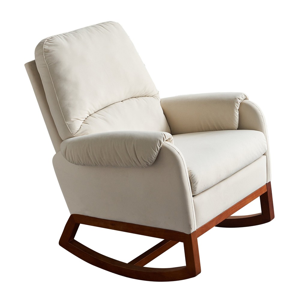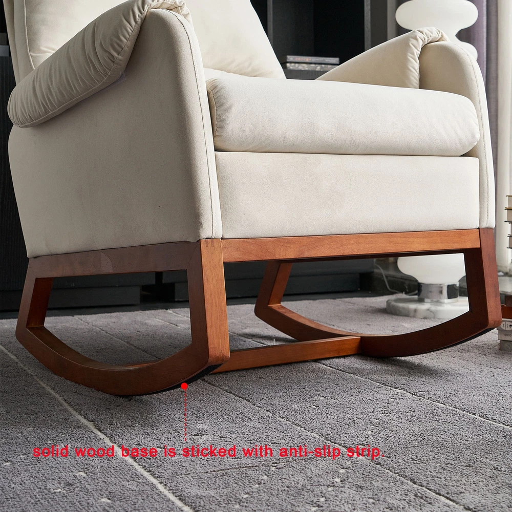 Specifications Place of Origin China Main Color Beige Main Material Velvet Filler Foam Use Case Primary Living Space Chair Type Rocking Chairs Pattern Solid Chair Back Style Solid Back Chair Fill Material Foam Chair Included Components Arm Pad Chair Care Instructions Spot Clean Dangerous Goods #dangerFlag# Dimensions & Weights Assembled Length (in.) 31.50 Assembled Width (in.) 33.46 Assembled Height (in.) 39.76 Weight (lbs) 57.32 Product Features Not only suitable for the elderly to sit on a chair to read the newspaper or watch tv, but also very suitable for the mother to sit on the chair to coax the baby to sleep. Comfortable rocking chair for fun rocking back and forth, the swing chair can bring a soothing effect to people. Sturdy & Durable Wood Chair Base The entire frame is made of solid wood which is sturdy enough to support up to 300lbs and provides powerful support so that you can sit without any worry. Moreover, the tufted feet pads on the bottom can protect your floor from any scratches. This rocking chair is concise in design and can be installed smoothly according to detailed instructions. All hardware and parts are included, and assembly steps are shown in picture forms for reference. Description Description Upholstered Rocking Chair Comfortable Living Room Rocker Lounge Armchair with Solid Wood Base Hig