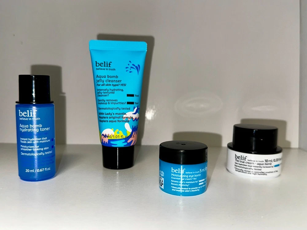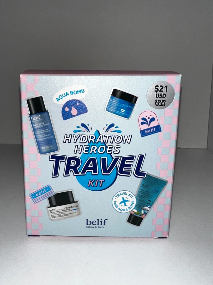 Four-piece Travel Kit of new and cult-favorite belif heroes to increase the skin's hydration levels for a natural glow. Featuring a full-size Aqua bomb jelly cleanser and three deluxe-sized minis. For normal, combination, and oily skin types. This set includes a full routine that delivers an explosion of weightless hydration to dull, depleted skin for a radiant-looking glow. Four-Piece Set Includes: Aqua Bomb Jelly Cleanser: A jelly-textured cleanser that gently washes away makeup and impurities for a cleaner, smoother-looking complexion. Glycerin-based, gentle cleansing agents also help hydrate and clean the skin without stripping moisture. Aqua Bomb Hydrating Toner: A lightweight toner that provides an instant splash of hydration to help nurture skin for a healthy-looking glow. Moisturizing Eye Bomb: A silky, lightweight daily eye cream that floods fine lines and wrinkles with 26 hours of moisture for younger-looking eyes. An essential for smoother makeup application! True Cream - Aqua Bomb: Seal the moisture with aqua bomb! A lightweight gel-cream formulated to burst on contact with the skin for an explosion of lightweight hydration. Instantly boost hydration levels by 70% for a smooth, supple appearance (Based on clinical studies). The weightless formula absorbs quickly while giving the skin a smoother glowing appearance, acting as a perfect primer for makeup. Sizes: Aqua Bomb Jelly Cleanser, 1 oz / 30 ml Aqua Bomb Hydrating Toner, 0.67 oz / 20 ml Moisturizing Eye Bomb, 0.17 oz / 5 ml True Cream-Aqua Bomb, 0.33 oz / 10 ml