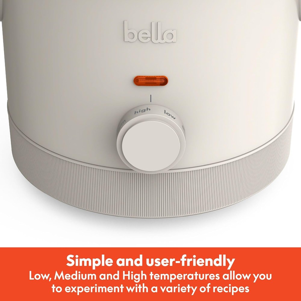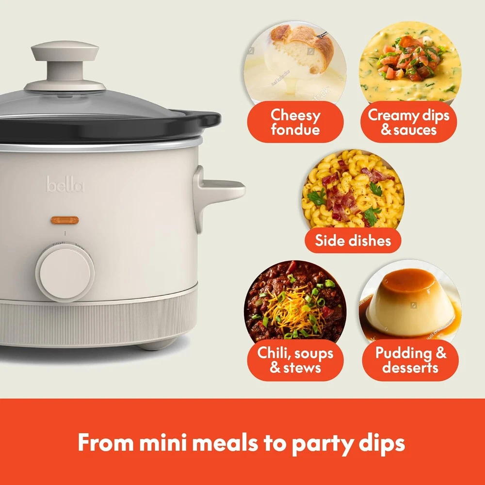 bella 1.5 Qt Slow Cooker with 3 Heat Manual Control, Quarts, Oatmilk Product Details Brand: BELLA Color: Oatmilk Material: Stoneware, Glass, Plastic Product Dimensions: 7.99"D x 9.56"W x 7.55"H Capacity: 1.5 Quarts Wattage: 110 watts Item Weight: 4.18 Pounds Is Dishwasher Safe: No Voltage: 110 Pattern: Solid Control Method: Touch Control Type: Knob Number of settings: 3 Item Depth: 7.99 inches Controller Type: dial knob Size: 1.5 Quarts Manufacture Year: 2024 Item Weight: 4.18 pounds Manufacturer: BELLA Country of Origin: China Item model number: 35119-016A Perfect Size for Two: With a 1.5qt capacity, this slow cooker is just right for cooking for two or making your favorite dips, nachos, and sauces. Compact yet versatile, it's the perfect kitchen companion for cozy dinners or party-ready appetizers Smart Coating for Easy Cleanup: Enjoy mess-free cooking with our EverGood Ceramic Nonstick Coating, free from PFAS, PFOA, PTFE, lead, and cadmium. The surface of this electric cooking pot ensures easy food release, quick cleanup, and fun for all Three Heat Settings for Perfect Results: Choose from low, medium, or high temperature settings to prepare your meals to perfection. Whether you're simmering sauces or melting chocolate, this mini pressure cooker will help you create culinary wonders Safe & Durable Design: The shatter-resistant glass lid lets you keep an eye on your food while it cooks, and the cool-touch handles ensure safe handling. Non-skid feet keep the crock pot slow cooker stable on your countertop, adding peace of mind Effortless Storage & Cleanup: With a clutter-free cord wrap, this mini portable cooker stays neat on your countertop. The dishwasher-safe stoneware pot and tempered glass lid make cleanup as simple as cooking, so you can focus on enjoying your meal Add a touch of charm to your kitchen with the bella 1.5qt Slow Cooker, designed for those intimate, cozy dinners and small gatherings that mean the most. Perfectly sized for two, this mini instant pot is your go-to for a wide variety of slow-cooked recipes—from hearty stews and tender roasts to decadent chocolate fondue and zesty queso dips. With easy-to-use manual controls and three heat settings—low, high, and warm—you can slow cook your meals to perfection, making every bite a moment to portable crock pot isn’t just functional; it’s a delightful addition to any kitchen decor. Available in four brand new bella colors—Oatmilk, Surf, Blossom, and Plum—it adds a fun pop of personality to your countertop. It’s also a wonderful gift idea for every occasion, from house warmings to weddings, making it a thoughtful and stylish present. The dishwasher-safe stoneware pot and tempered glass lid make cleaning up the mini slow cooker a breeze, and the cord wrap feature ensures a clutter-free experience, keeping your kitchen tidy and organized. Whether you're simmering soups, crafting comfort food, or creating sweet treats, this electric cooker is your key to culinary creativity.