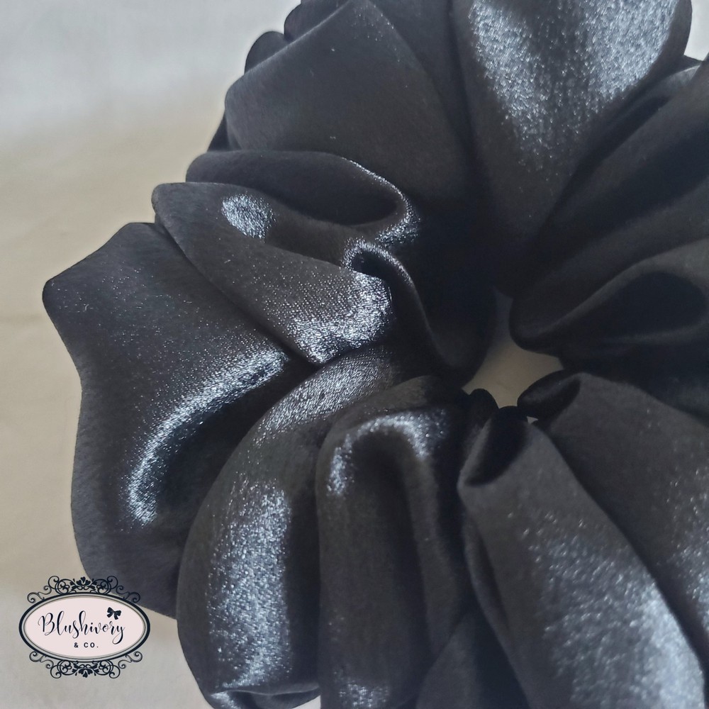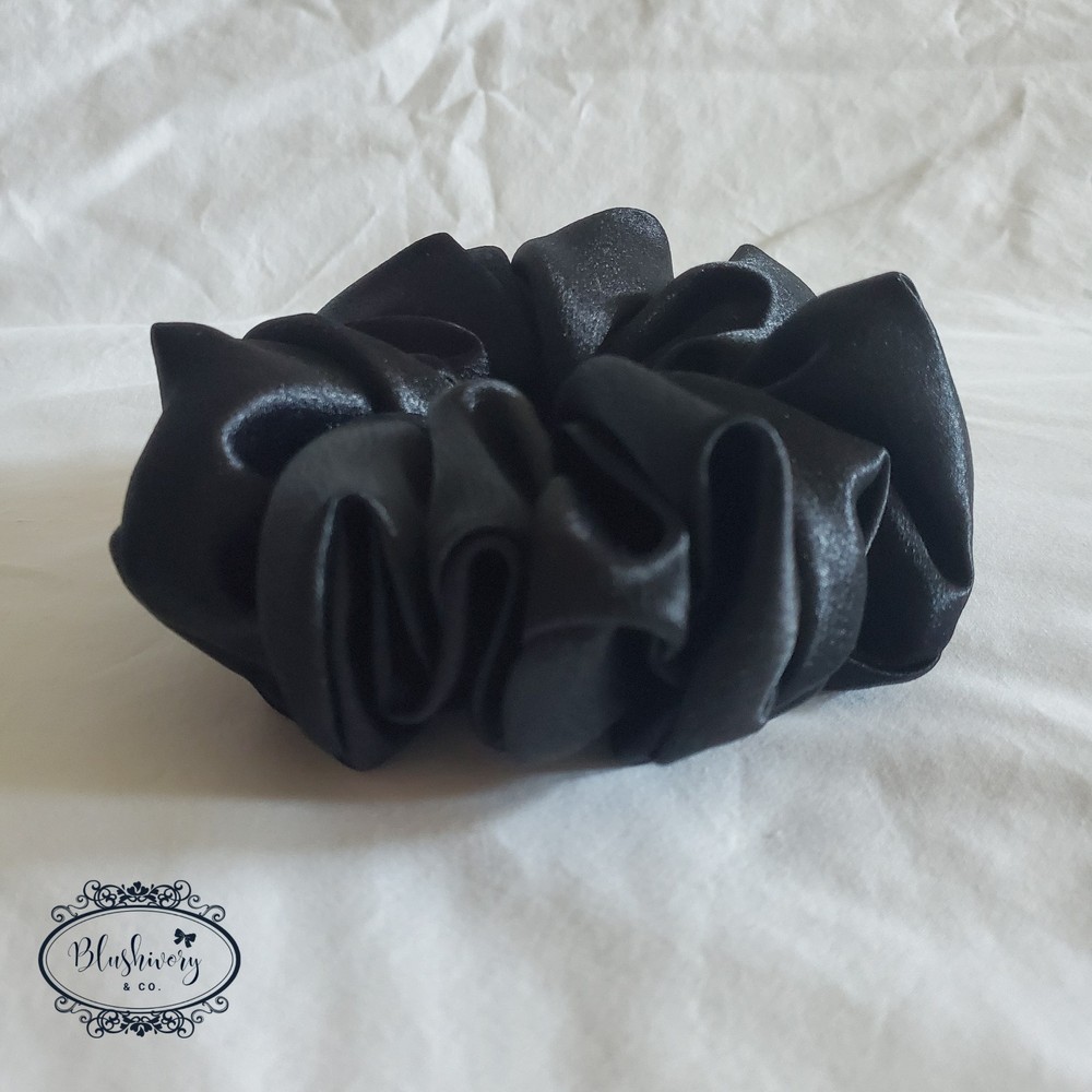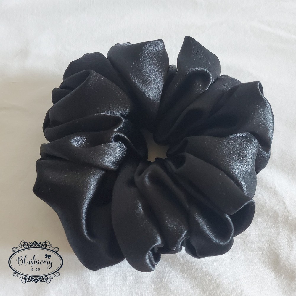 Bella Scrunchie -Size: Deluxe -Color/pattern: Black, solid -Luxe satin, polyester. -Machine wash, delicate cycle. And or hand wash. -New handmade. -Washington USA *Package include: 1pc. Bella Scrunchie, Deluxe size hair tie. ------------------ [scdlx-stn-062]