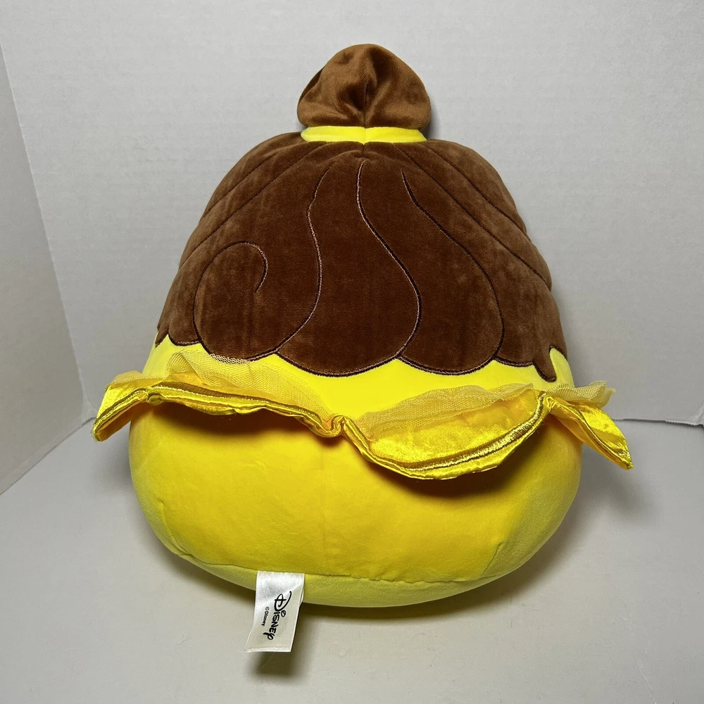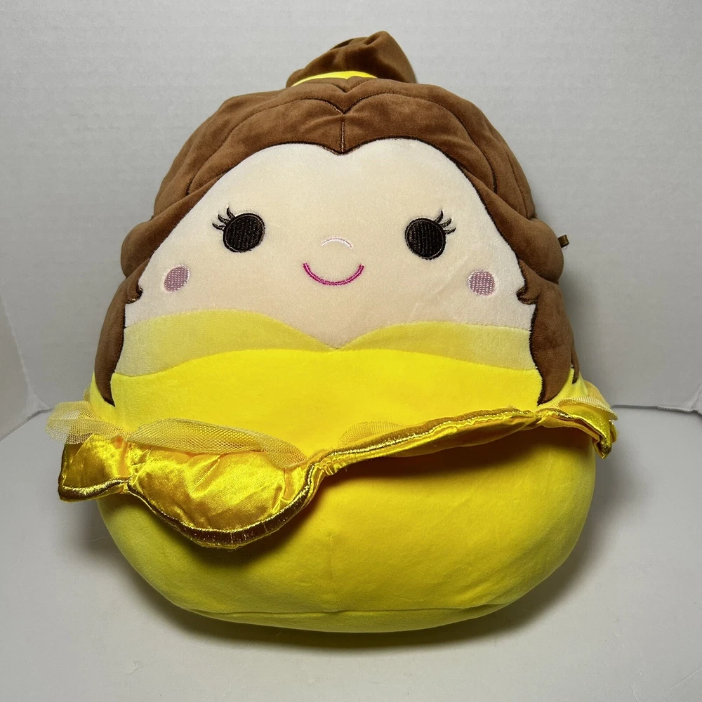 This is a 16-inch Belle Squishmallow plush toy from the Disney Princess character family. The plush is in a yellow color and features Belle from Beauty and the Beast. It is recommended for ages 4 and up, is washable, and has been retired, making it a collectible item. Perfect for fans of Disney Princesses and those who enjoy soft and huggable toys.