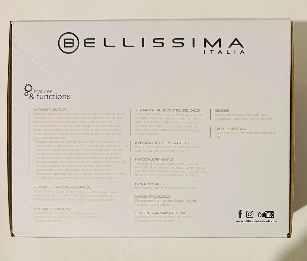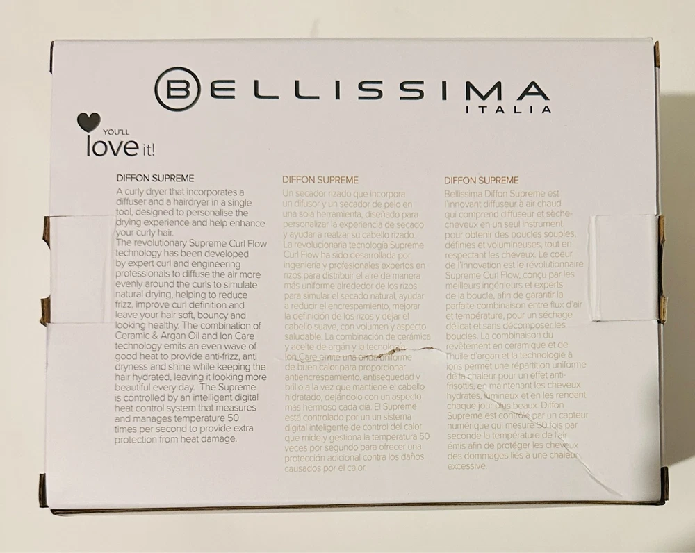 Bellissima Diffon Supreme Diffuser & Curly Hair Dryer - XL Diffuser for Long Waves, Curls, Coils - Cool Button - Anti-Frizz Technology. Note: The box has been opened and box shows minor storage wear (see photos), but the item is unused/new and in excellent condition in its original packaging. Please check out my other listings, I list new items daily. Thank you!