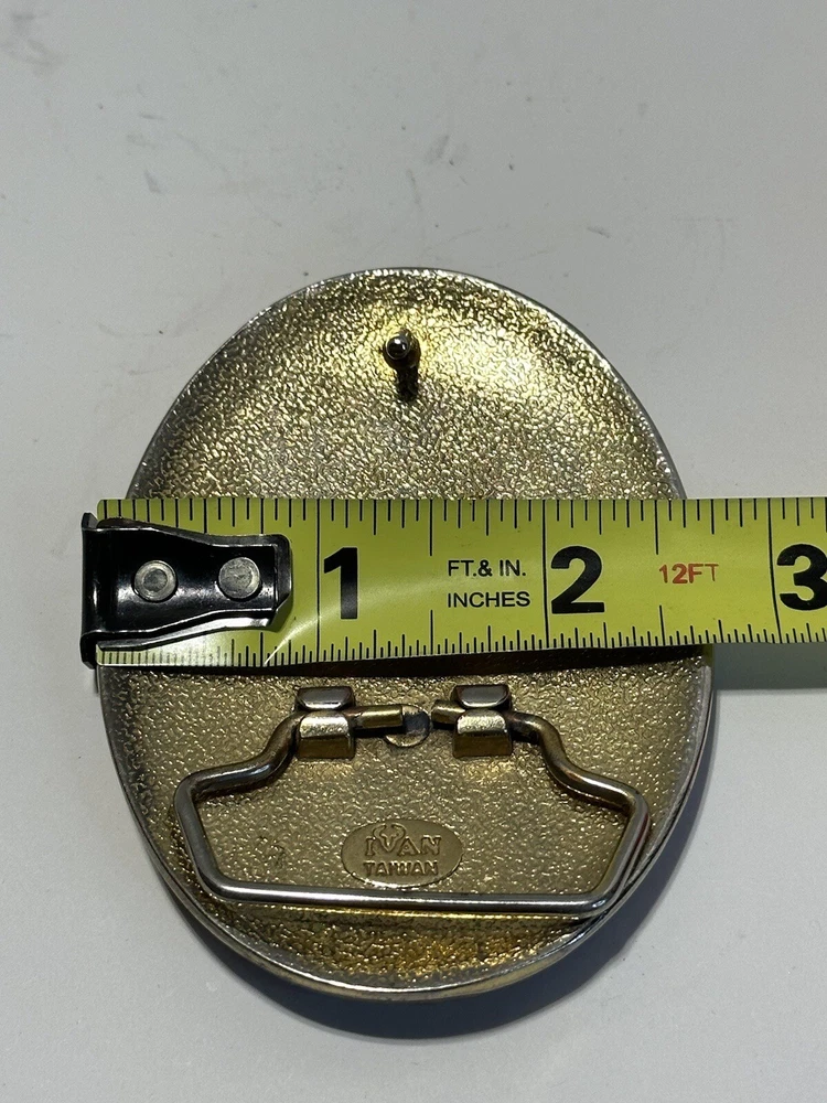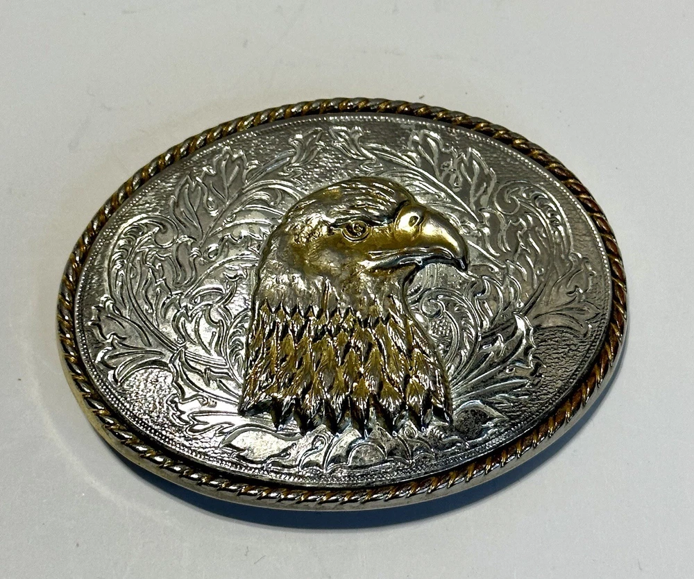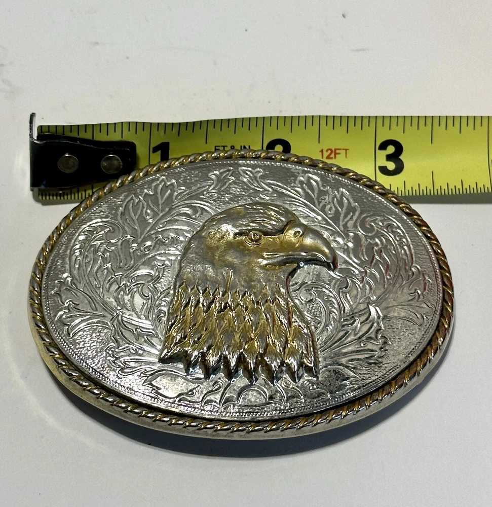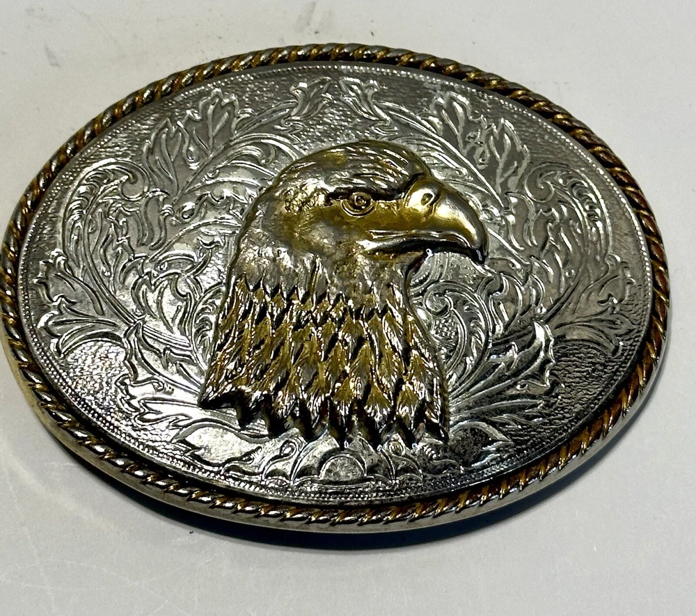 Belt Buckle fits 1 1/2 belt. This is a unique buckle with the American Bald Eagle in two-tone gold and silver. Made in Taiwan by Ivan. Ships quick with care. Thanks for looking. Offers welcome.