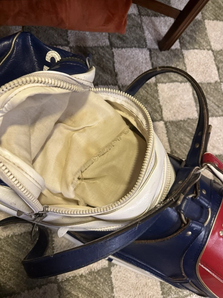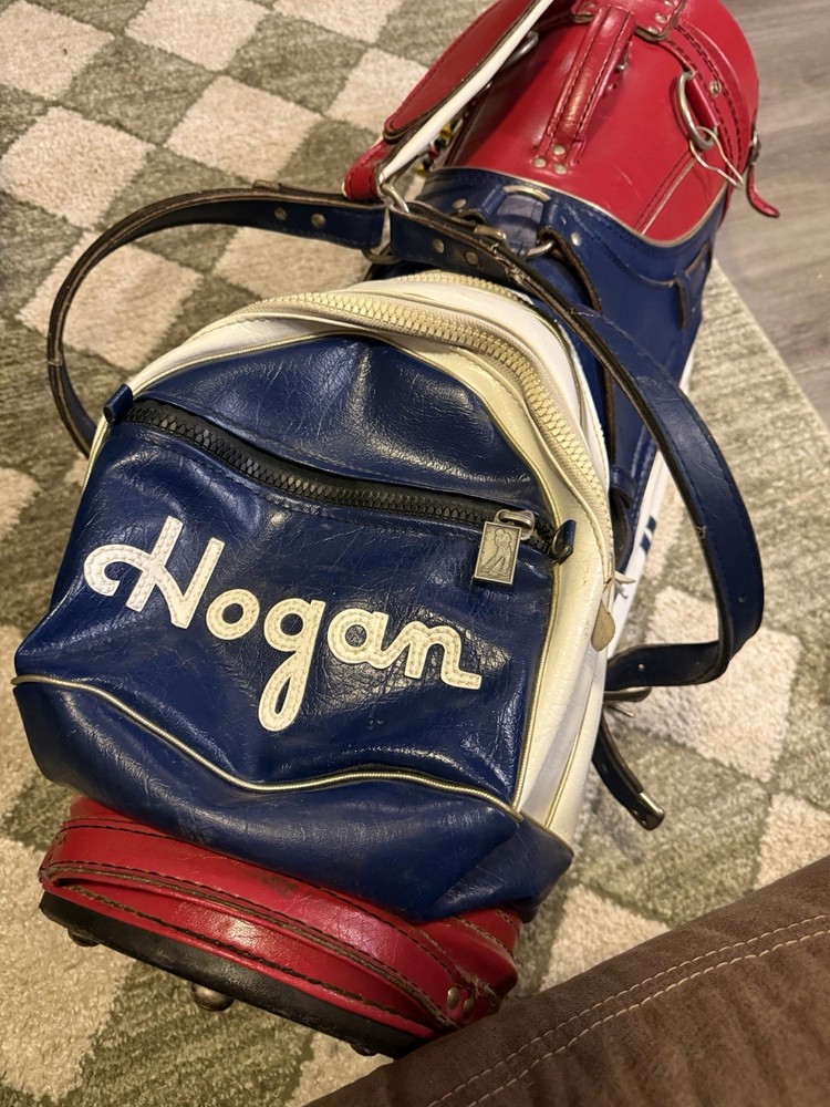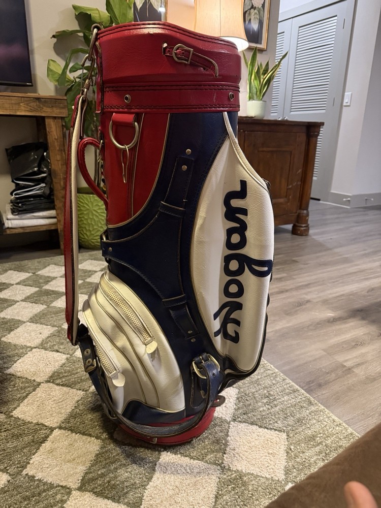 The Ben Hogan Vintage Leather Golf Club Bag in Red, White, and Blue is a stylish and functional carry bag perfect for any golfer. Made of high-quality leather, this large bag features a 3-way divider system, multiple pockets, including an umbrella holder and a water-resistant rain cover. The zip closure, padded shoulder strap, and carry handle make it convenient for transportation on the golf course. The patriotic color scheme and vintage design make this bag a timeless choice for any golfer looking to add some style to their game.