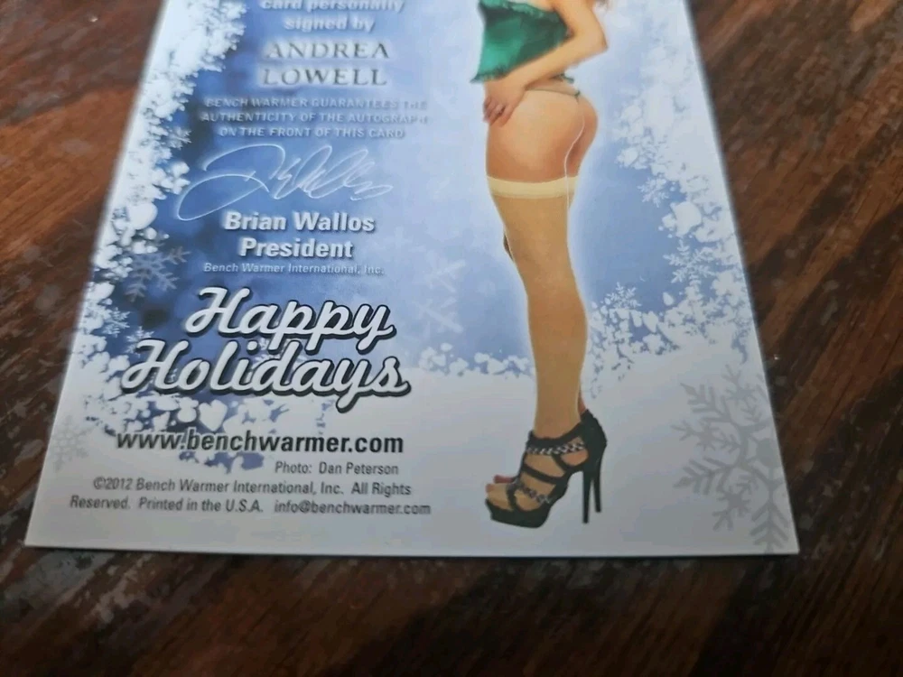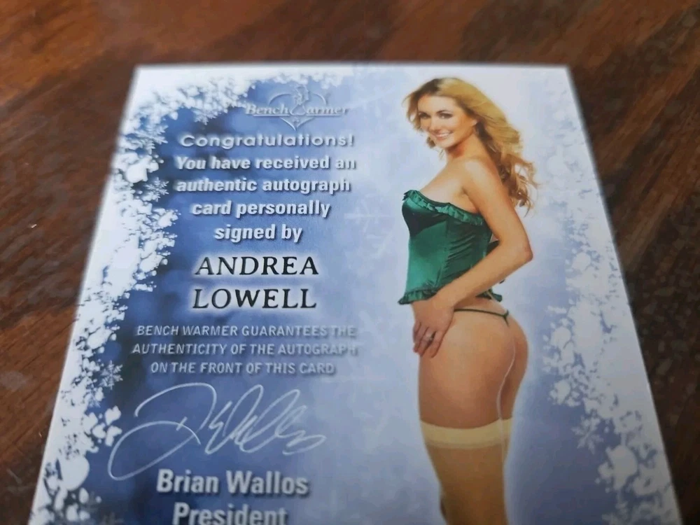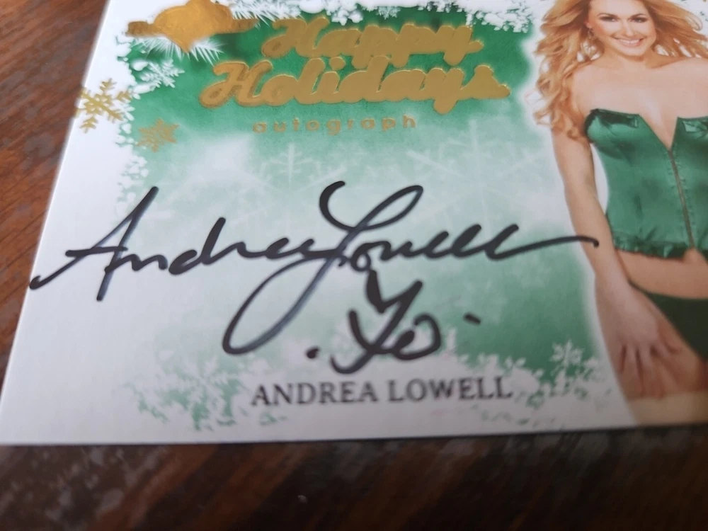Benchwarmer 2012 Andrea Lowell Happy Holidays Autograph Gold Foil Card Auto Playboy Andrea Lowell is a model, host and actress from Long Beach, California. She has done everything from modeling, commercials and feature films. She is most known for her work with Playboy and Playboy TV... and notably from her gig as a cast member of "The Surreal Life" (2003)_. Andrea is a member, in good standing, of both SAG and AFTRA. Her talents include teleprompter, most dance forms, interviewing, public speaking, most athletics, acting, modeling, and having an enthusiasm for food and wine. Please, look at all the pictures. Please check out my other eBay accounts... https://www.ebay.com/usr/kimmyrael https://www.ebay.com/usr/matlac99 https://www.ebay.com/usr/lacr6837 https://www.ebay.com/usr/malac9440 https://www.ebay.com/usr/lacr_3567 https://www.ebay.com/usr/lacroki8 https://www.ebay.com/usr/lacroki9 Shipping only to the continental US unless you contact me first. Will combine shipping!!!